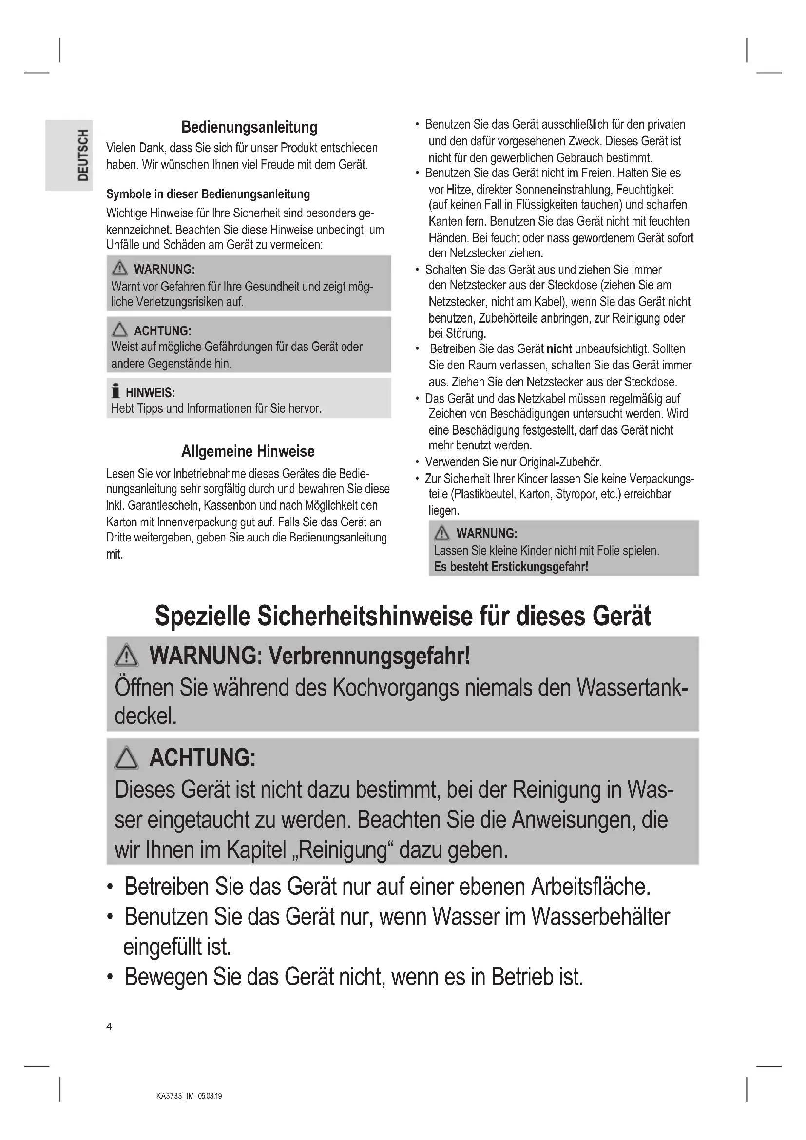 Übersicht der Bedienelemente Overzicht van de bedieningselementen • Liste des différents éléments de commande Indicación de los elementos de manejo • Elementi di comando • Overview of the Components Przegląd elementów obsługi • A kezelőelemek áttekintése Обзор деталей прибора •4 KA3733_IM 05.03.19 Bedienungsanleitung Vielen Dank, dass Sie sich für unser Produkt entschieden haben. Wir wünschen Ihnen viel Freude mit dem Gerät. Symbole in dieser Bedienungsanleitung Wichtige Hinweise für Ihre Sicherheit sind besonders ge- kennzeichnet. Beachten Sie diese Hinweise unbedingt, um Unfälle und Schäden am Gerät zu vermeiden: WARNUNG: Warnt vor Gefahren für Ihre Gesundheit und zeigt mög- liche Verletzungsrisiken auf. ACHTUNG: Weist auf mögliche Gefährdungen für das Gerät oder andere Gegenstände hin. HINWEIS: Hebt Tipps und Informationen für Sie hervor. Allgemeine Hinweise Lesen Sie vor Inbetriebnahme dieses Gerätes die Bedie- nungsanleitung sehr sorgfältig durch und bewahren Sie diese inkl. Garantieschein, Kassenbon und nach Möglichkeit den Karton mit Innenverpackung gut auf. Falls Sie das Gerät an Dritte weitergeben, geben Sie auch die Bedienungsanleitung mit.