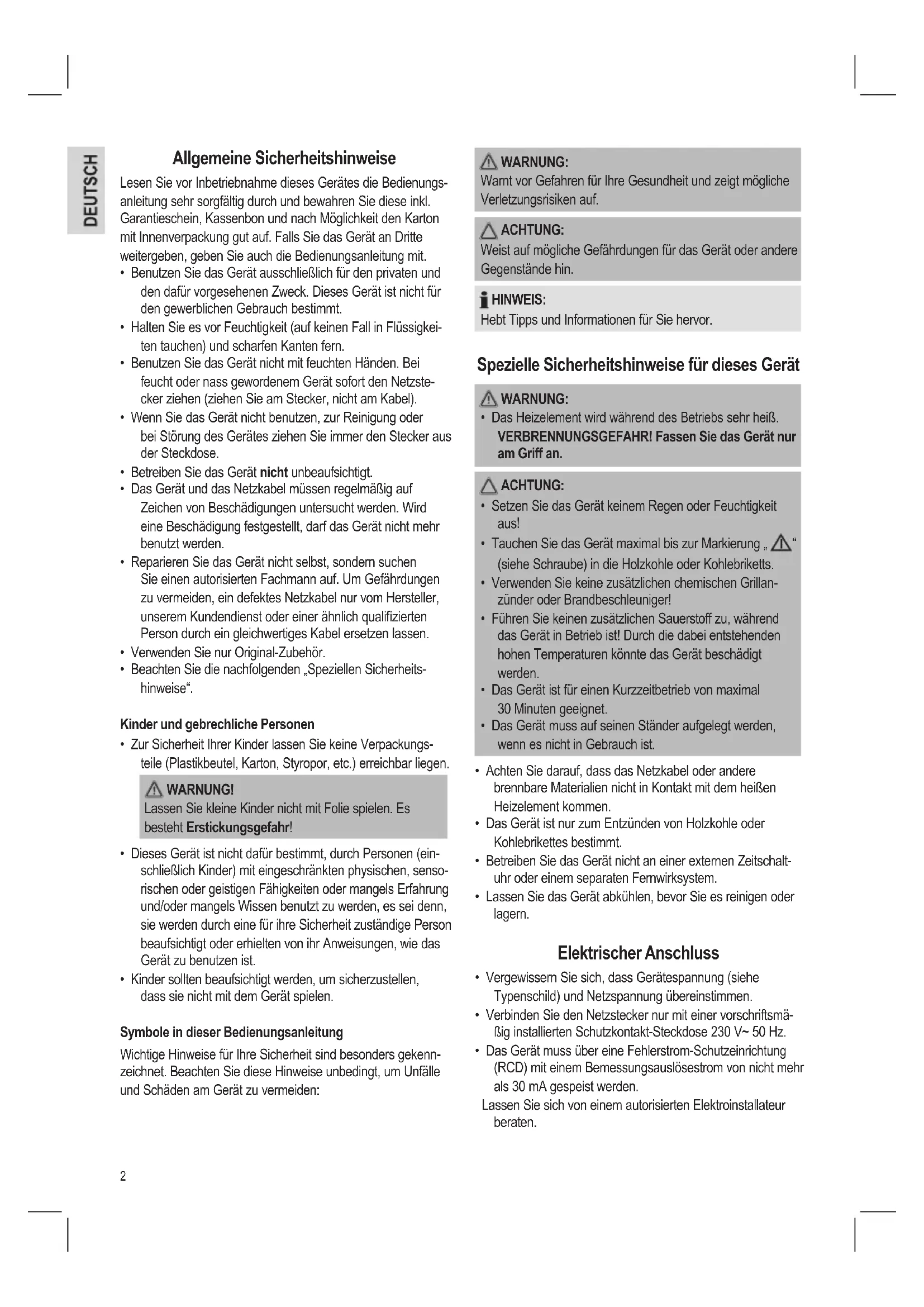 - Das Gerät ist nur zum Entzünden von Holzkohle oder Kohlebrikettes bestimmt.