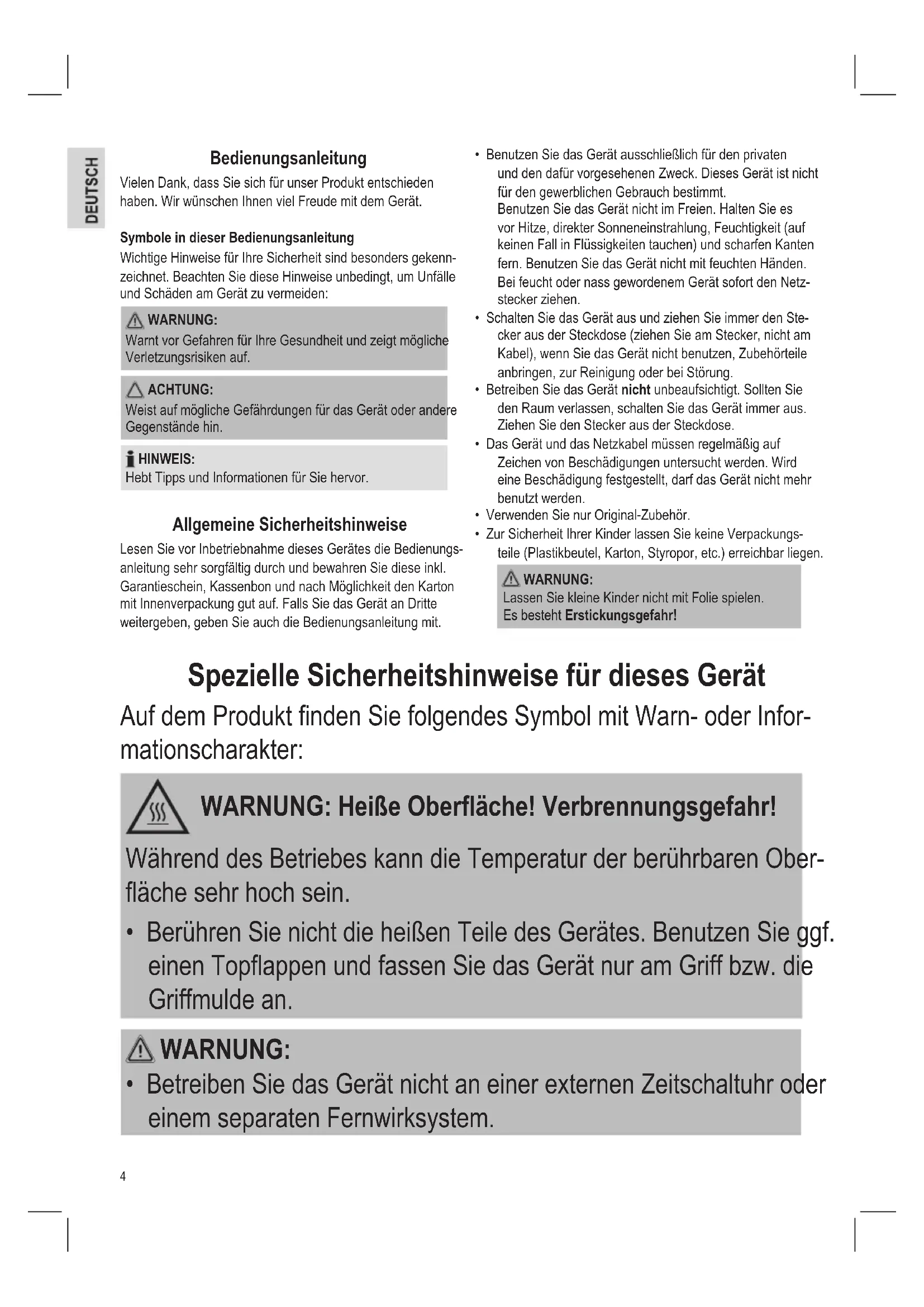 - Zur Sicherheit Ihrer Kinder lassen Sie keine Verpackungs- teile (Plastikbeutel, Karton, Styropor, etc.) erreichbar liegen. WARNUNG: Lassen Sie kleine Kinder nicht mit Folie spielen. Es besteht Erstickungsgefahr! Spezielle Sicherheitshinweise für dieses Gerät Auf dem Produkt nden Sie folgendes Symbol mit Warn- oder Infor- mationscharakter: WARNUNG: Heiße Oberäche! Verbrennungsgefahr! Während des Betriebes kann die Temperatur der berührbaren Ober- äche sehr hoch sein.