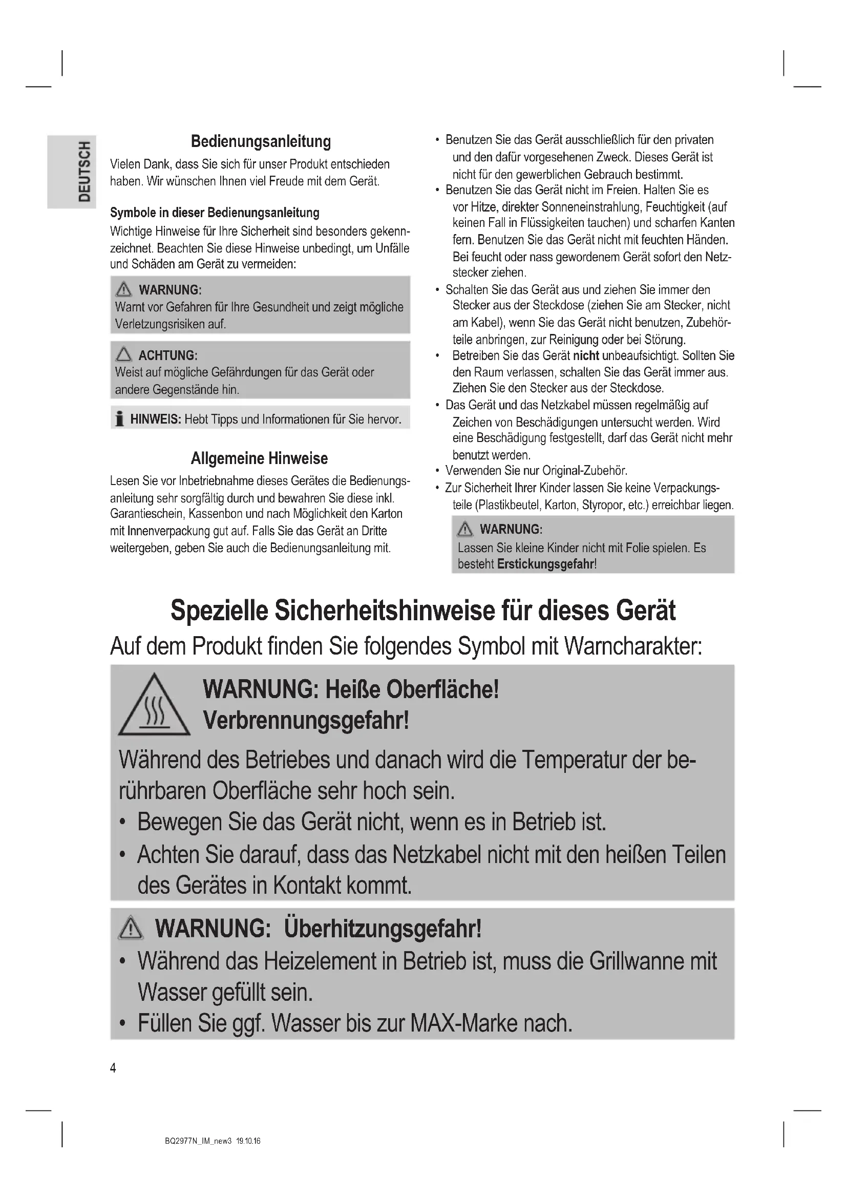 BQ2977N_IM_new3 19.10.163 Übersicht der Bedienelemente Overzicht van de bedieningselementen • Liste des différents éléments de commande Indicación de los elementos de manejo • Elementi di comando • Overview of the Components Przegląd elementów obsługi • A kezelőelemek áttekintése Обзор деталей прибора • BQ2977N_IM_new3 19.10.164 BQ2977N_IM_new3 19.10.16 Bedienungsanleitung Vielen Dank, dass Sie sich für unser Produkt entschieden haben. Wir wünschen Ihnen viel Freude mit dem Gerät. Symbole in dieser Bedienungsanleitung Wichtige Hinweise für Ihre Sicherheit sind besonders gekenn- zeichnet. Beachten Sie diese Hinweise unbedingt, um Unfälle und Schäden am Gerät zu vermeiden: WARNUNG: Warnt vor Gefahren für Ihre Gesundheit und zeigt mögliche Verletzungsrisiken auf. ACHTUNG: Weist auf mögliche Gefährdungen für das Gerät oder andere Gegenstände hin. HINWEIS: Hebt Tipps und Informationen für Sie hervor. Allgemeine Hinweise Lesen Sie vor Inbetriebnahme dieses Gerätes die Bedienungs- anleitung sehr sorgfältig durch und bewahren Sie diese inkl. Garantieschein, Kassenbon und nach Möglichkeit den Karton mit Innenverpackung gut auf. Falls Sie das Gerät an Dritte weitergeben, geben Sie auch die Bedienungsanleitung mit.