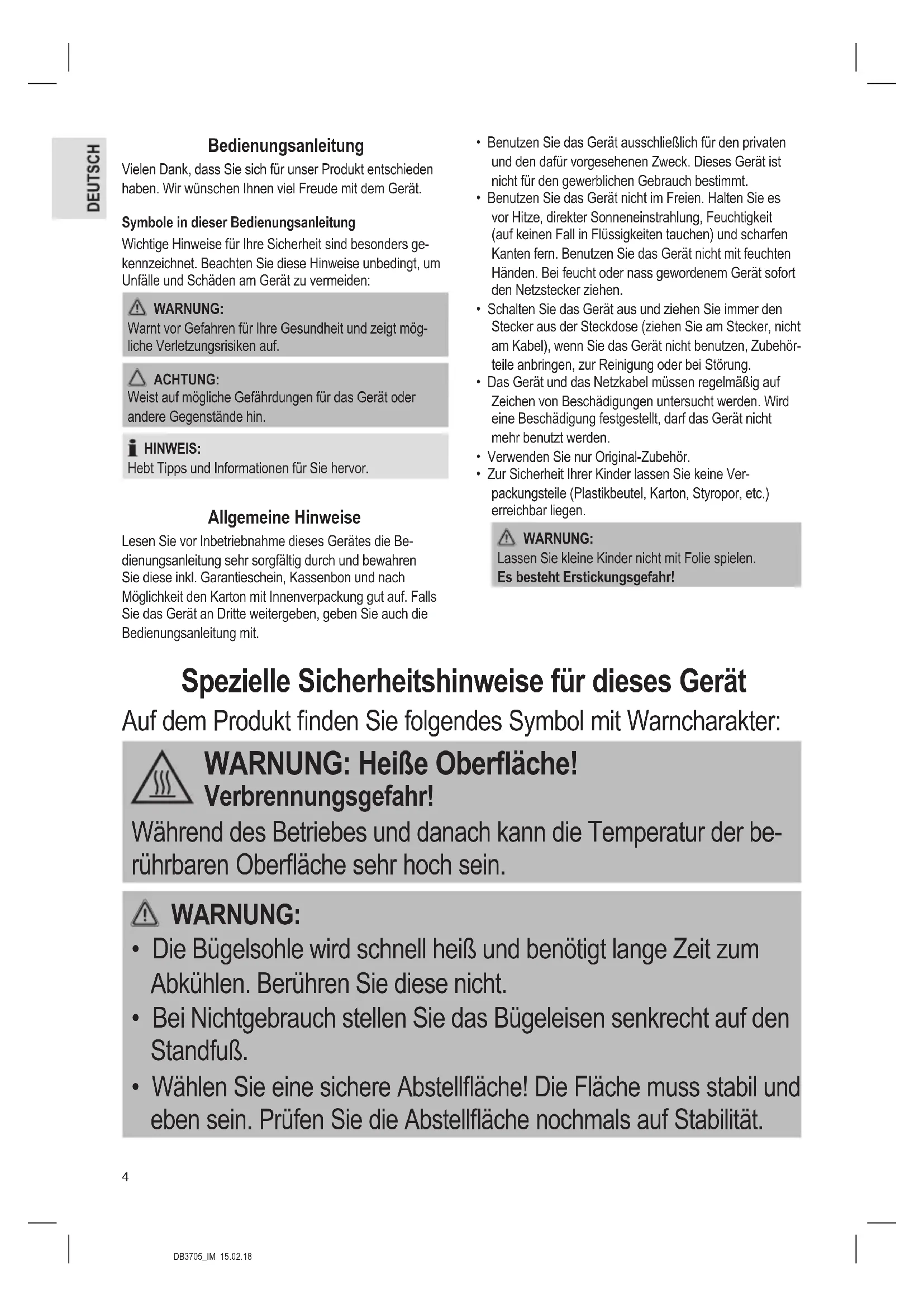 die auf der Nichtbeachtung der Gebrauchsanweisung, unsachgemäßer Behandlung oder normaler Abnutzung des Geräts beruhen. Garantieansprüche sind ferner ausgeschlossen für leicht zerbrechliche Teile, wie zum Beispiel Glas oder Kunststoff. Schließlich sind Garantie-DB3705_IM 15.02.18