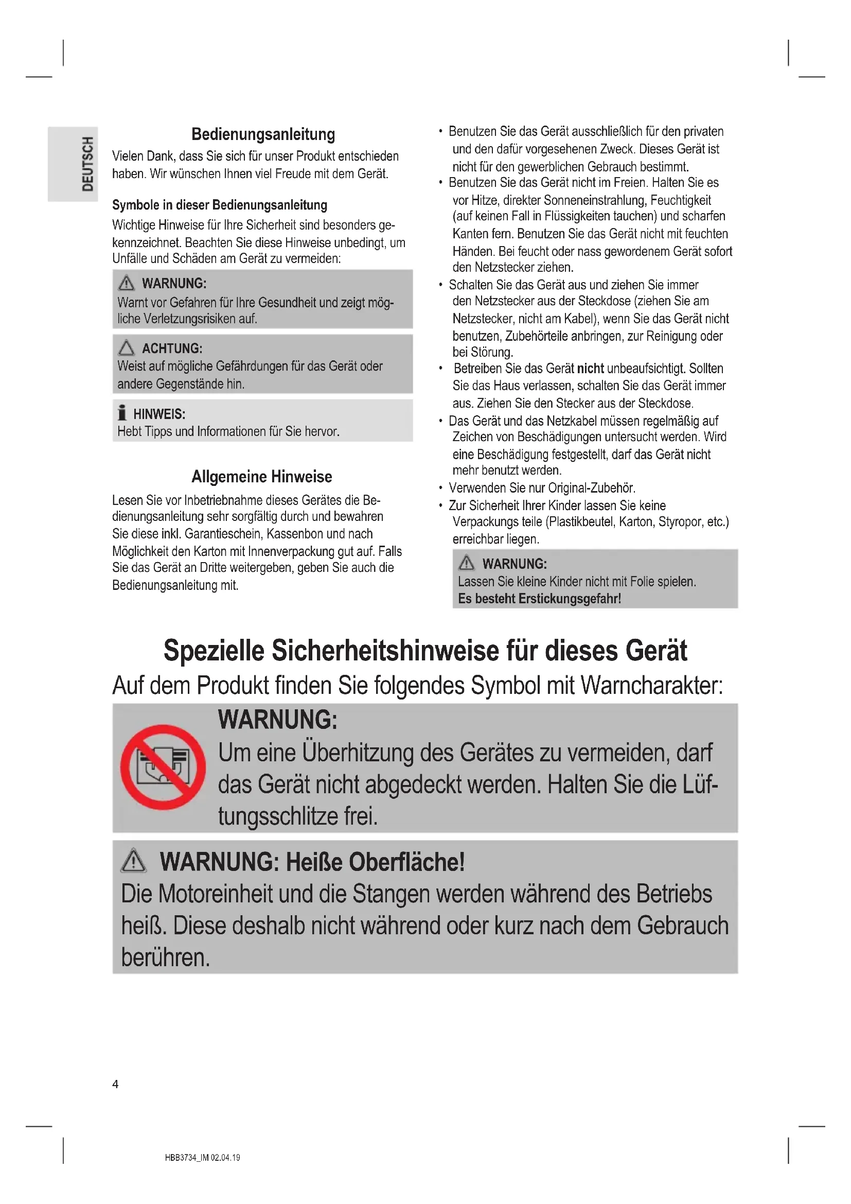 - Zur Sicherheit Ihrer Kinder lassen Sie keine Verpackungs teile (Plastikbeutel, Karton, Styropor, etc.) erreichbar liegen. WARNUNG: Lassen Sie kleine Kinder nicht mit Folie spielen. Es besteht Erstickungsgefahr! Spezielle Sicherheitshinweise für dieses Gerät Auf dem Produkt nden Sie folgendes Symbol mit Warncharakter: WARNUNG: Um eine Überhitzung des Gerätes zu vermeiden, darf das Gerät nicht abgedeckt werden. Halten Sie die Lüf- tungsschlitze frei. WARNUNG: Heiße Oberfläche! Die Motoreinheit und die Stangen werden während des Betriebs heiß. Diese deshalb nicht während oder kurz nach dem Gebrauch berühren.5 HBB3734_IM 02.04.19 ACHTUNG: Dieses Gerät ist nur zum Trocknen von Textilien bestimmt, die in Wasser gewaschen wurden.