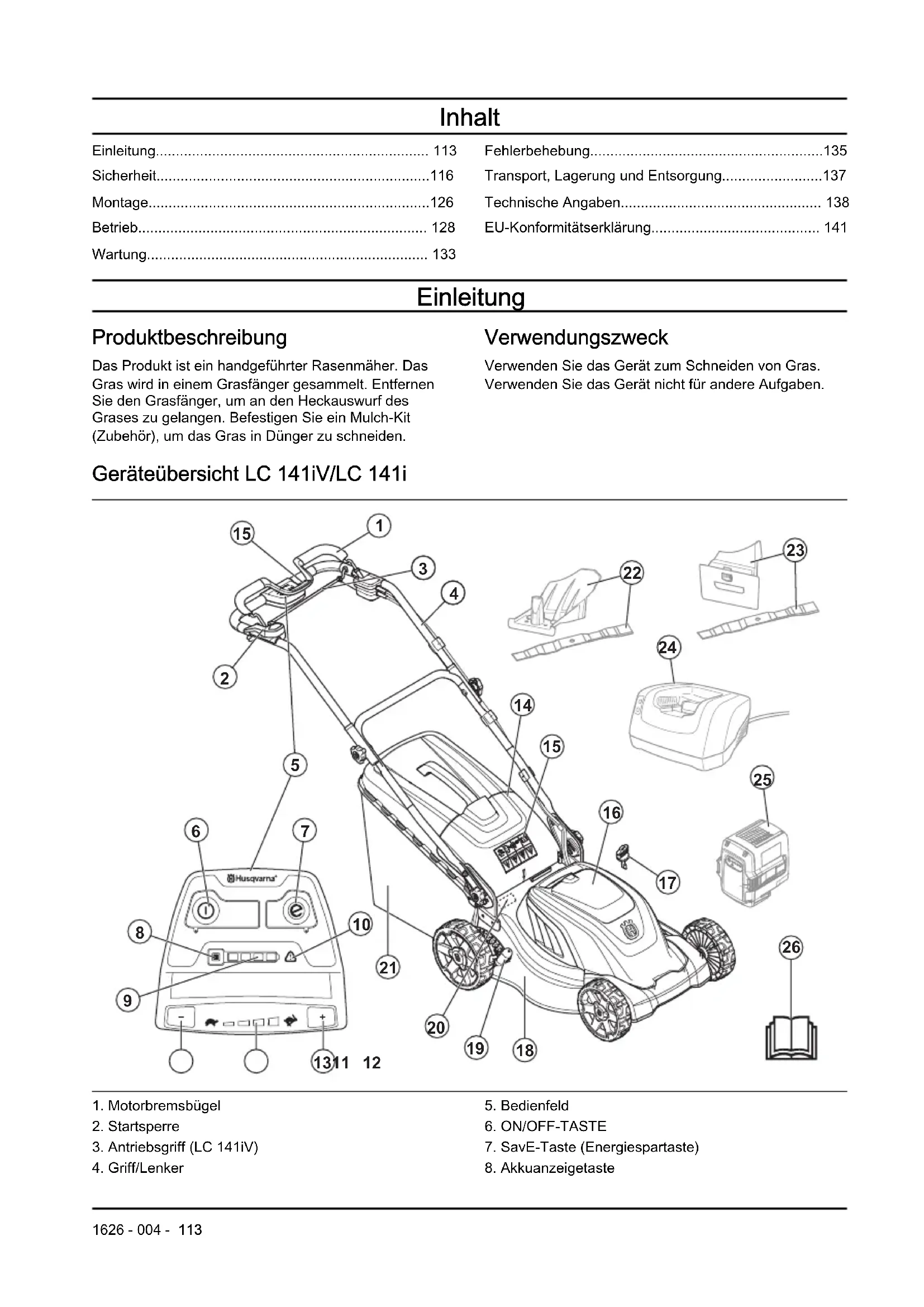 - EU-Konformitätserklärung Einleitung Produktbeschreibung Das Produkt ist ein handgeführter Rasenmäher. Das Gras wird in einem Grasfänger gesammelt. Entfernen Sie den Grasfänger, um an den Heckauswurf des Grases zu gelangen. Befestigen Sie ein Mulch-Kit (Zubehör), um das Gras in Dünger zu schneiden. Verwendungszweck Verwenden Sie das Gerät zum Schneiden von Gras. Verwenden Sie das Gerät nicht für andere Aufgaben. Geräteübersicht LC 141iV/LC 141i p. 141