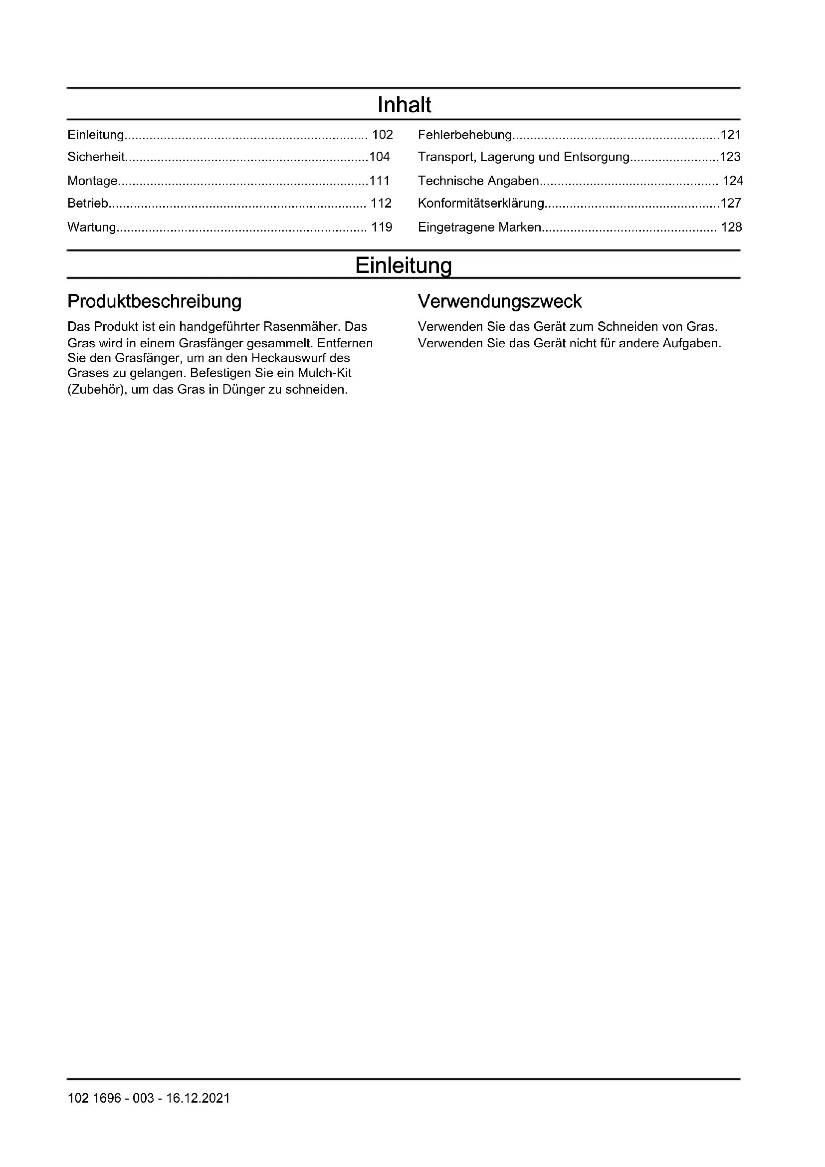 - Eingetragene Marken Einleitung Produktbeschreibung Das Produkt ist ein handgeführter Rasenmäher. Das Gras wird in einem Grasfänger gesammelt. Entfernen Sie den Grasfänger, um an den Heckauswurf des Grases zu gelangen. Befestigen Sie ein Mulch-Kit (Zubehör), um das Gras in Dünger zu schneiden. Verwendungszweck Verwenden Sie das Gerät zum Schneiden von Gras. Verwenden Sie das Gerät nicht für andere Aufgaben. 102 1696 - 003 - 16.12.2021Geräteübersicht p. 128