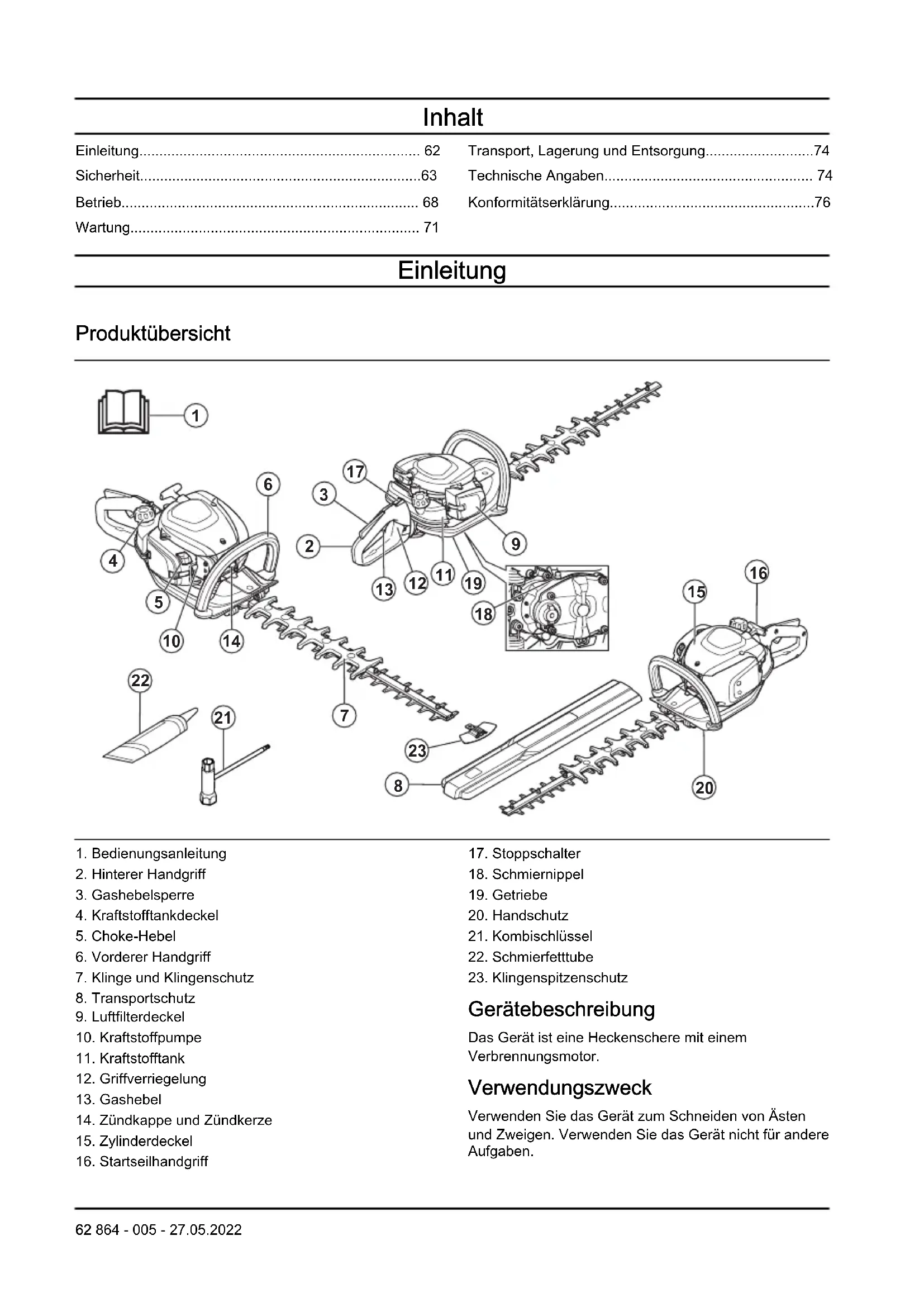 Gerätebeschreibung Das Gerät ist eine Heckenschere mit einem Verbrennungsmotor. Verwendungszweck Verwenden Sie das Gerät zum Schneiden von Ästen und Zweigen. Verwenden Sie das Gerät nicht für andere Aufgaben. 62 864 - 005 - 27.05.2022Symbole auf dem Gerät Stopp. Gehen Sie vorsichtig vor, und verwenden Sie das Gerät ordnungsgemäß. Dieses Gerät kann schwere oder tödliche Verletzungen des Bedieners oder anderer Personen verursachen. Lesen Sie die Bedienungsanleitung sorgfältig durch, und machen Sie sich vor der Benutzung mit dem Inhalt vertraut. Tragen Sie einen geprüften Gehör- und Augenschutz. Tragen Sie zugelassene Schutzhandschuhe. Tragen Sie robuste und rutschfeste Stiefel. Stellschraube für Leerlaufdrehzahl. Nadel für hohe Drehzahl. Nadel für niedrige Drehzahl. Umweltbelastende Geräuschemissionen gemäß der entsprechenden EG-Richtlinie 2000/14/EG und der australischen „Protection of the Environment Operations (Noise Control) Regulation 2017“ (Umweltschutz-/Lärmschutzbestimmung) von New South Wales. Daten zu Geräuschemissionen sind auf dem Geräteschild und im Abschnitt „Technische Daten“ angegeben. Dieses Gerät entspricht den geltenden EG-Richtlinien. Dieses Gerät entspricht den geltenden UK-Richtlinien. yyyywwxxxx Auf dem Typenschild ist die Serien- nummer angegeben. yyyy ist das Produktionsjahr, und ww steht für die Produktionswoche. Hinweis: Sonstige Symbole/Aufkleber auf dem Gerät beziehen sich auf Zertifizierungsanforderungen, die in einigen Märkten gelten. Emissionen nach Euro V WARNUNG: Bei jeglichen Manipulationen des Motors erlischt die EU- Typgenehmigung für dieses Produkt. Sicherheit Sicherheitsdefinitionen Warnungen, Vorsichtsmaßnahmen und Hinweise werden verwendet, um auf besonders wichtige Teile der Bedienungsanleitung hinzuweisen. WARNUNG: Wird verwendet, wenn bei Nichtbeachtung der Anweisungen in diesem Handbuch die Gefahr von Verletzung oder Tod des Bedieners oder anderer Personen besteht. ACHTUNG: Wird verwendet, wenn bei Nichtbeachtung der Anweisungen in diesem Handbuch die Gefahr von Schäden am Gerät, an anderen Materialien oder in der Umgebung besteht. Hinweis: Für weitere Informationen, die in bestimmten Situationen nötig sind. Allgemeine Sicherheitshinweise WARNUNG: Lesen Sie die folgenden Warnhinweise, bevor Sie das Gerät benutzen.