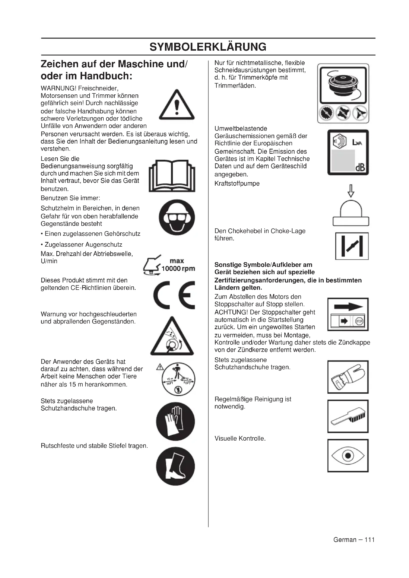 - Zugelassener Augenschutz Max. Drehzahl der Abtriebswelle, U/min Dieses Produkt stimmt mit den geltenden CE-Richtlinien überein. Warnung vor hochgeschleuderten und abprallenden Gegenständen. Der Anwender des Geräts hat darauf zu achten, dass während der Arbeit keine Menschen oder Tiere näher als 15 m herankommen. Stets zugelassene Schutzhandschuhe tragen. Rutschfeste und stabile Stiefel tragen. Nur für nichtmetallische, flexible Schneidausrüstungen bestimmt, d. h. für Trimmerköpfe mit Trimmerfäden. Umweltbelastende Geräuschemissionen gemäß der Richtlinie der Europäischen Gemeinschaft. Die Emission des Gerätes ist im Kapitel Technische Daten und auf dem Geräteschild angegeben. Kraftstoffpumpe Den Chokehebel in Choke-Lage führen. Sonstige Symbole/Aufkleber am Gerät beziehen sich auf spezielle Zertifizierungsanforderungen, die in bestimmten Ländern gelten. Zum Abstellen des Motors den Stoppschalter auf Stopp stellen. ACHTUNG! Der Stoppschalter geht automatisch in die Startstellung zurück. Um ein ungewolltes Starten zu vermeiden, muss bei Montage, Kontrolle und/oder Wartung daher stets die Zündkappe von der Zündkerze entfernt werden. Stets zugelassene Schutzhandschuhe tragen. Regelmäßige Reinigung ist notwendig. Visuelle Kontrolle.