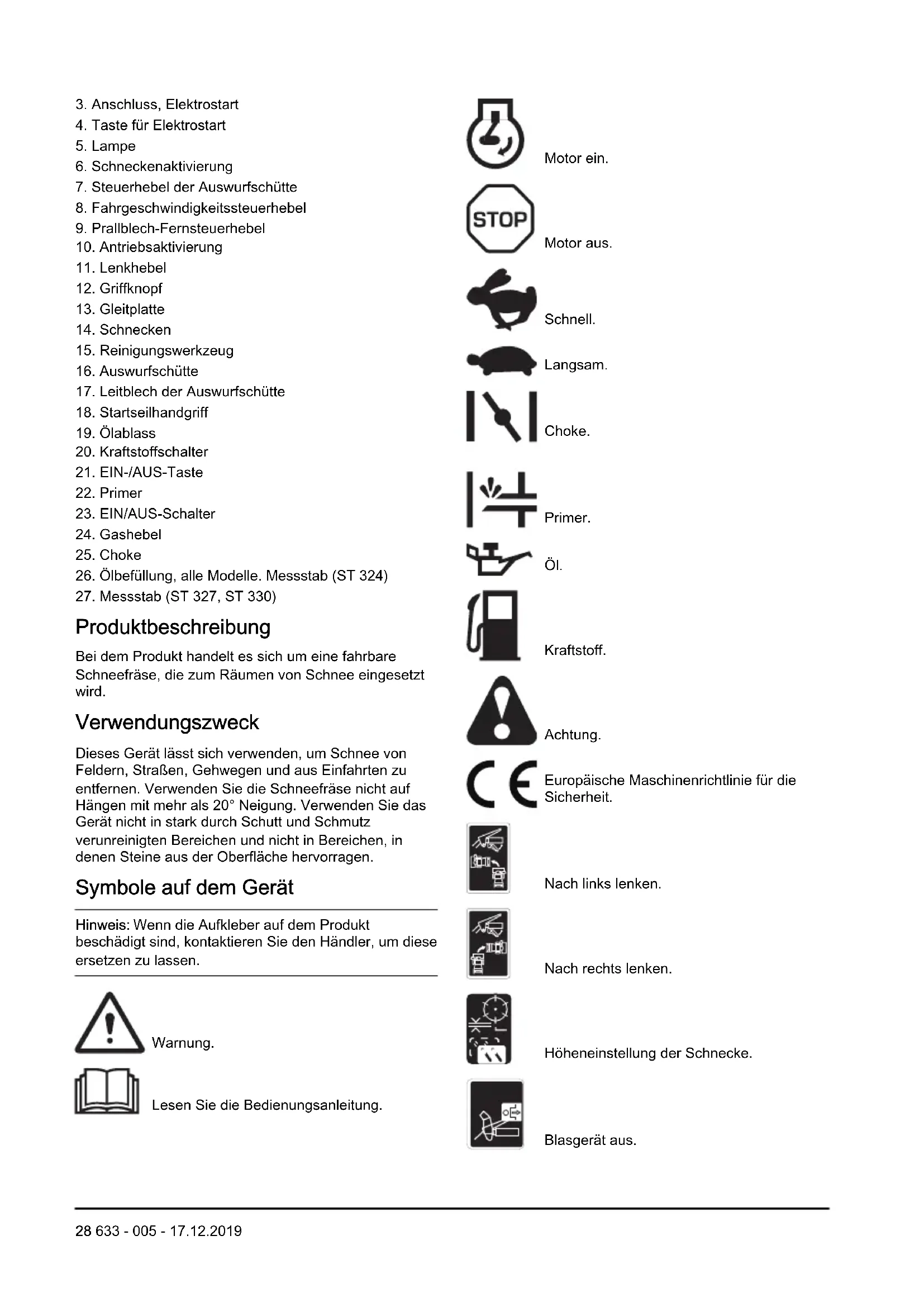 Produktbeschreibung Bei dem Produkt handelt es sich um eine fahrbare Schneefräse, die zum Räumen von Schnee eingesetzt wird. Verwendungszweck Dieses Gerät lässt sich verwenden, um Schnee von Feldern, Straßen, Gehwegen und aus Einfahrten zu entfernen. Verwenden Sie die Schneefräse nicht auf Hängen mit mehr als 20° Neigung. Verwenden Sie das Gerät nicht in stark durch Schutt und Schmutz verunreinigten Bereichen und nicht in Bereichen, in denen Steine aus der Oberfläche hervorragen. Symbole auf dem Gerät Hinweis: Wenn die Aufkleber auf dem Produkt beschädigt sind, kontaktieren Sie den Händler, um diese ersetzen zu lassen. Warnung. Lesen Sie die Bedienungsanleitung. Motor ein. Motor aus. Schnell. Langsam. Choke. Primer. Öl. Kraftstoff. Achtung. Europäische Maschinenrichtlinie für die Sicherheit. Nach links lenken. Nach rechts lenken. Höheneinstellung der Schnecke. Blasgerät aus. 28 633 - 005 - 17.12.2019Blasgerät ein. Fahrantrieb aus. Fahrantrieb ein. Entfernen Sie die Abdeckungen nicht, während der Motor läuft. Gehörschutz empfohlen. Schallleistungspegel. Betrieb an Hängen mehr mit als 10 Grad Steigung/Gefälle nicht möglich. Entfernen Sie vor der Wartung das Zündkerzenkabel. Heiße Oberfläche. Kraftstoffabsperrventil. Warnung, Hände fernhal- ten. Warnung, Füße fernhal- ten. Achten Sie auf hochges- chleuderte Gegenstände. Lassen Sie keine Pas- santen näher kommen. Nach links drehen/nach unten drücken/nach rechts drehen. Vorwärts/rückwärts. Aufwärts/abwärts. Produkthaftung Im Sinne der Produkthaftungsgesetze übernehmen wir keine Haftung für Schäden, die unser Gerät verursacht, wenn...