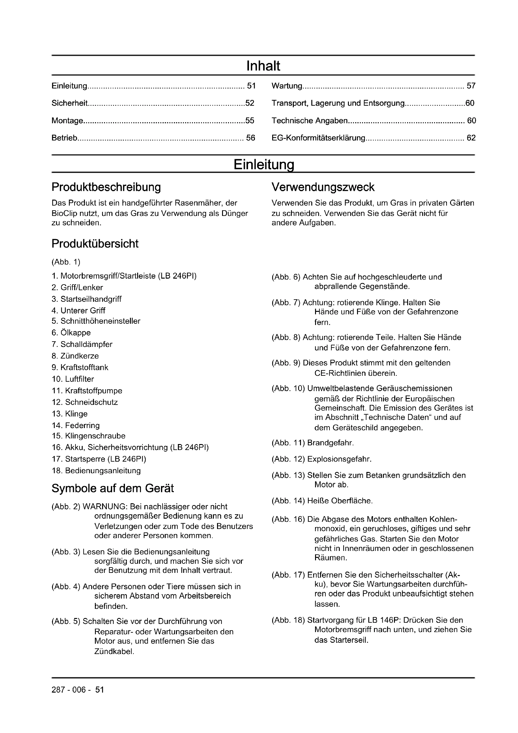 Symbole auf dem Gerät (Abb. 2) WARNUNG: Bei nachlässiger oder nicht ordnungsgemäßer Bedienung kann es zu Verletzungen oder zum Tode des Benutzers oder anderer Personen kommen. (Abb. 3) Lesen Sie die Bedienungsanleitung sorgfältig durch, und machen Sie sich vor der Benutzung mit dem Inhalt vertraut. (Abb. 4) Andere Personen oder Tiere müssen sich in sicherem Abstand vom Arbeitsbereich befinden. (Abb. 5) Schalten Sie vor der Durchführung von Reparatur- oder Wartungsarbeiten den Motor aus, und entfernen Sie das Zündkabel. (Abb. 6) Achten Sie auf hochgeschleuderte und abprallende Gegenstände. (Abb. 7) Achtung: rotierende Klinge. Halten Sie Hände und Füße von der Gefahrenzone fern. (Abb. 8) Achtung: rotierende Teile. Halten Sie Hände und Füße von der Gefahrenzone fern. (Abb. 9) Dieses Produkt stimmt mit den geltenden CE-Richtlinien überein. (Abb. 10) Umweltbelastende Geräuschemissionen gemäß der Richtlinie der Europäischen Gemeinschaft. Die Emission des Gerätes ist im Abschnitt „Technische Daten“ und auf dem Geräteschild angegeben. (Abb. 11) Brandgefahr. (Abb. 12) Explosionsgefahr. (Abb. 13) Stellen Sie zum Betanken grundsätzlich den Motor ab. (Abb. 14) Heiße Oberfläche. (Abb. 16) Die Abgase des Motors enthalten Kohlen- monoxid, ein geruchloses, giftiges und sehr gefährliches Gas. Starten Sie den Motor nicht in Innenräumen oder in geschlossenen Räumen. (Abb. 17) Entfernen Sie den Sicherheitsschalter (Ak- ku), bevor Sie Wartungsarbeiten durchfüh- ren oder das Produkt unbeaufsichtigt stehen lassen. (Abb. 18) Startvorgang für LB 146P: Drücken Sie den Motorbremsgriff nach unten, und ziehen Sie das Starterseil.