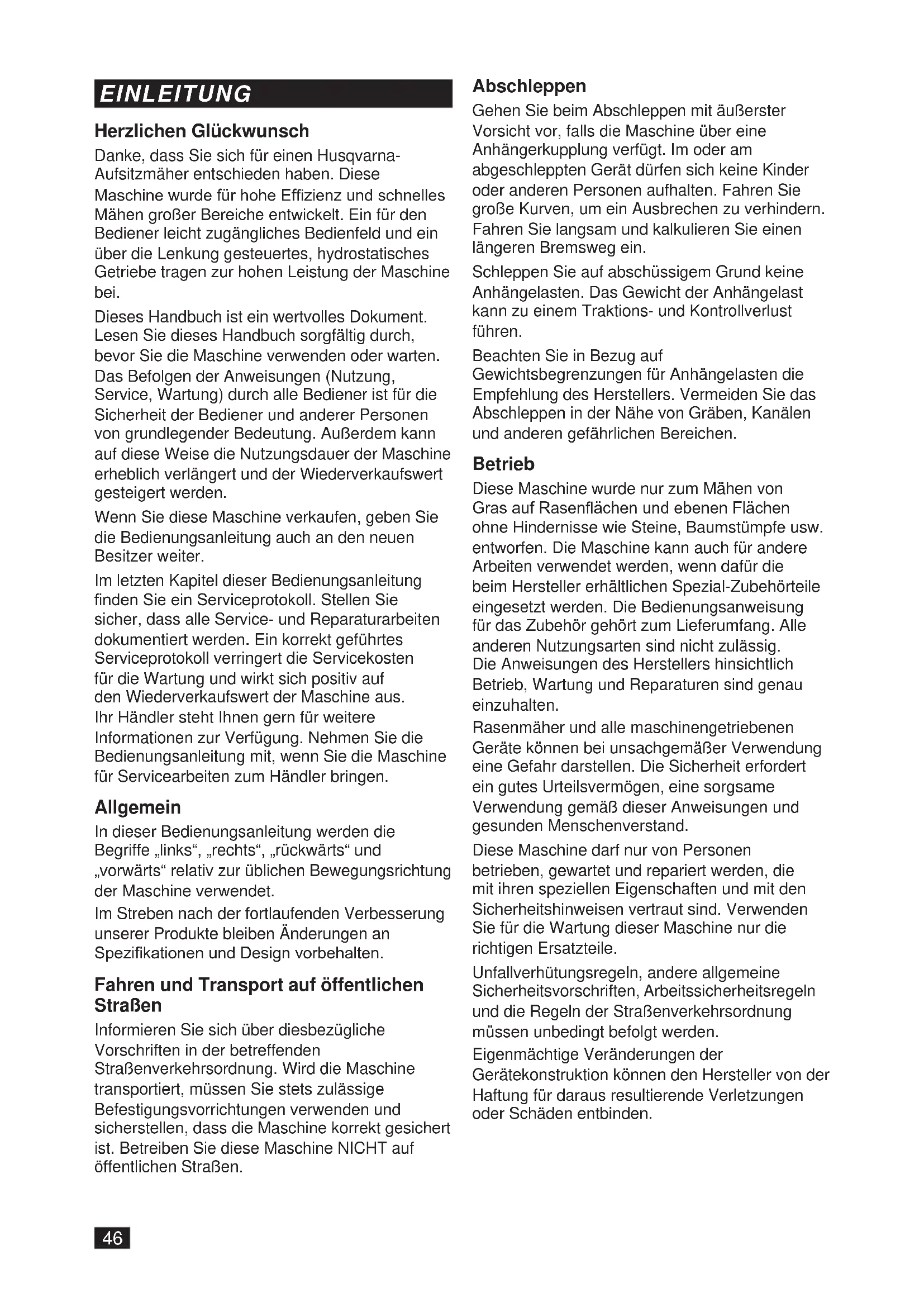 - WARTUNGSJOURNAL Herzlichen Glückwunsch Danke, dass Sie sich für einen Husqvarna- Aufsitzmäher entschieden haben. Diese Maschine wurde für hohe Efzienz und schnelles Mähen großer Bereiche entwickelt. Ein für den Bediener leicht zugängliches Bedienfeld und ein über die Lenkung gesteuertes, hydrostatisches Getriebe tragen zur hohen Leistung der Maschine bei. Dieses Handbuch ist ein wertvolles Dokument. Lesen Sie dieses Handbuch sorgfältig durch, bevor Sie die Maschine verwenden oder warten. Das Befolgen der Anweisungen (Nutzung, Service, Wartung) durch alle Bediener ist für die Sicherheit der Bediener und anderer Personen von grundlegender Bedeutung. Außerdem kann auf diese Weise die Nutzungsdauer der Maschine erheblich verlängert und der Wiederverkaufswert gesteigert werden. Wenn Sie diese Maschine verkaufen, geben Sie die Bedienungsanleitung auch an den neuen Besitzer weiter. Im letzten Kapitel dieser Bedienungsanleitung nden Sie ein Serviceprotokoll. Stellen Sie sicher, dass alle Service- und Reparaturarbeiten dokumentiert werden. Ein korrekt geführtes Serviceprotokoll verringert die Servicekosten für die Wartung und wirkt sich positiv auf den Wiederverkaufswert der Maschine aus. Ihr Händler steht Ihnen gern für weitere Informationen zur Verfügung. Nehmen Sie die Bedienungsanleitung mit, wenn Sie die Maschine für Servicearbeiten zum Händler bringen. Allgemein In dieser Bedienungsanleitung werden die Begriffe „links“, „rechts“, „rückwärts“ und „vorwärts“ relativ zur üblichen Bewegungsrichtung der Maschine verwendet. Im Streben nach der fortlaufenden Verbesserung unserer Produkte bleiben Änderungen an Spezikationen und Design vorbehalten. Fahren und Transport auf öffentlichen Straßen Informieren Sie sich über diesbezügliche Vorschriften in der betreffenden Straßenverkehrsordnung. Wird die Maschine transportiert, müssen Sie stets zulässige Befestigungsvorrichtungen verwenden und sicherstellen, dass die Maschine korrekt gesichert ist. Betreiben Sie diese Maschine NICHT auf öffentlichen Straßen. Abschleppen Gehen Sie beim Abschleppen mit äußerster Vorsicht vor, falls die Maschine über eine Anhängerkupplung verfügt. Im oder am abgeschleppten Gerät dürfen sich keine Kinder oder anderen Personen aufhalten. Fahren Sie große Kurven, um ein Ausbrechen zu verhindern. Fahren Sie langsam und kalkulieren Sie einen längeren Bremsweg ein. Schleppen Sie auf abschüssigem Grund keine Anhängelasten. Das Gewicht der Anhängelast kann zu einem Traktions- und Kontrollverlust führen. Beachten Sie in Bezug auf Gewichtsbegrenzungen für Anhängelasten die Empfehlung des Herstellers. Vermeiden Sie das Abschleppen in der Nähe von Gräben, Kanälen und anderen gefährlichen Bereichen. Betrieb Diese Maschine wurde nur zum Mähen von Gras auf Rasenächen und ebenen Flächen ohne Hindernisse wie Steine, Baumstümpfe usw. entworfen. Die Maschine kann auch für andere Arbeiten verwendet werden, wenn dafür die beim Hersteller erhältlichen Spezial-Zubehörteile eingesetzt werden. Die Bedienungsanweisung für das Zubehör gehört zum Lieferumfang. Alle anderen Nutzungsarten sind nicht zulässig. Die Anweisungen des Herstellers hinsichtlich Betrieb, Wartung und Reparaturen sind genau einzuhalten. Rasenmäher und alle maschinengetriebenen Geräte können bei unsachgemäßer Verwendung eine Gefahr darstellen. Die Sicherheit erfordert ein gutes Urteilsvermögen, eine sorgsame Verwendung gemäß dieser Anweisungen und gesunden Menschenverstand. Diese Maschine darf nur von Personen betrieben, gewartet und repariert werden, die mit ihren speziellen Eigenschaften und mit den Sicherheitshinweisen vertraut sind. Verwenden Sie für die Wartung dieser Maschine nur die richtigen Ersatzteile. Unfallverhütungsregeln, andere allgemeine Sicherheitsvorschriften, Arbeitssicherheitsregeln und die Regeln der Straßenverkehrsordnung müssen unbedingt befolgt werden. Eigenmächtige Veränderungen der Gerätekonstruktion können den Hersteller von der Haftung für daraus resultierende Verletzungen oder Schäden entbinden. p. 84
