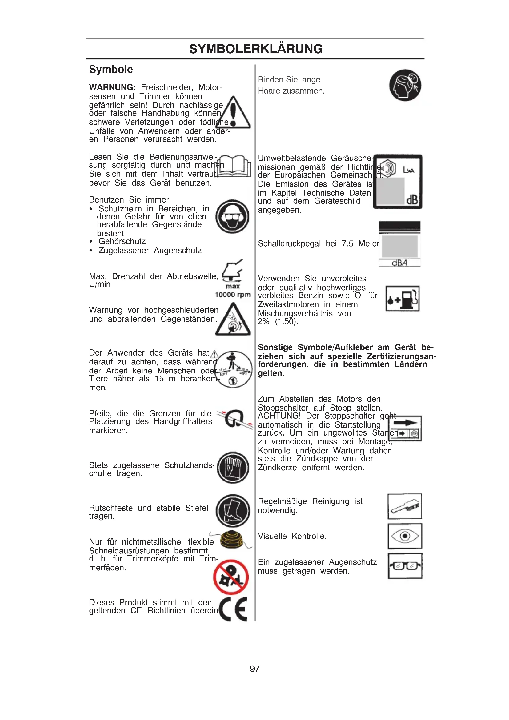 S oder anderes Ihre Kontrolle über das Gerät beeinflussen können. S Um sicherzustellen, dass weder Mens- chen, Tiere noch Gegenstände Gefahr laufen, mit der Schneidausrüstung selber oder mit von der Schneidaus- rüstung hochgeschleuderten losen Gegenständen in Kontakt kommen. S ACHTUNG! Das Gerät niemals benut- zen, wenn nicht die Möglichkeit besteht, im Falle eines Unfalls Hilfe herbeizurufen.