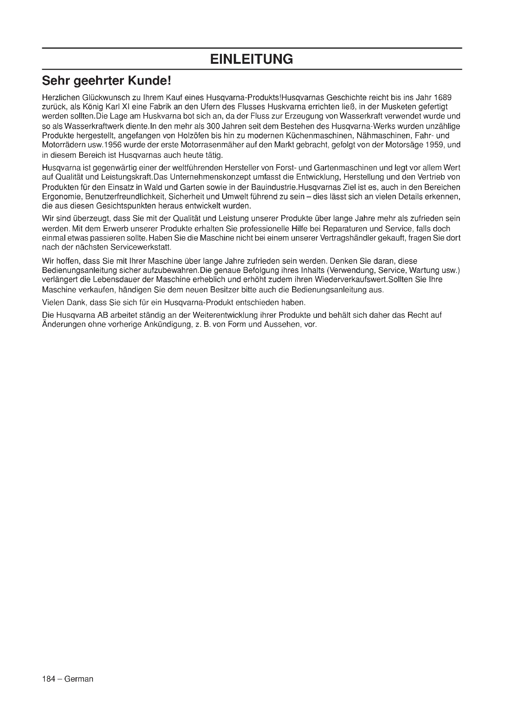 - EG-Konformitätserklärung 84 – German EINLEITUNG Sehr geehrter Kunde! Herzlichen Glückwunsch zu Ihrem Kauf eines Husqvarna-Produkts!Husqvarnas Geschichte reicht bis ins Jahr 1689 zurück, als König Karl XI eine Fabrik an den Ufern des Flusses Huskvarna errichten ließ, in der Musketen gefertigt werden sollten.Die Lage am Huskvarna bot sich an, da der Fluss zur Erzeugung von Wasserkraft verwendet wurde und so als Wasserkraftwerk diente.In den mehr als 300 Jahren seit dem Bestehen des Husqvarna-Werks wurden unzählige Produkte hergestellt, angefangen von Holzöfen bis hin zu modernen Küchenmaschinen, Nähmaschinen, Fahr- und Motorrädern usw.1956 wurde der erste Motorrasenmäher auf den Markt gebracht, gefolgt von der Motorsäge 1959, und in diesem Bereich ist Husqvarnas auch heute tätig. Husqvarna ist gegenwärtig einer der weltführenden Hersteller von Forst- und Gartenmaschinen und legt vor allem Wert auf Qualität und Leistungskraft.Das Unternehmenskonzept umfasst die Entwicklung, Herstellung und den Vertrieb von Produkten für den Einsatz in Wald und Garten sowie in der Bauindustrie.Husqvarnas Ziel ist es, auch in den Bereichen Ergonomie, Benutzerfreundlichkeit, Sicherheit und Umwelt führend zu sein – dies lässt sich an vielen Details erkennen, die aus diesen Gesichtspunkten heraus entwickelt wurden. Wir sind überzeugt, dass Sie mit der Qualität und Leistung unserer Produkte über lange Jahre mehr als zufrieden sein werden. Mit dem Erwerb unserer Produkte erhalten Sie professionelle Hilfe bei Reparaturen und Service, falls doch einmal etwas passieren sollte. Haben Sie die Maschine nicht bei einem unserer Vertragshändler gekauft, fragen Sie dort nach der nächsten Servicewerkstatt. Wir hoffen, dass Sie mit Ihrer Maschine über lange Jahre zufrieden sein werden. Denken Sie daran, diese Bedienungsanleitung sicher aufzubewahren.Die genaue Befolgung ihres Inhalts (Verwendung, Service, Wartung usw.) verlängert die Lebensdauer der Maschine erheblich und erhöht zudem ihren Wiederverkaufswert.Sollten Sie Ihre Maschine verkaufen, händigen Sie dem neuen Besitzer bitte auch die Bedienungsanleitung aus. Vielen Dank, dass Sie sich für ein Husqvarna-Produkt entschieden haben. Die Husqvarna AB arbeitet ständig an der Weiterentwicklung ihrer Produkte und behält sich daher das Recht auf Änderungen ohne vorherige Ankündigung, z. B. von Form und Aussehen, vor.German – 185 WAS IST WAS? Was ist was an der Motorsäge? p. 2191