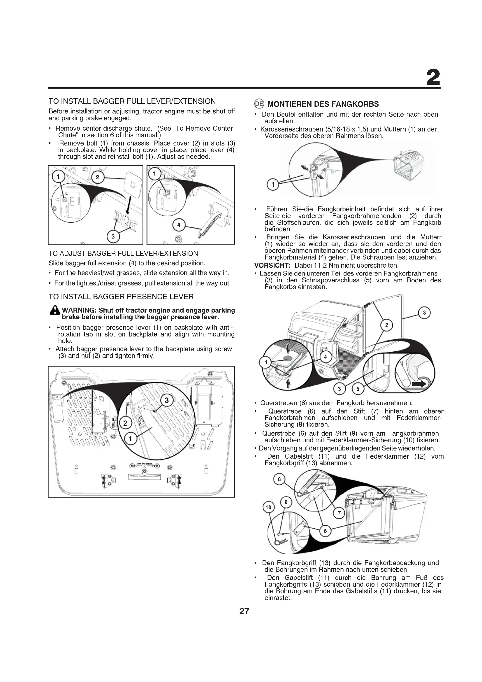 - Wenn sich der Fangkorb in der gewünschten Position befin- det, die Einstellschrauben (2) an beiden Seiten mit 11,2 Nm festziehen. NICHT zu stark anziehen.