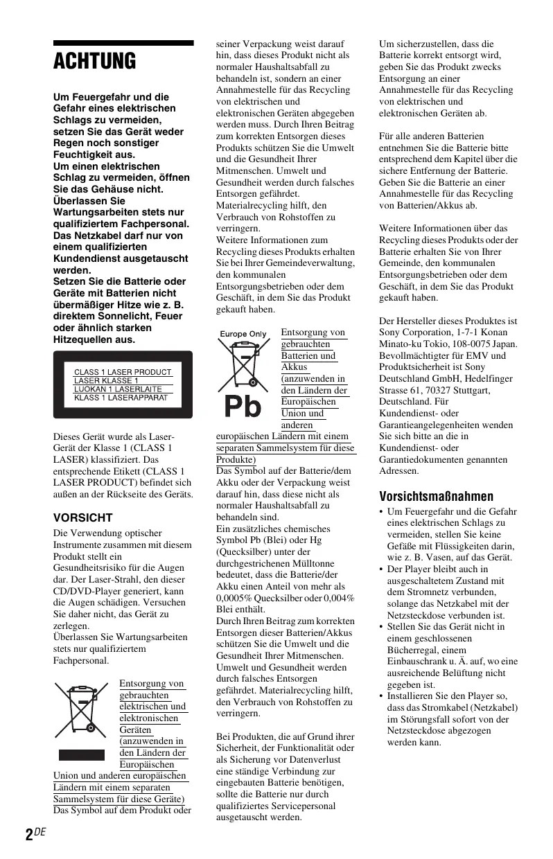 Para recibir información detallada sobre el reciclaje de este producto o de la batería, póngase en contacto con el ayuntamiento, el punto de recogida más cercano o el establecimiento donde ha adquirido el producto. El fabricante de este producto es Sony Corporation, 1-7-1 Konan Minato-ku Tokyo, 108-0075 CA pueda ser desenchufado de la toma de corriente de la pared inmediatamente en caso de problema. • Si traslada el reproductor directamente de un lugar frío a uno cálido o si lo instala en una sala muy húmeda, es posible que se condense humedad en las lentes de su interior. Si esto ocurre, es posible que el reproductor no funcione correctamente. En este caso, extraiga el disco y deje encendido el reproductor durante media hora aproximadamente hasta que se haya evaporado la humedad.