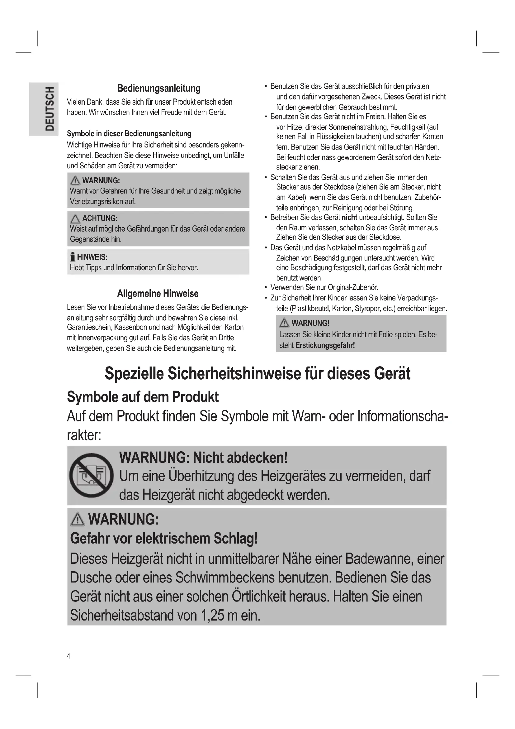 - Zur Sicherheit Ihrer Kinder lassen Sie keine Verpackungs- teile (Plastikbeutel, Karton, Styropor, etc.) erreichbar liegen. WARNUNG! Lassen Sie kleine Kinder nicht mit Folie spielen. Es be- steht Erstickungsgefahr! Bedienungsanleitung Vielen Dank, dass Sie sich für unser Produkt entschieden haben. Wir wünschen Ihnen viel Freude mit dem Gerät. Symbole in dieser Bedienungsanleitung Wichtige Hinweise für Ihre Sicherheit sind besonders gekenn- zeichnet. Beachten Sie diese Hinweise unbedingt, um Unfälle und Schäden am Gerät zu vermeiden: WARNUNG: Warnt vor Gefahren für Ihre Gesundheit und zeigt mögliche Verletzungsrisiken auf. ACHTUNG: Weist auf mögliche Gefährdungen für das Gerät oder andere Gegenstände hin. HINWEIS: Hebt Tipps und Informationen für Sie hervor. Allgemeine Hinweise Lesen Sie vor Inbetriebnahme dieses Gerätes die Bedienungs- anleitung sehr sorgfältig durch und bewahren Sie diese inkl. Garantieschein, Kassenbon und nach Möglichkeit den Karton mit Innenverpackung gut auf. Falls Sie das Gerät an Dritte weitergeben, geben Sie auch die Bedienungsanleitung mit. Spezielle Sicherheitshinweise für dieses Gerät Symbole auf dem Produkt Auf dem Produkt nden Sie Symbole mit Warn- oder Informationscha- rakter: WARNUNG: Nicht abdecken! Um eine Überhitzung des Heizgerätes zu vermeiden, darf das Heizgerät nicht abgedeckt werden. WARNUNG: Gefahr vor elektrischem Schlag! Dieses Heizgerät nicht in unmittelbarer Nähe einer Badewanne, einer Dusche oder eines Schwimmbeckens benutzen. Bedienen Sie das Gerät nicht aus einer solchen Örtlichkeit heraus. Halten Sie einen Sicherheitsabstand von 1,25 m ein.5 WARNUNG: Verbrennungsgefahr