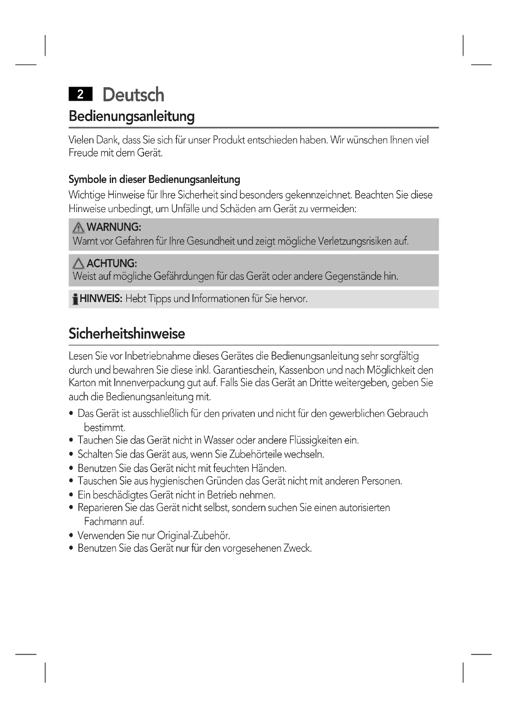 - Das Gerät ist ausschließlich für den privaten und nicht für den gewerblichen Gebrauch bestimmt.