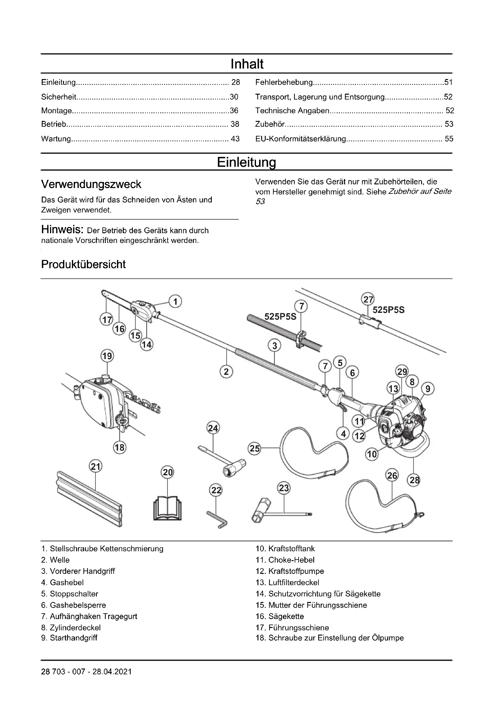 - EU-Konformitätserklärung Einleitung Verwendungszweck Das Gerät wird für das Schneiden von Ästen und Zweigen verwendet. Hinweis: Der Betrieb des Geräts kann durch nationale Vorschriften eingeschränkt werden. Verwenden Sie das Gerät nur mit Zubehörteilen, die vom Hersteller genehmigt sind. Siehe Zubehör auf Seite p. 55
