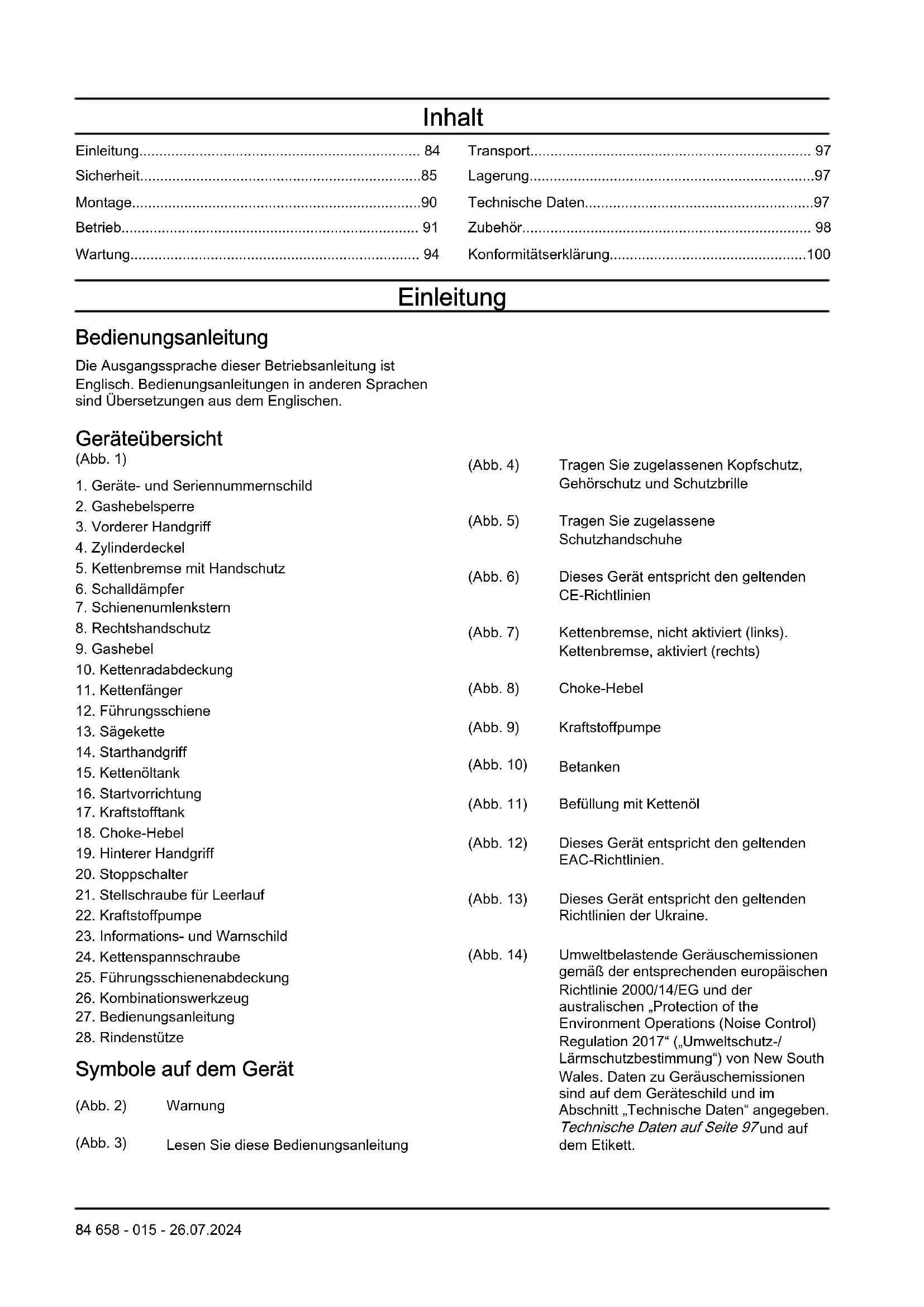 Symbole auf dem Gerät (Abb. 2) Warnung (Abb. 3) Lesen Sie diese Bedienungsanleitung (Abb. 4) Tragen Sie zugelassenen Kopfschutz, Gehörschutz und Schutzbrille (Abb. 5) Tragen Sie zugelassene Schutzhandschuhe (Abb. 6) Dieses Gerät entspricht den geltenden CE-Richtlinien (Abb. 7) Kettenbremse, nicht aktiviert (links). Kettenbremse, aktiviert (rechts) (Abb. 8) Choke-Hebel (Abb. 9) Kraftstoffpumpe (Abb. 10) Betanken (Abb. 11) Befüllung mit Kettenöl (Abb. 12) Dieses Gerät entspricht den geltenden EAC-Richtlinien. (Abb. 13) Dieses Gerät entspricht den geltenden Richtlinien der Ukraine. (Abb. 14) Umweltbelastende Geräuschemissionen gemäß der entsprechenden europäischen Richtlinie 2000/14/EG und der australischen „Protection of the Environment Operations (Noise Control) Regulation2017“ („Umweltschutz-/ Lärmschutzbestimmung“) von New South Wales. Daten zu Geräuschemissionen sind auf dem Geräteschild und im Abschnitt „Technische Daten“ angegeben. Technische Daten auf Seite 97 und auf dem Etikett. 84 658 - 015 - 26.07.2024(Abb. 15) Halten Sie das Gerät mit beiden Händen fest. (Abb. 16) Verwenden Sie es nicht mit einer Hand (Abb. 17) Vermeiden Sie Kontakt mit der Spitze der Führungsschiene. (Abb. 18) Achten Sie auf den Rückstoß. (Abb. 19) Dieses Gerät entspricht den in Australien und Neuseeland geltenden Richtlinien zur elektromagnetischen Verträglichkeit. Hinweis: Weitere Symbole/Aufkleber auf dem Gerät beziehen sich auf die Zertifizierungsanforderungen für andere kommerzielle Bereiche. Produkthaftung Im Sinne der Produkthaftungsgesetze übernehmen wir keine Haftung für Schäden, die unser Gerät verursacht, wenn...