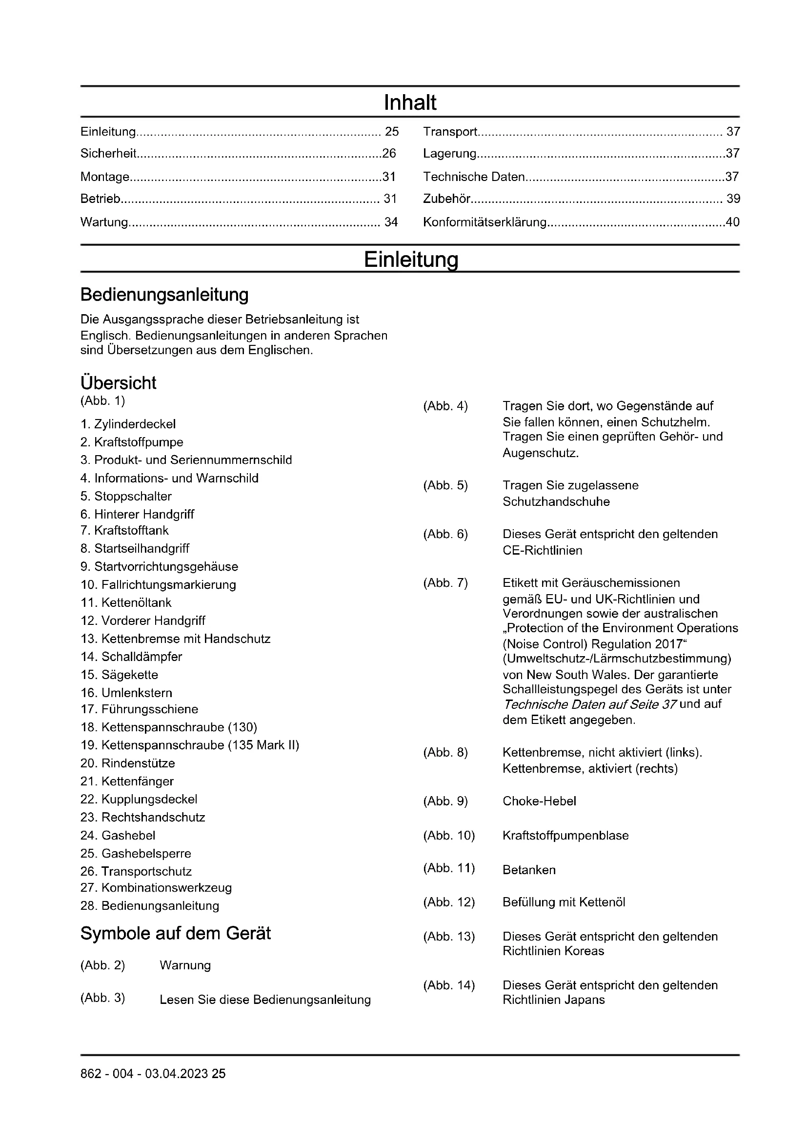- Diese Bedienungsanleitung kann nicht alle Situationen abdecken, die bei der Verwendung des Geräts auftreten können. Seien Sie immer vorsichtig und arbeiten Sie mit gesundem Menschenverstand. Führen Sie keine Arbeiten mit oder Wartungen am Gerät durch, wenn Sie sich in einer Situation 26 862 - 004 - 03.04.2023unsicher sind. Wenden Sie sich an einen Produktfachmann, Ihren Fachhändler, Ihren Service Vertreter oder das autorisierte Service Center für weitere Informationen.