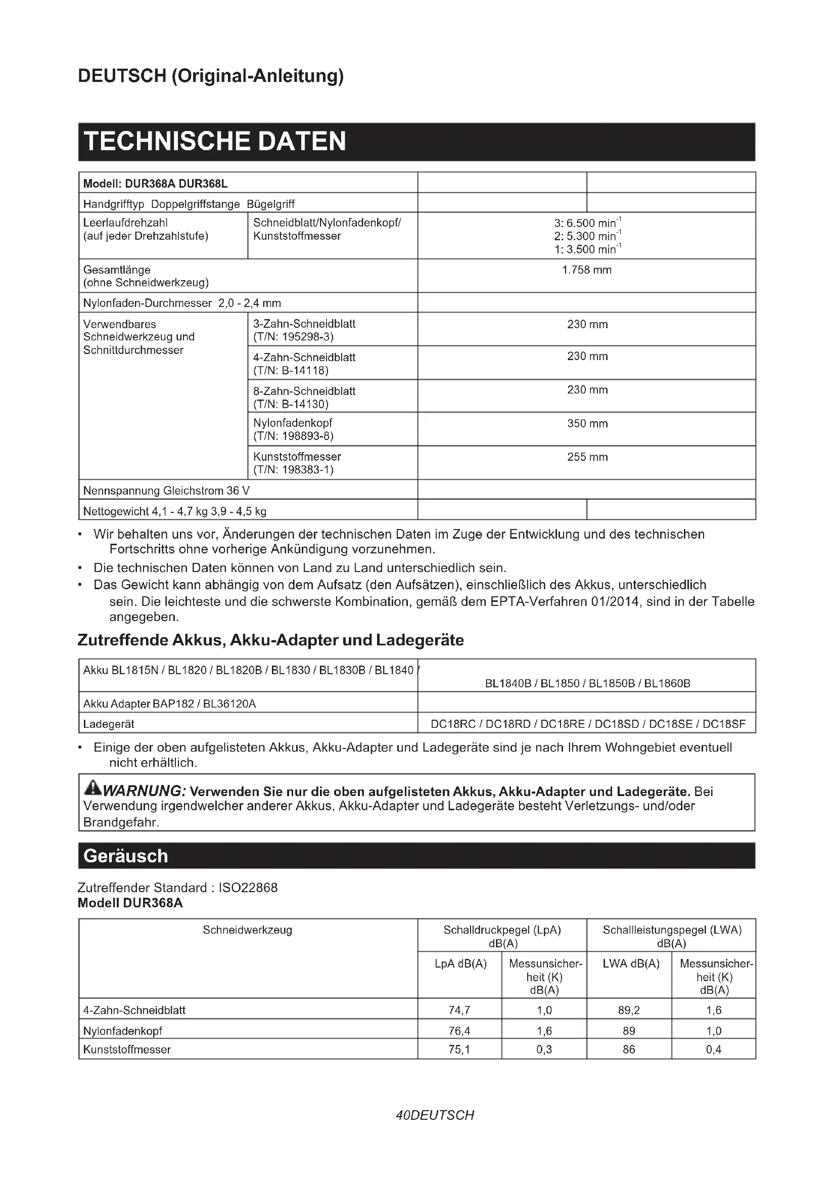 - BatterieetchargeurMakitad’origine NOTE :Ilsepeutquecertainsélémentsdelaliste soientcomprisdansl’emballagedel’outilentant qu’accessoiresstandard.Ilspeuventvarierd’unpays àl’autre.40 DEUTSCH DEUTSCH (Original-Anleitung) TECHNISCHE DATEN Modell: DUR368A DUR368LHandgrifftyp Doppelgriffstange BügelgriffLeerlaufdrehzahl (aufjederDrehzahlstufe)Schneidblatt/Nylonfadenkopf/Kunststoffmesser3: 6.500 min