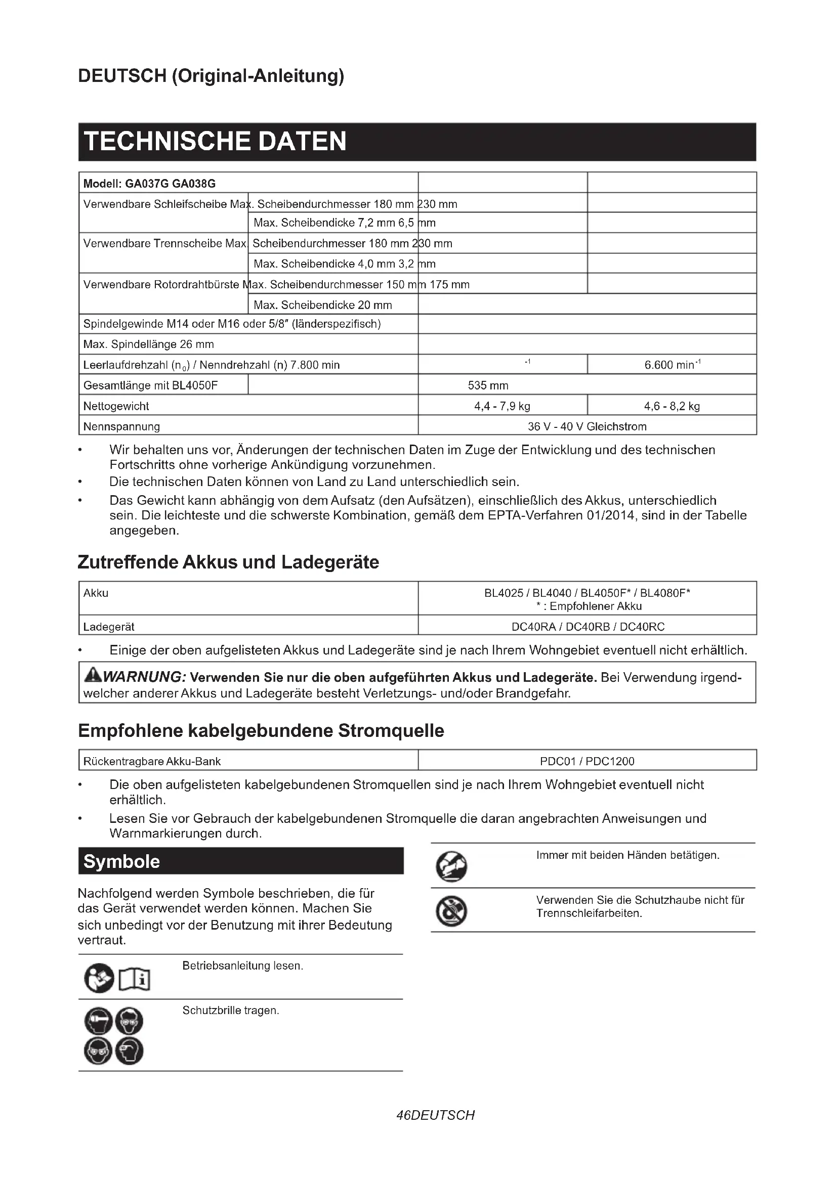 - Lesen Sie vor Gebrauch der kabelgebundenen Stromquelle die daran angebrachten Anweisungen und Warnmarkierungen durch. Symbole Nachfolgend werden Symbole beschrieben, die für das Gerät verwendet werden können. Machen Sie sich unbedingt vor der Benutzung mit ihrer Bedeutung vertraut. Betriebsanleitung lesen. Schutzbrille tragen. Immer mit beiden Händen betätigen. Verwenden Sie die Schutzhaube nicht für Trennschleifarbeiten.47 DEUTSCH Ni-MH Li-ion Nur für EU-Länder Aufgrund des Vorhandenseins gefährlicher Komponenten in der Ausrüstung können Elektro- und Elektronik-Altgeräte, Akkumulatoren und Batterien sich negativ auf die Umwelt und die menschliche Gesundheit auswirken. Entsorgen Sie Elektro- und Elektronikgeräte oder Batterien nicht mit dem Hausmüll! In Übereinstimmung mit der Europäischen Richtlinie über Elektro- und Elektronik-Altgeräte, Akkumulatoren und Batterien, verbrauchte Akkumulatoren und Batterien sowie ihrer Anpassung an nationales Recht sollten Elektro- Altgeräte, Batterien und Akkumulatoren gemäß den Umweltschutzbestimmungen getrennt gelagert und zu einer getrennten Sammelstelle für Siedlungsabfälle geliefert werden. Dies wird durch das am Gerät angebrachte Symbol der durchgestrichenen Abfalltonne auf Rädern angezeigt. Vorgesehene Verwendung Das Werkzeug ist für das Schleifen, Schmirgeln, Drahtbürsten, Lochschneiden und Schneiden von Metall- und Steinmaterial ohne den Gebrauch von Wasser vorgesehen. Geräusch Typischer A-bewerteter Geräuschpegel ermittelt gemäß EN62841-2-3: Modell Schalldruckpegel