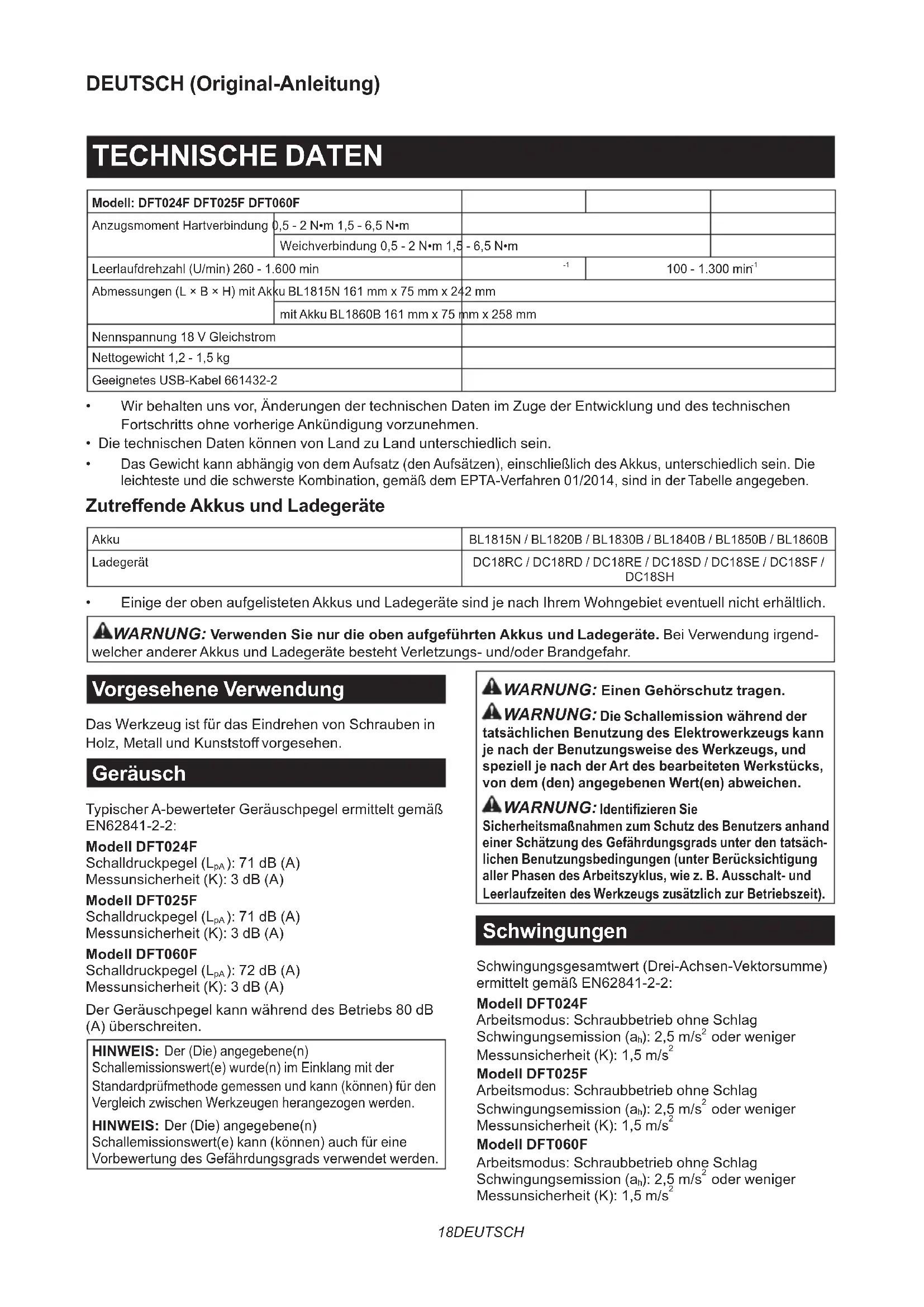 - Einige der oben aufgelisteten Akkus und Ladegeräte sind je nach Ihrem Wohngebiet eventuell nicht erhältlich. WARNUNG: Verwenden Sie nur die oben aufgeführten Akkus und Ladegeräte. Bei Verwendung irgend- welcher anderer Akkus und Ladegeräte besteht Verletzungs- und/oder Brandgefahr. Vorgesehene Verwendung Das Werkzeug ist für das Eindrehen von Schrauben in Holz,MetallundKunststovorgesehen. Geräusch Typischer A-bewerteter Geräuschpegel ermittelt gemäß EN62841-2-2: Modell DFT024F Schalldruckpegel (L
