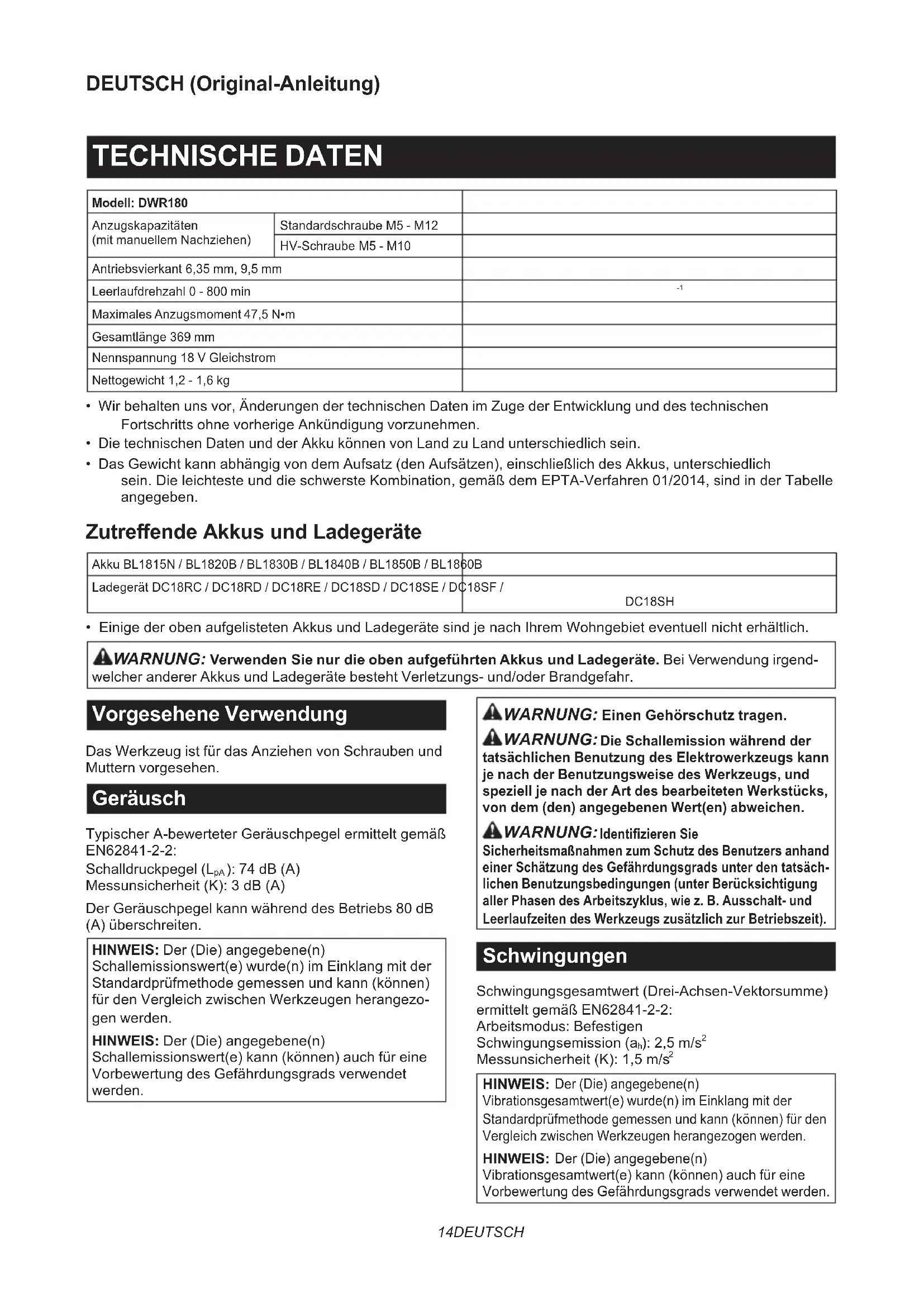- Einige der oben aufgelisteten Akkus und Ladegeräte sind je nach Ihrem Wohngebiet eventuell nicht erhältlich. WARNUNG: Verwenden Sie nur die oben aufgeführten Akkus und Ladegeräte. Bei Verwendung irgend- welcher anderer Akkus und Ladegeräte besteht Verletzungs- und/oder Brandgefahr. Vorgesehene Verwendung Das Werkzeug ist für das Anziehen von Schrauben und Muttern vorgesehen. Geräusch Typischer A-bewerteter Geräuschpegel ermittelt gemäß EN62841-2-2: Schalldruckpegel (L