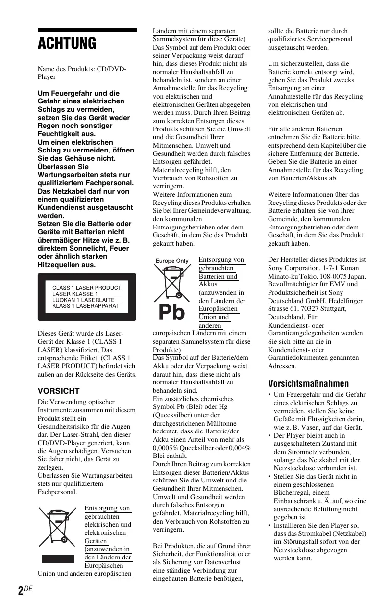 ACHTUNG Name des Produkts: CD/DVDPlayer Um Feuergefahr und die Gefahr eines elektrischen Schlags zu vermeiden, setzen Sie das Gerät weder Regen noch sonstiger Feuchtigkeit aus. Um einen elektrischen Schlag zu vermeiden, öffnen Sie das Gehäuse nicht. Überlassen Sie Wartungsarbeiten stets nur qualifiziertem Fachpersonal. Das Netzkabel darf nur von einem qualifizierten Kundendienst ausgetauscht werden. Setzen Sie die Batterie oder Geräte mit Batterien nicht übermäßiger Hitze wie z. B. direktem Sonnelicht, Feuer oder ähnlich starken Hitzequellen aus.