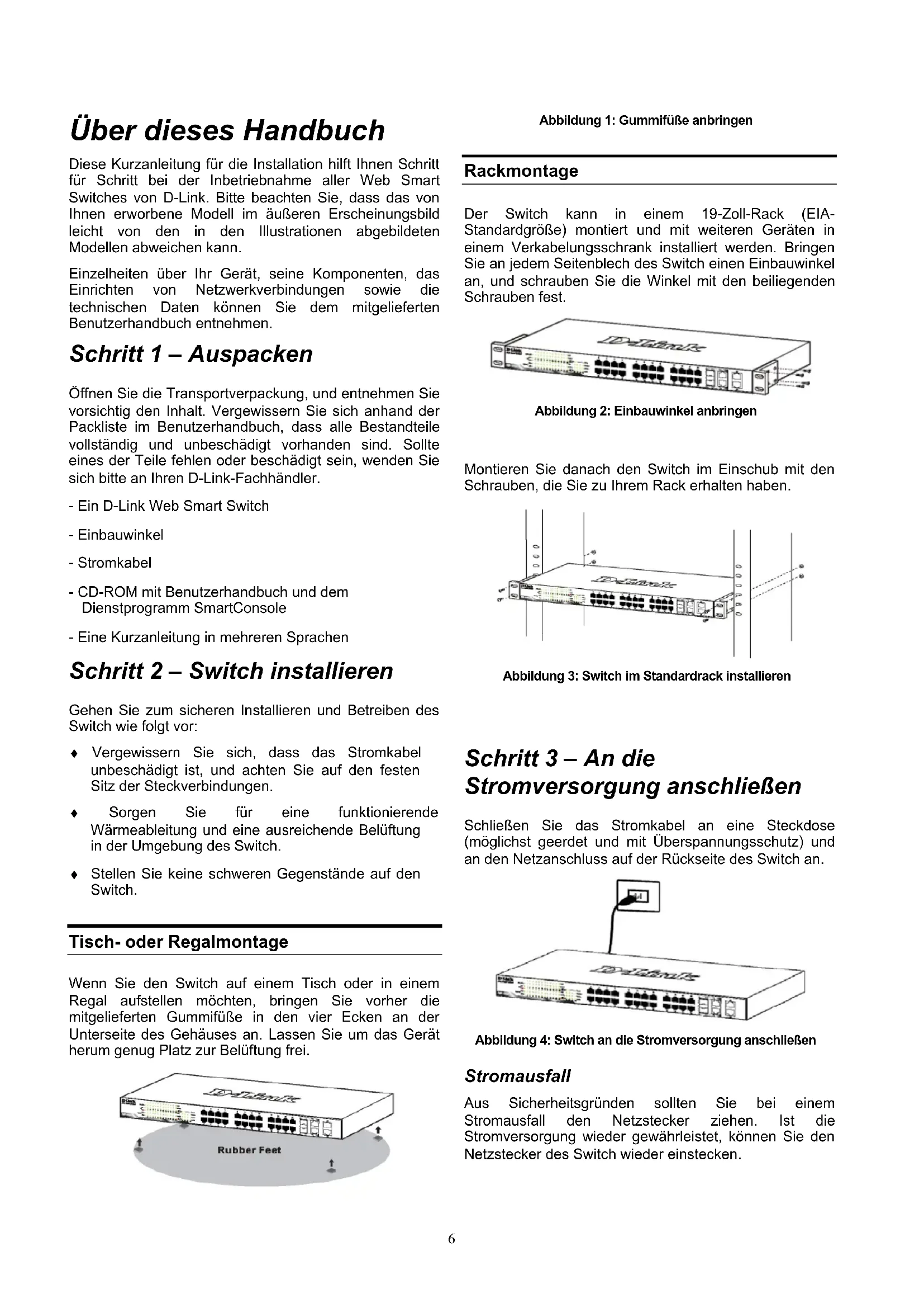 network segment of your PC and use the SmartConsole Utility to discover the Smart Switches. For a detailed look at SmartConsole’s functions, please refer to the SmartConsole Utility introduction in the user manual. Telnet Management Users may also access the switch through Telnet using your PC’s Command Prompt. To access it from your computer, users must first ensure that a valid connection is made through the Ethernet port of the Switch and your PC, and then click Start > Programs > Accessories > Command Prompt on your computer. Once the console window opens, enter the command telnet 10.90.90.90 (depending on configured IP address) and press Enter on your keyboard. You should be directed to the opening console screen for the Command Line Interface of the switch, enter the “admin” for the default user name and password for the Switch and press the Enter key. SNMP-Based Management You can manage the Switch with D-Link D-View or any SNMP-compatible program. The SNMP function is default Disabled for D-Link Web Smart switches. Additional Information If you are encountering problems setting up your network, please refer to the user manual that came with the switch. It contains many more rules, charts, explanations, and examples to help you get your network up and running. Additional help is available through our offices listed at the back of the user manual or online. To find out more about D-Link products or marketing information, please visit the website http://www.dlink.com.tw; for any support issue, please visit the website http://support.dlink.com.tw, which will re-direct you to appropriate local D-Link website.56 Über dieses Handbuch Diese Kurzanleitung für die Installation hilft Ihnen Schritt für Schritt bei der Inbetriebnahme aller Web Smart Switches von D-Link. Bitte beachten Sie, dass das von Ihnen erworbene Modell im äußeren Erscheinungsbild leicht von den in den Illustrationen abgebildeten Modellen abweichen kann. Einzelheiten über Ihr Gerät, seine Komponenten, das Einrichten von Netzwerkverbindungen sowie die technischen Daten können Sie dem mitgelieferten Benutzerhandbuch entnehmen. Schritt 1 – Auspacken Öffnen Sie die Transportverpackung, und entnehmen Sie vorsichtig den Inhalt. Vergewissern Sie sich anhand der Packliste im Benutzerhandbuch, dass alle Bestandteile vollständig und unbeschädigt vorhanden sind. Sollte eines der Teile fehlen oder beschädigt sein, wenden Sie sich bitte an Ihren D-Link-Fachhändler. - Ein D-Link Web Smart Switch - Einbauwinkel - Stromkabel - CD-ROM mit Benutzerhandbuch und dem Dienstprogramm SmartConsole - Eine Kurzanleitung in mehreren Sprachen Schritt 2 – Switch installieren Gehen Sie zum sicheren Installieren und Betreiben des Switch wie folgt vor: ♦ Vergewissern Sie sich, dass das Stromkabel unbeschädigt ist, und achten Sie auf den festen Sitz der Steckverbindungen. ♦ Sorgen Sie für eine funktionierende Wärmeableitung und eine ausreichende Belüftung in der Umgebung des Switch. ♦ Stellen Sie keine schweren Gegenstände auf den Switch. Tisch- oder Regalmontage Wenn Sie den Switch auf einem Tisch oder in einem Regal aufstellen möchten, bringen Sie vorher die mitgelieferten Gummifüße in den vier Ecken an der Unterseite des Gehäuses an. Lassen Sie um das Gerät herum genug Platz zur Belüftung frei.