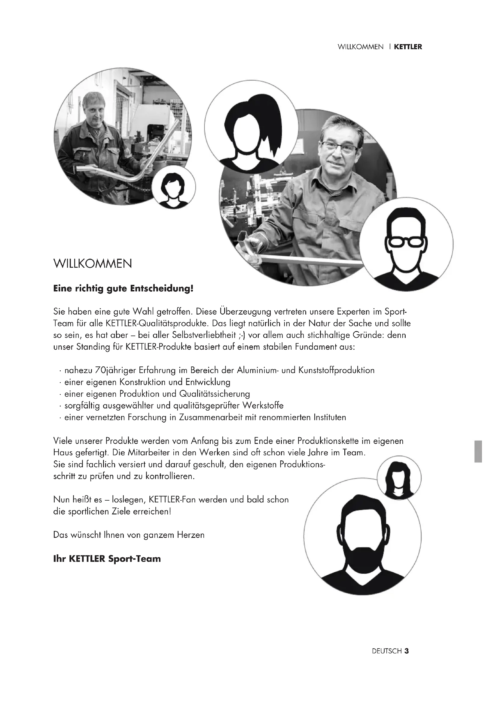 - einer vernetzten Forschung in Zusammenarbeit mit renommierten Instituten Viele unserer Produkte werden vom Anfang bis zum Ende einer Produktionskette im eigenen Haus gefertigt. Die Mitarbeiter in den Werken sind oft schon viele Jahre im Team. Sie sind fachlich versiert und darauf geschult, den eigenen Produktions- schritt zu prüfen und zu kontrollieren. Nun heißt es – loslegen, KETTLER-Fan werden und bald schon die sportlichen Ziele erreichen! Das wünscht Ihnen von ganzem Herzen Ihr KETTLER Sport-Team P1_Kettler_Handbuch_170629_01.indd 3 29.06.17 12:30KETTLER | START 4 DEUTSCH Start