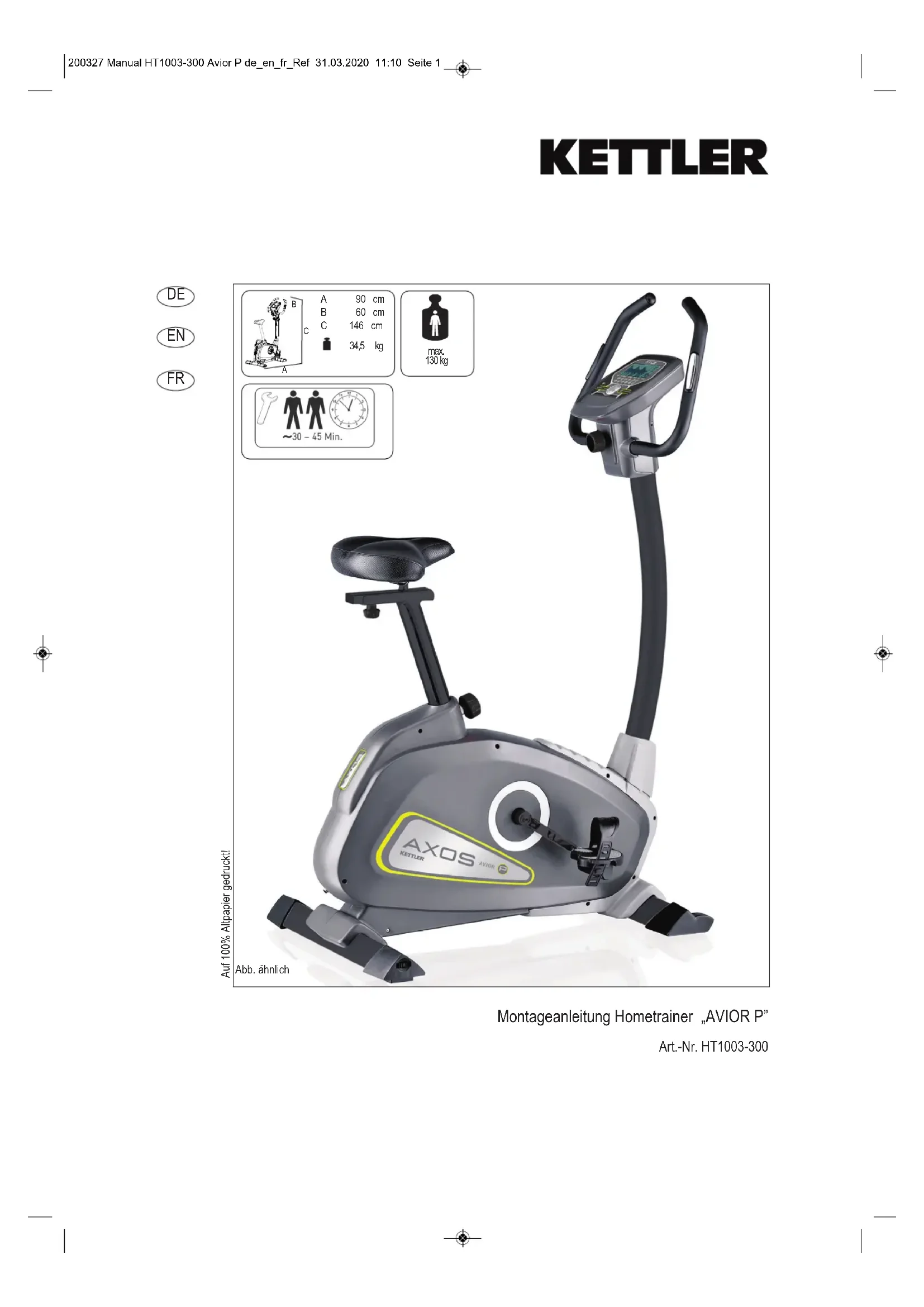 Montageanleitung Hometrainer „AVIOR P” Art.-Nr. HT1003-300 Abb. ähnlich Auf 100% Altpapier gedruckt! A 90 cm B 60 cm C 146 cm 34,5 kg max. 130 kg