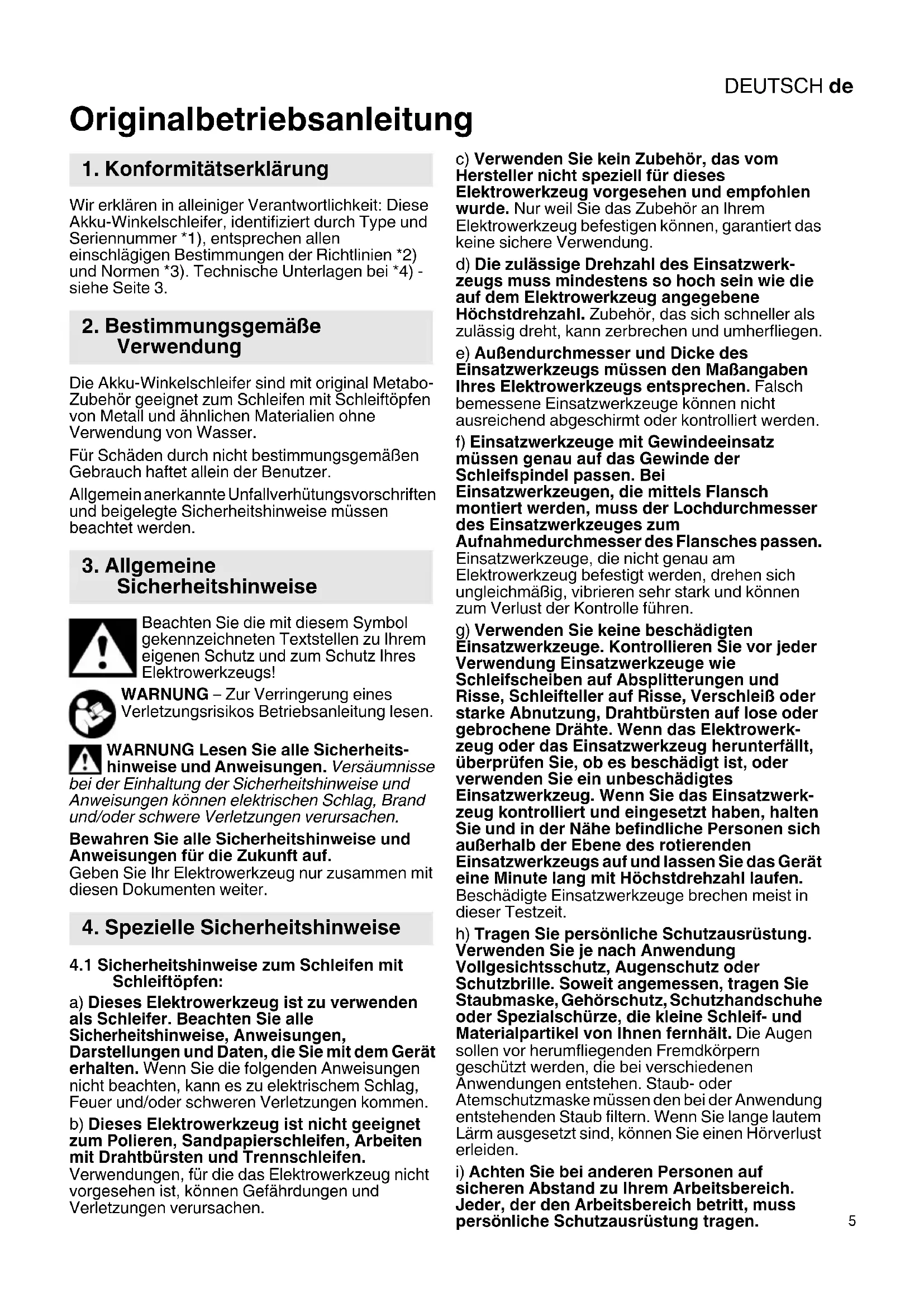 Originalbetriebsanleitung Wir erklären in alleiniger Verantwortlichkeit: Diese Akku-Winkelschleifer, identifiziert durch Type und Seriennummer *1), entsprechen allen einschlägigen Bestimmungen der Richtlinien *2) und Normen *3). Technische Unterlagen bei *4) - siehe Seite 3. Die Akku-Winkelschleifer sind mit original Metabo- Zubehör geeignet zum Schleifen mit Schleiftöpfen von Metall und ähnlichen Materialien ohne Verwendung von Wasser. Für Schäden durch nicht bestimmungsgemäßen Gebrauch haftet allein der Benutzer. Allgemein anerkannte Unfallverhütungsvorschriften und beigelegte Sicherheitshinweise müssen beachtet werden. Beachten Sie die mit diesem Symbol gekennzeichneten Textstellen zu Ihrem eigenen Schutz und zum Schutz Ihres Elektrowerkzeugs! WARNUNG – Zur Verringerung eines Verletzungsrisikos Betriebsanleitung lesen. WARNUNG Lesen Sie alle Sicherheits- hinweise und Anweisungen. Versäumnisse bei der Einhaltung der Sicherheitshinweise und Anweisungen können elektrischen Schlag, Brand und/oder schwere Verletzungen verursachen. Bewahren Sie alle Sicherheitshinweise und Anweisungen für die Zukunft auf. Geben Sie Ihr Elektrowerkzeug nur zusammen mit diesen Dokumenten weiter.