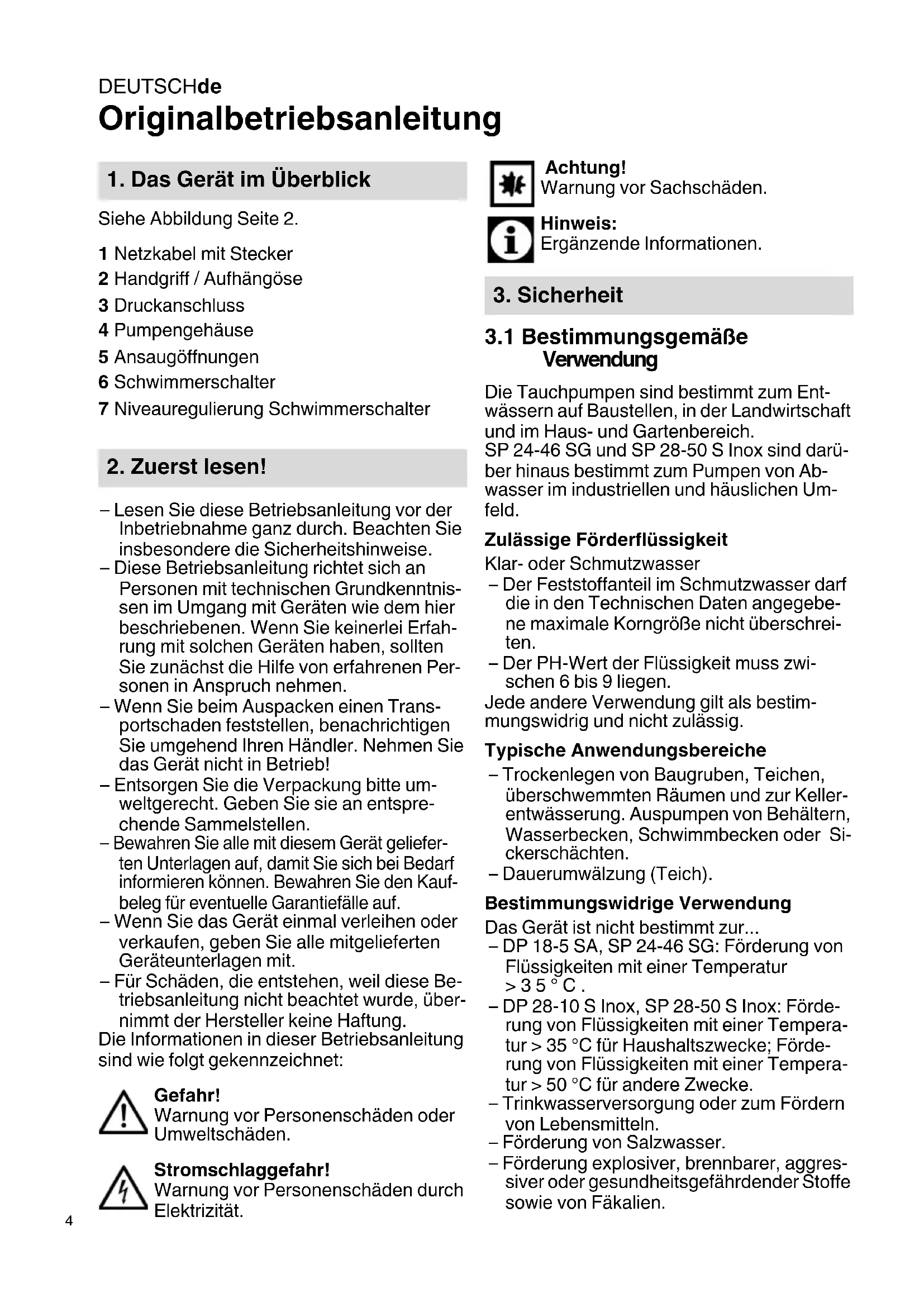 Verwendung Die Tauchpumpen sind bestimmt zum Ent- wässern auf Baustellen, in der Landwirtschaft und im Haus- und Gartenbereich. SP 24-46 SG und SP 28-50 S Inox sind darü- ber hinaus bestimmt zum Pumpen von Ab- wasser im industriellen und häuslichen Um- feld. Zulässige Förderflüssigkeit Klar- oder Schmutzwasser – Der Feststoffanteil im Schmutzwasser darf die in den Technischen Daten angegebe- ne maximale Korngröße nicht überschrei- ten. – Der PH-Wert der Flüssigkeit muss zwi- schen 6 bis 9 liegen. Jede andere Verwendung gilt als bestim- mungswidrig und nicht zulässig. Typische Anwendungsbereiche – Trockenlegen von Baugruben, Teichen, überschwemmten Räumen und zur Keller- entwässerung. Auspumpen von Behältern, Wasserbecken, Schwimmbecken oder Si- ckerschächten. – Dauerumwälzung (Teich). Bestimmungswidrige Verwendung Das Gerät ist nicht bestimmt zur... – DP 18-5 SA, SP 24-46 SG: Förderung von Flüssigkeiten mit einer Temperatur >35°C. – DP 28-10 S Inox, SP 28-50 S Inox: Förde- rung von Flüssigkeiten mit einer Tempera- tur > 35 °C für Haushaltszwecke; Förde- rung von Flüssigkeiten mit einer Tempera- tur > 50 °C für andere Zwecke. – Trinkwasserversorgung oder zum Fördern von Lebensmitteln. – Förderung von Salzwasser. – Förderung explosiver, brennbarer, aggres- siver oder gesundheitsgefährdender Stoffe sowie von Fäkalien.