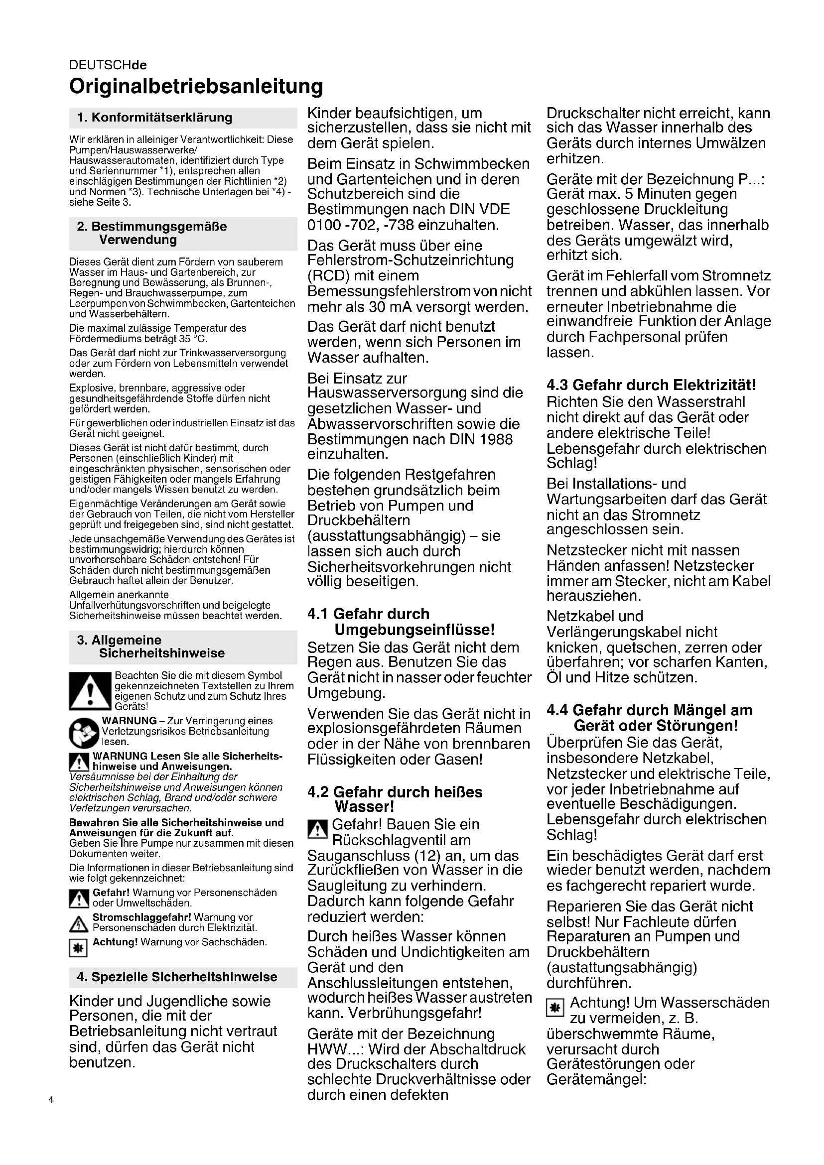 Originalbetriebsanleitung Wir erklären in alleiniger Verantwortlichkeit: Diese Pumpen/Hauswasserwerke/ Hauswasserautomaten, identifiziert durch Type und Seriennummer *1), entsprechen allen einschlägigen Bestimmungen der Richtlinien *2) und Normen *3). Technische Unterlagen bei *4) - siehe Seite 3. Dieses Gerät dient zum Fördern von sauberem Wasser im Haus- und Gartenbereich, zur Beregnung und Bewässerung, als Brunnen-, Regen- und Brauchwasserpumpe, zum Leerpumpen von Schwimmbecken, Gartenteichen und Wasserbehältern. Die maximal zulässige Temperatur des Fördermediums beträgt 35 °C. Das Gerät darf nicht zur Trinkwasserversorgung oder zum Fördern von Lebensmitteln verwendet werden. Explosive, brennbare, aggressive oder gesundheitsgefährdende Stoffe dürfen nicht gefördert werden. Für gewerblichen oder industriellen Einsatz ist das Gerät nicht geeignet. Dieses Gerät ist nicht dafür bestimmt, durch Personen (einschließlich Kinder) mit eingeschränkten physischen, sensorischen oder geistigen Fähigkeiten oder mangels Erfahrung und/oder mangels Wissen benutzt zu werden. Eigenmächtige Veränderungen am Gerät sowie der Gebrauch von Teilen, die nicht vom Hersteller geprüft und freigegeben sind, sind nicht gestattet. Jede unsachgemäße Verwendung des Gerätes ist bestimmungswidrig; hierdurch können unvorhersehbare Schäden entstehen! Für Schäden durch nicht bestimmungsgemäßen Gebrauch haftet allein der Benutzer. Allgemein anerkannte Unfallverhütungsvorschriften und beigelegte Sicherheitshinweise müssen beachtet werden. Beachten Sie die mit diesem Symbol gekennzeichneten Textstellen zu Ihrem eigenen Schutz und zum Schutz Ihres Geräts! WARNUNG – Zur Verringerung eines Verletzungsrisikos Betriebsanleitung lesen. WARNUNG Lesen Sie alle Sicherheits- hinweise und Anweisungen. Versäumnisse bei der Einhaltung der Sicherheitshinweise und Anweisungen können elektrischen Schlag, Brand und/oder schwere Verletzungen verursachen. Bewahren Sie alle Sicherheitshinweise und Anweisungen für die Zukunft auf. Geben Sie Ihre Pumpe nur zusammen mit diesen Dokumenten weiter. Die Informationen in dieser Betriebsanleitung sind wie folgt gekennzeichnet: Gefahr! Warnung vor Personenschäden oder Umweltschäden. Stromschlaggefahr! Warnung vor Personenschäden durch Elektrizität. Achtung! Warnung vor Sachschäden. Kinder und Jugendliche sowie Personen, die mit der Betriebsanleitung nicht vertraut sind, dürfen das Gerät nicht benutzen. Kinder beaufsichtigen, um sicherzustellen, dass sie nicht mit dem Gerät spielen. Beim Einsatz in Schwimmbecken und Gartenteichen und in deren Schutzbereich sind die Bestimmungen nach DIN VDE 0100 -702, -738 einzuhalten. Das Gerät muss über eine Fehlerstrom-Schutzeinrichtung (RCD) mit einem Bemessungsfehlerstrom von nicht mehr als 30 mA versorgt werden. Das Gerät darf nicht benutzt werden, wenn sich Personen im Wasser aufhalten. Bei Einsatz zur Hauswasserversorgung sind die gesetzlichen Wasser- und Abwasservorschriften sowie die Bestimmungen nach DIN 1988 einzuhalten. Die folgenden Restgefahren bestehen grundsätzlich beim Betrieb von Pumpen und Druckbehältern (ausstattungsabhängig) – sie lassen sich auch durch Sicherheitsvorkehrungen nicht völlig beseitigen.