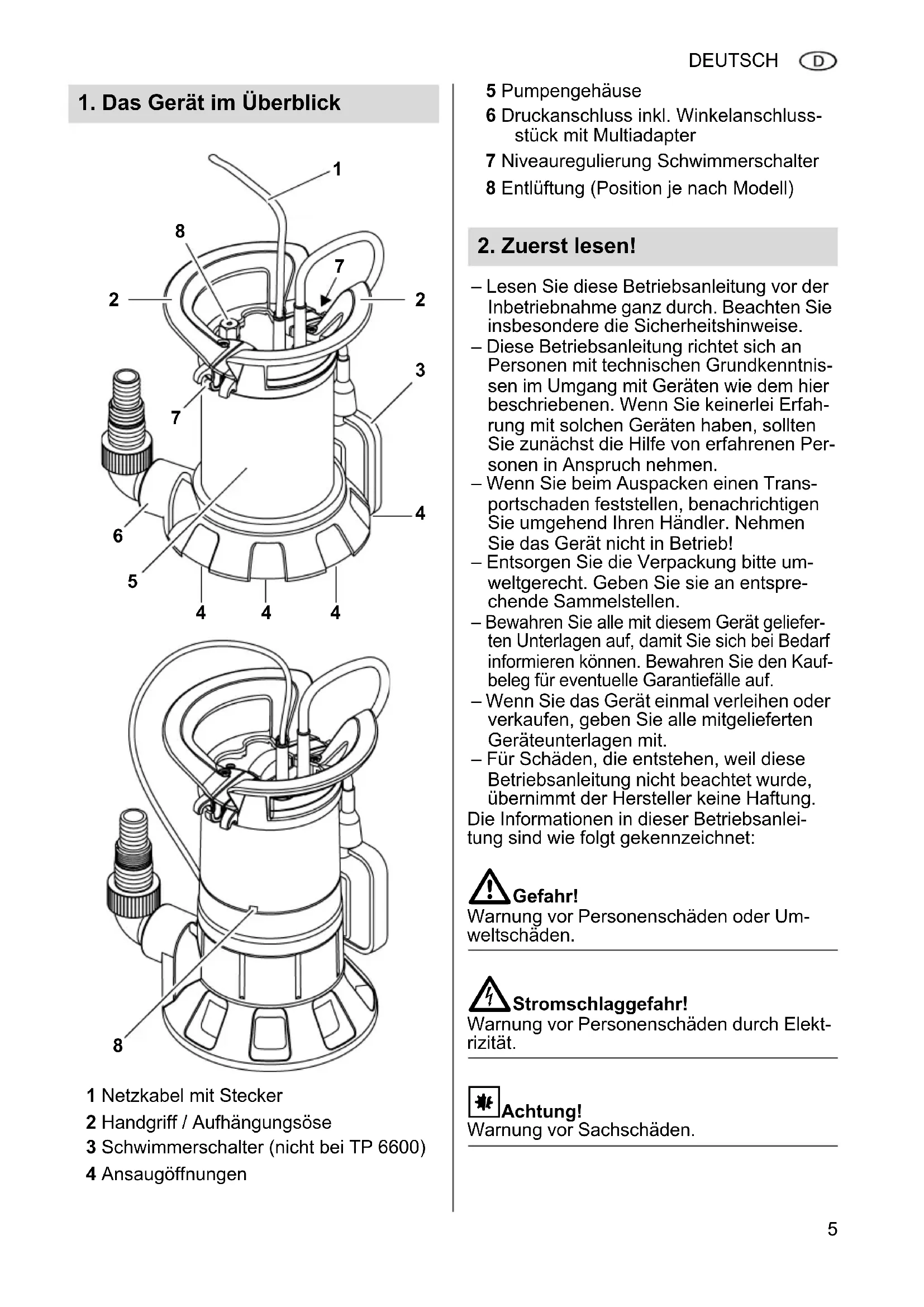 hinweise – Beachten Sie beim Gebrauch dieses Ge- rätes die folgenden Sicherheitshinweise, um Gefahren für Personen oder Sach- schäden auszuschließen. – Beachten Sie gesetzliche Richtlinien oder Unfallverhütungs-Vorschriften für den Um- gang mit Tauchpumpen. – Halten Sie beim Einsatz des Geräts in Schwimmbecken und Gartenteichen und in deren Schutzbereich an die Bestim- mungen nach DIN VDE 0100 -702, -738. Beachten Sie hierzu gegebenenfalls auch örtliche Vorschriften. – Die Absicherung des Gerätes muss mit ei- nem Fehlerstromschutzschalter (RCD) mit einem Bemessungsfehlerstrom von maxi- mal 30 mA erfolgen. AAllgemeine Gefahr! Betreiben Sie das Gerät nicht, wenn sich Personen in Kontakt mit der Förderflüssig- keit befinden (z.B im Schwimmbecken oder Gartenteich)! Die folgenden Restgefahren bestehen grundsätzlich beim Betrieb von Tauchpum- pen – sie lassen sich auch durch Sicher- heitsvorkehrungen nicht völlig beseitigen.