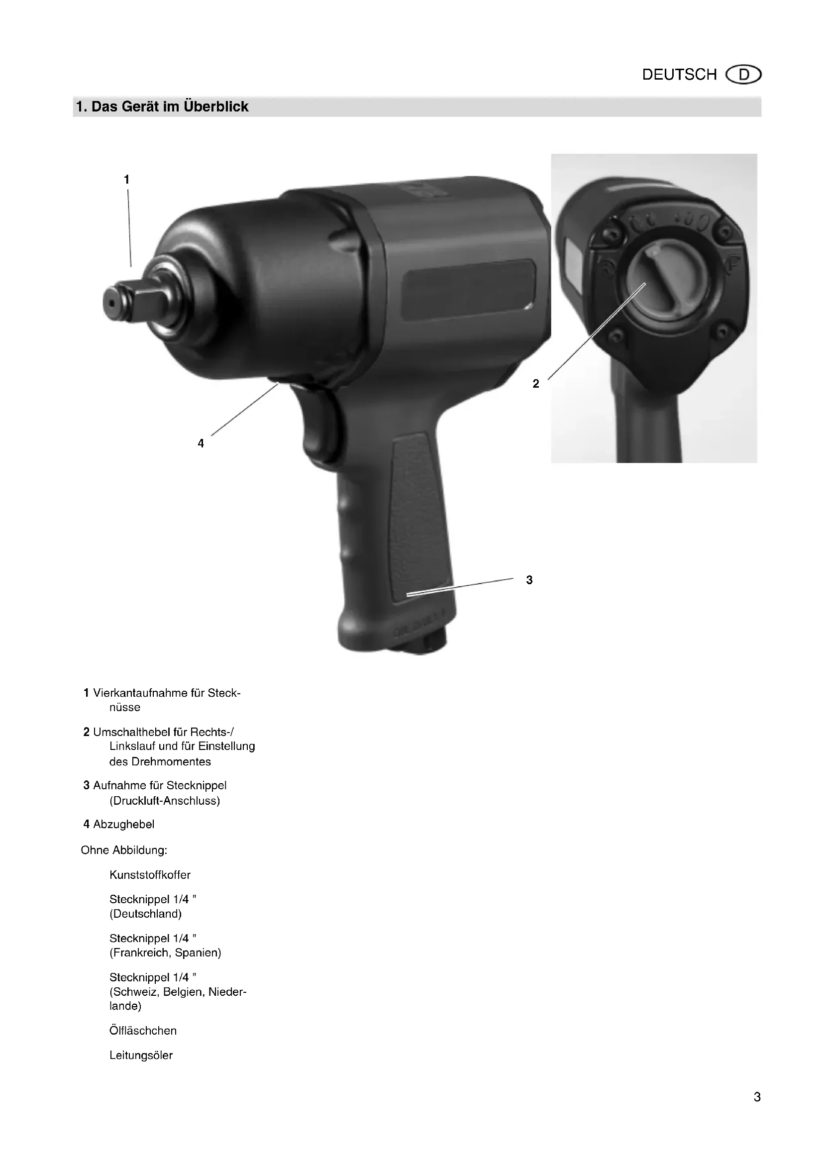 inkslauf und für Einstellung des Drehmomentes 3 Aufnahme für Stecknippel (Druckluft-Anschluss) 4 Abzughebel Ohne Abbildung: Kunststoffkoffer Stecknippel 1/4 " (Deutschland) Stecknippel 1/4 " (Frankreich, Spanien) Stecknippel 1/4 " (Schweiz, Belgien, Nieder- lande) Ölfläschchen Leitungsöler XK0041D2.fm Betriebsanleitung DEUTSCH4 DEUTSCH