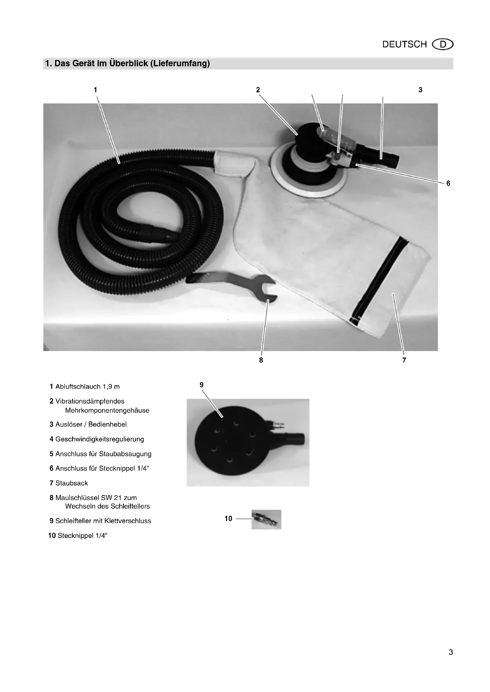1 Abluftschlauch 1,9 m 2 Vibrationsdämpfendes Mehrkomponentengehäuse 3 Auslöser / Bedienhebel 4 Geschwindigkeitsregulierung 5 Anschluss für Staubabsaugung 6 Anschluss für Stecknippel 1/4" 7 Staubsack 8 Maulschlüssel SW 21 zum Wechseln des Schleiftellers 9 Schleifteller mit Klettverschluss 10 Stecknippel 1/4"