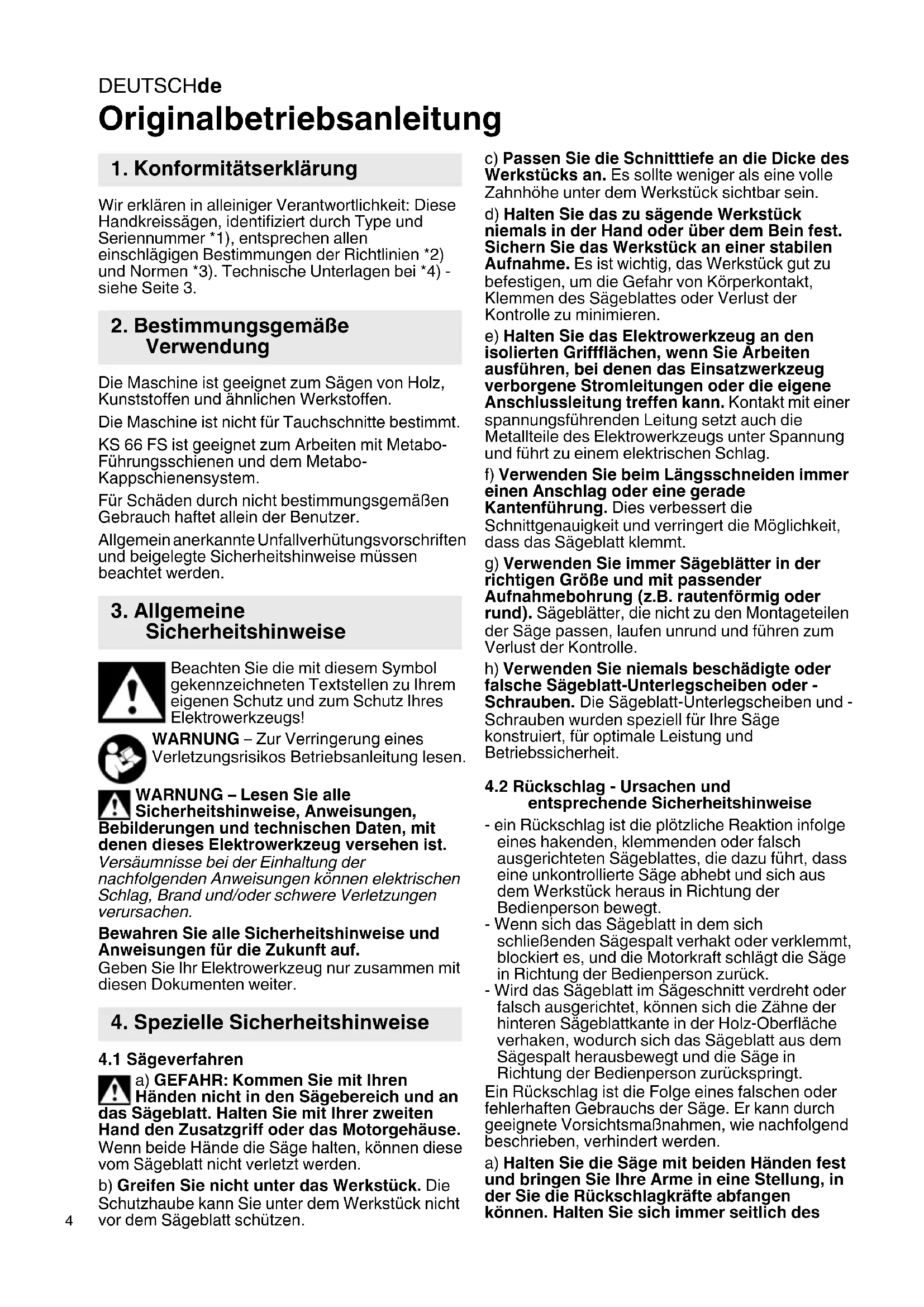 Originalbetriebsanleitung Wir erklären in alleiniger Verantwortlichkeit: Diese Handkreissägen, identifiziert durch Type und Seriennummer *1), entsprechen allen einschlägigen Bestimmungen der Richtlinien *2) und Normen *3). Technische Unterlagen bei *4) - siehe Seite 3. Die Maschine ist geeignet zum Sägen von Holz, Kunststoffen und ähnlichen Werkstoffen. Die Maschine ist nicht für Tauchschnitte bestimmt. KS 66 FS ist geeignet zum Arbeiten mit Metabo- Führungsschienen und dem Metabo- Kappschienensystem. Für Schäden durch nicht bestimmungsgemäßen Gebrauch haftet allein der Benutzer. Allgemein anerkannte Unfallverhütungsvorschriften und beigelegte Sicherheitshinweise müssen beachtet werden. Beachten Sie die mit diesem Symbol gekennzeichneten Textstellen zu Ihrem eigenen Schutz und zum Schutz Ihres Elektrowerkzeugs! WARNUNG – Zur Verringerung eines Verletzungsrisikos Betriebsanleitung lesen. WARNUNG – Lesen Sie alle Sicherheitshinweise, Anweisungen, Bebilderungen und technischen Daten, mit denen dieses Elektrowerkzeug versehen ist. Versäumnisse bei der Einhaltung der nachfolgenden Anweisungen können elektrischen Schlag, Brand und/oder schwere Verletzungen verursachen. Bewahren Sie alle Sicherheitshinweise und Anweisungen für die Zukunft auf. Geben Sie Ihr Elektrowerkzeug nur zusammen mit diesen Dokumenten weiter.