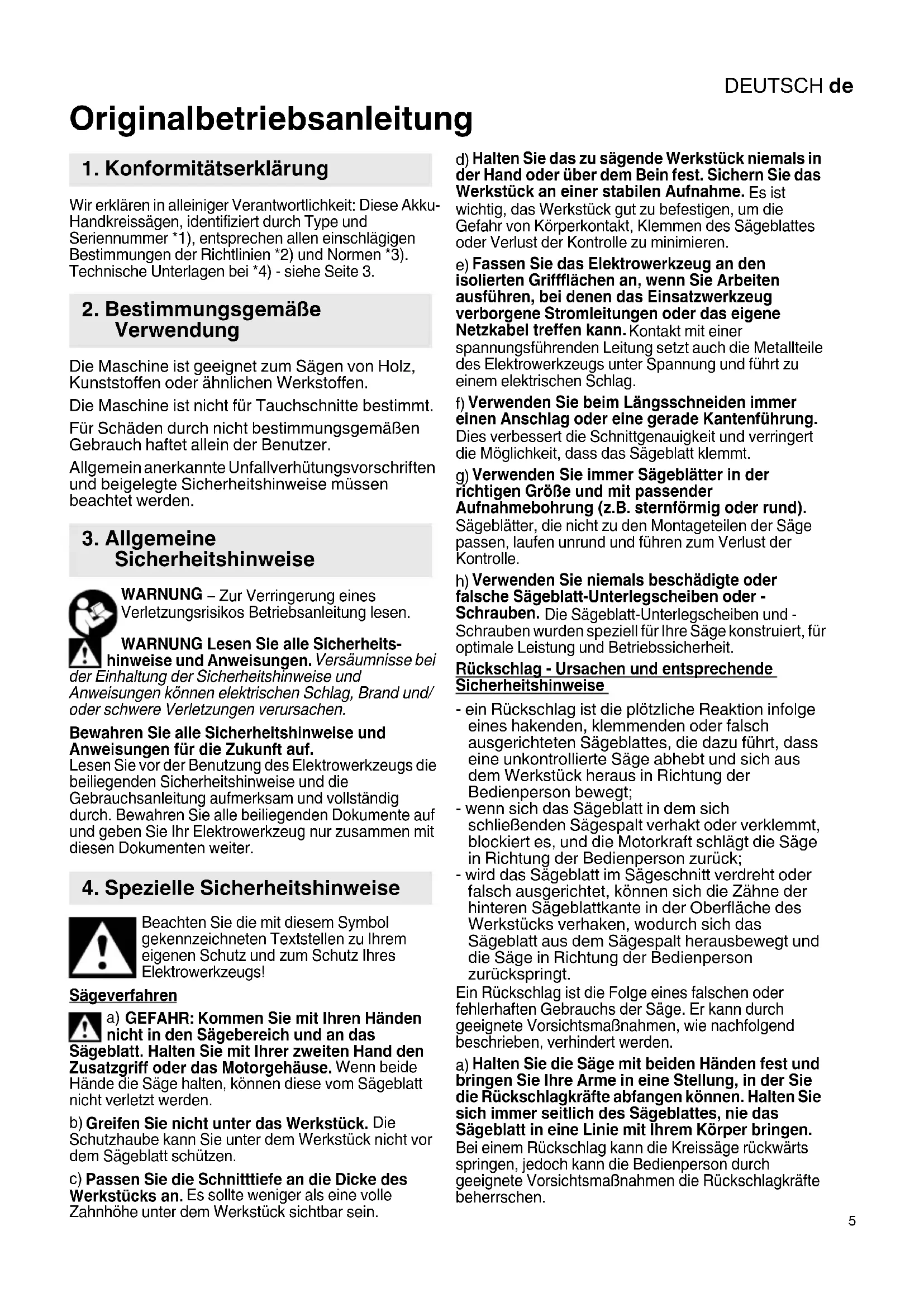Originalbetriebsanleitung Wir erklären in alleiniger Verantwortlichkeit: Diese Akku- Handkreissägen, identifiziert durch Type und Seriennummer *1), entsprechen allen einschlägigen Bestimmungen der Richtlinien *2) und Normen *3). Technische Unterlagen bei *4) - siehe Seite 3. Die Maschine ist geeignet zum Sägen von Holz, Kunststoffen oder ähnlichen Werkstoffen. Die Maschine ist nicht für Tauchschnitte bestimmt. Für Schäden durch nicht bestimmungsgemäßen Gebrauch haftet allein der Benutzer. Allgemein anerkannte Unfallverhütungsvorschriften und beigelegte Sicherheitshinweise müssen beachtet werden. WARNUNG – Zur Verringerung eines Verletzungsrisikos Betriebsanleitung lesen. WARNUNG Lesen Sie alle Sicherheits- hinweise und Anweisungen. Versäumnisse bei der Einhaltung der Sicherheitshinweise und Anweisungen können elektrischen Schlag, Brand und/ oder schwere Verletzungen verursachen. Bewahren Sie alle Sicherheitshinweise und Anweisungen für die Zukunft auf. Lesen Sie vor der Benutzung des Elektrowerkzeugs die beiliegenden Sicherheitshinweise und die Gebrauchsanleitung aufmerksam und vollständig durch. Bewahren Sie alle beiliegenden Dokumente auf und geben Sie Ihr Elektrowerkzeug nur zusammen mit diesen Dokumenten weiter. Beachten Sie die mit diesem Symbol gekennzeichneten Textstellen zu Ihrem eigenen Schutz und zum Schutz Ihres Elektrowerkzeugs! Sägeverfahren