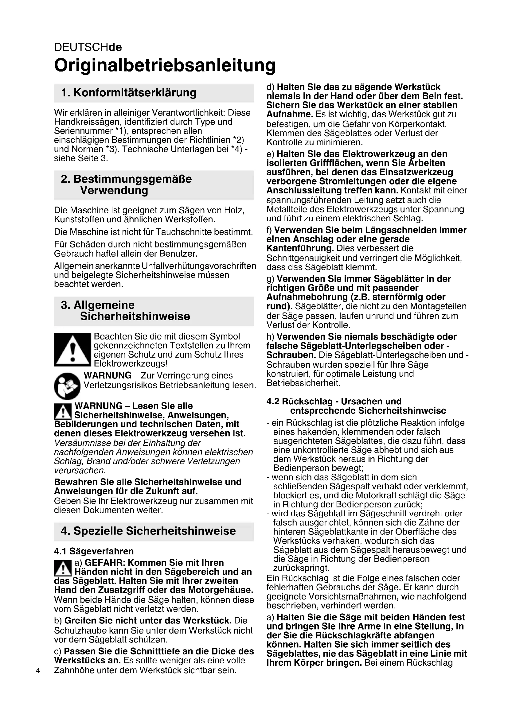 Originalbetriebsanleitung Wir erklären in alleiniger Verantwortlichkeit: Diese Handkreissägen, identifiziert durch Type und Seriennummer *1), entsprechen allen einschlägigen Bestimmungen der Richtlinien *2) und Normen *3). Technische Unterlagen bei *4) - siehe Seite 3. Die Maschine ist geeignet zum Sägen von Holz, Kunststoffen und ähnlichen Werkstoffen. Die Maschine ist nicht für Tauchschnitte bestimmt. Für Schäden durch nicht bestimmungsgemäßen Gebrauch haftet allein der Benutzer. Allgemein anerkannte Unfallverhütungsvorschriften und beigelegte Sicherheitshinweise müssen beachtet werden. Beachten Sie die mit diesem Symbol gekennzeichneten Textstellen zu Ihrem eigenen Schutz und zum Schutz Ihres Elektrowerkzeugs! WARNUNG – Zur Verringerung eines Verletzungsrisikos Betriebsanleitung lesen. WARNUNG – Lesen Sie alle Sicherheitshinweise, Anweisungen, Bebilderungen und technischen Daten, mit denen dieses Elektrowerkzeug versehen ist. Versäumnisse bei der Einhaltung der nachfolgenden Anweisungen können elektrischen Schlag, Brand und/oder schwere Verletzungen verursachen. Bewahren Sie alle Sicherheitshinweise und Anweisungen für die Zukunft auf. Geben Sie Ihr Elektrowerkzeug nur zusammen mit diesen Dokumenten weiter.