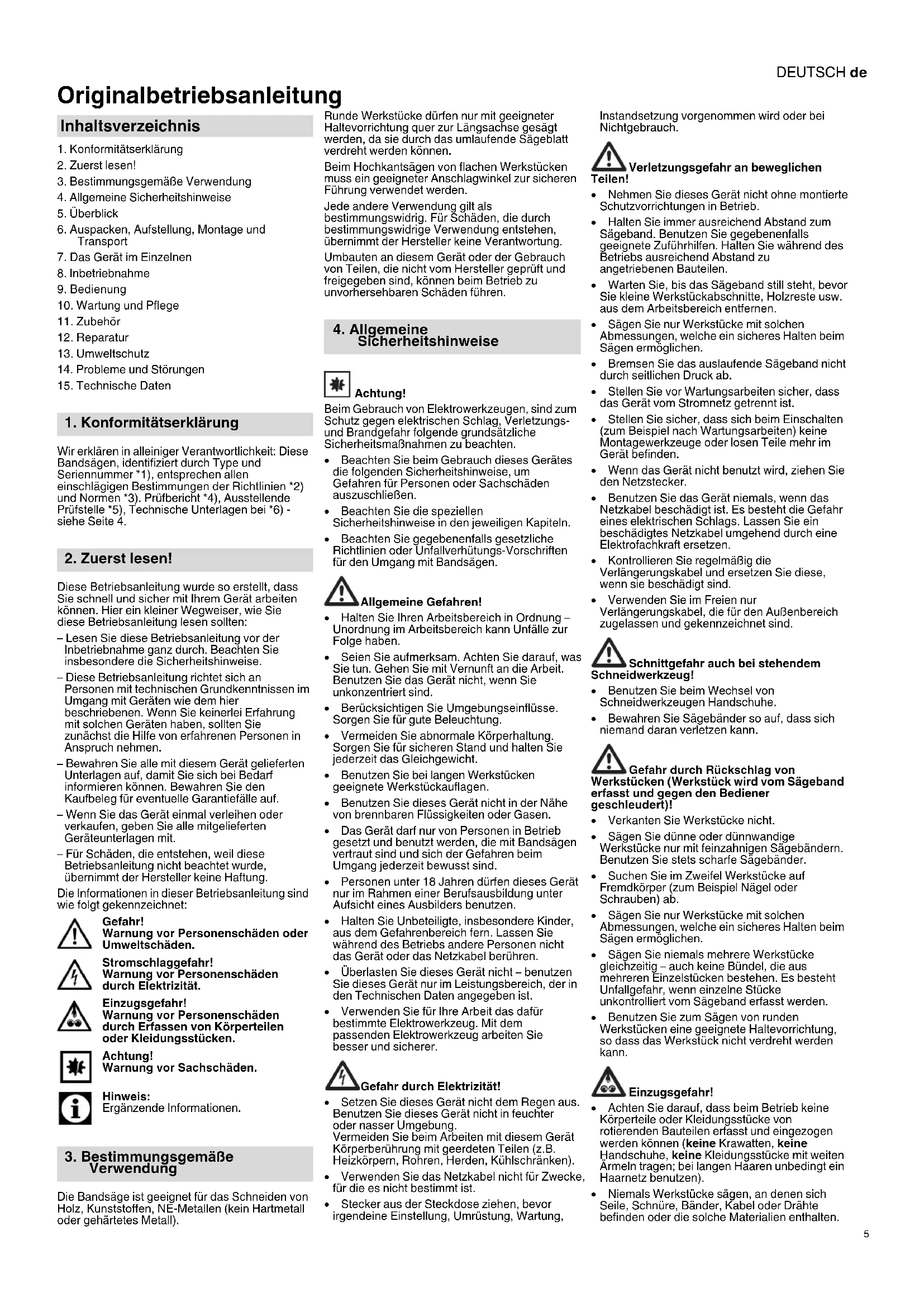 Wir erklären in alleiniger Verantwortlichkeit: Diese Bandsägen, identifiziert durch Type und Seriennummer *1), entsprechen allen einschlägigen Bestimmungen der Richtlinien *2) und Normen *3). Prüfbericht *4), Ausstellende Prüfstelle *5), Technische Unterlagen bei *6) - siehe Seite 4. Diese Betriebsanleitung wurde so erstellt, dass Sie schnell und sicher mit Ihrem Gerät arbeiten können. Hier ein kleiner Wegweiser, wie Sie diese Betriebsanleitung lesen sollten: – Lesen Sie diese Betriebsanleitung vor der Inbetriebnahme ganz durch. Beachten Sie insbesondere die Sicherheitshinweise. – Diese Betriebsanleitung richtet sich an Personen mit technischen Grundkenntnissen im Umgang mit Geräten wie dem hier beschriebenen. Wenn Sie keinerlei Erfahrung mit solchen Geräten haben, sollten Sie zunächst die Hilfe von erfahrenen Personen in Anspruch nehmen. – Bewahren Sie alle mit diesem Gerät gelieferten Unterlagen auf, damit Sie sich bei Bedarf informieren können. Bewahren Sie den Kaufbeleg für eventuelle Garantiefälle auf. – Wenn Sie das Gerät einmal verleihen oder verkaufen, geben Sie alle mitgelieferten Geräteunterlagen mit. – Für Schäden, die entstehen, weil diese Betriebsanleitung nicht beachtet wurde, übernimmt der Hersteller keine Haftung. Die Informationen in dieser Betriebsanleitung sind wie folgt gekennzeichnet: Gefahr! Warnung vor Personenschäden oder Umweltschäden. Stromschlaggefahr! Warnung vor Personenschäden durch Elektrizität. Einzugsgefahr! Warnung vor Personenschäden durch Erfassen von Körperteilen oder Kleidungsstücken. Achtung! Warnung vor Sachschäden. Hinweis: Ergänzende Informationen. Die Bandsäge ist geeignet für das Schneiden von Holz, Kunststoffen, NE-Metallen (kein Hartmetall oder gehärtetes Metall). Runde Werkstücke dürfen nur mit geeigneter Haltevorrichtung quer zur Längsachse gesägt werden, da sie durch das umlaufende Sägeblatt verdreht werden können. Beim Hochkantsägen von flachen Werkstücken muss ein geeigneter Anschlagwinkel zur sicheren Führung verwendet werden. Jede andere Verwendung gilt als bestimmungswidrig. Für Schäden, die durch bestimmungswidrige Verwendung entstehen, übernimmt der Hersteller keine Verantwortung. Umbauten an diesem Gerät oder der Gebrauch von Teilen, die nicht vom Hersteller geprüft und freigegeben sind, können beim Betrieb zu unvorhersehbaren Schäden führen. Achtung! Beim Gebrauch von Elektrowerkzeugen, sind zum Schutz gegen elektrischen Schlag, Verletzungs- und Brandgefahr folgende grundsätzliche Sicherheitsmaßnahmen zu beachten. Beachten Sie beim Gebrauch dieses Gerätes die folgenden Sicherheitshinweise, um Gefahren für Personen oder Sachschäden auszuschließen. Beachten Sie die speziellen Sicherheitshinweise in den jeweiligen Kapiteln. Beachten Sie gegebenenfalls gesetzliche Richtlinien oder Unfallverhütungs-Vorschriften für den Umgang mit Bandsägen. Allgemeine Gefahren! Halten Sie Ihren Arbeitsbereich in Ordnung – Unordnung im Arbeitsbereich kann Unfälle zur Folge haben. Seien Sie aufmerksam. Achten Sie darauf, was Sie tun. Gehen Sie mit Vernunft an die Arbeit. Benutzen Sie das Gerät nicht, wenn Sie unkonzentriert sind. Berücksichtigen Sie Umgebungseinflüsse. Sorgen Sie für gute Beleuchtung. Vermeiden Sie abnormale Körperhaltung. Sorgen Sie für sicheren Stand und halten Sie jederzeit das Gleichgewicht. Benutzen Sie bei langen Werkstücken geeignete Werkstückauflagen. Benutzen Sie dieses Gerät nicht in der Nähe von brennbaren Flüssigkeiten oder Gasen. Das Gerät darf nur von Personen in Betrieb gesetzt und benutzt werden, die mit Bandsägen vertraut sind und sich der Gefahren beim Umgang jederzeit bewusst sind. Personen unter 18 Jahren dürfen dieses Gerät nur im Rahmen einer Berufsausbildung unter Aufsicht eines Ausbilders benutzen. Halten Sie Unbeteiligte, insbesondere Kinder, aus dem Gefahrenbereich fern. Lassen Sie während des Betriebs andere Personen nicht das Gerät oder das Netzkabel berühren. Überlasten Sie dieses Gerät nicht – benutzen Sie dieses Gerät nur im Leistungsbereich, der in den Technischen Daten angegeben ist. Verwenden Sie für Ihre Arbeit das dafür bestimmte Elektrowerkzeug. Mit dem passenden Elektrowerkzeug arbeiten Sie besser und sicherer. Gefahr durch Elektrizität! Setzen Sie dieses Gerät nicht dem Regen aus. Benutzen Sie dieses Gerät nicht in feuchter oder nasser Umgebung. Vermeiden Sie beim Arbeiten mit diesem Gerät Körperberührung mit geerdeten Teilen (z.B. Heizkörpern, Rohren, Herden, Kühlschränken). Verwenden Sie das Netzkabel nicht für Zwecke, für die es nicht bestimmt ist. Stecker aus der Steckdose ziehen, bevor irgendeine Einstellung, Umrüstung, Wartung, Instandsetzung vorgenommen wird oder bei Nichtgebrauch. Verletzungsgefahr an beweglichen Teilen! Nehmen Sie dieses Gerät nicht ohne montierte Schutzvorrichtungen in Betrieb. Halten Sie immer ausreichend Abstand zum Sägeband. Benutzen Sie gegebenenfalls geeignete Zuführhilfen. Halten Sie während des Betriebs ausreichend Abstand zu angetriebenen Bauteilen. Warten Sie, bis das Sägeband still steht, bevor Sie kleine Werkstückabschnitte, Holzreste usw. aus dem Arbeitsbereich entfernen. Sägen Sie nur Werkstücke mit solchen Abmessungen, welche ein sicheres Halten beim Sägen ermöglichen. Bremsen Sie das auslaufende Sägeband nicht durch seitlichen Druck ab. Stellen Sie vor Wartungsarbeiten sicher, dass das Gerät vom Stromnetz getrennt ist. Stellen Sie sicher, dass sich beim Einschalten (zum Beispiel nach Wartungsarbeiten) keine Montagewerkzeuge oder losen Teile mehr im Gerät befinden. Wenn das Gerät nicht benutzt wird, ziehen Sie den Netzstecker. Benutzen Sie das Gerät niemals, wenn das Netzkabel beschädigt ist. Es besteht die Gefahr eines elektrischen Schlags. Lassen Sie ein beschädigtes Netzkabel umgehend durch eine Elektrofachkraft ersetzen. Kontrollieren Sie regelmäßig die Verlängerungskabel und ersetzen Sie diese, wenn sie beschädigt sind. Verwende
