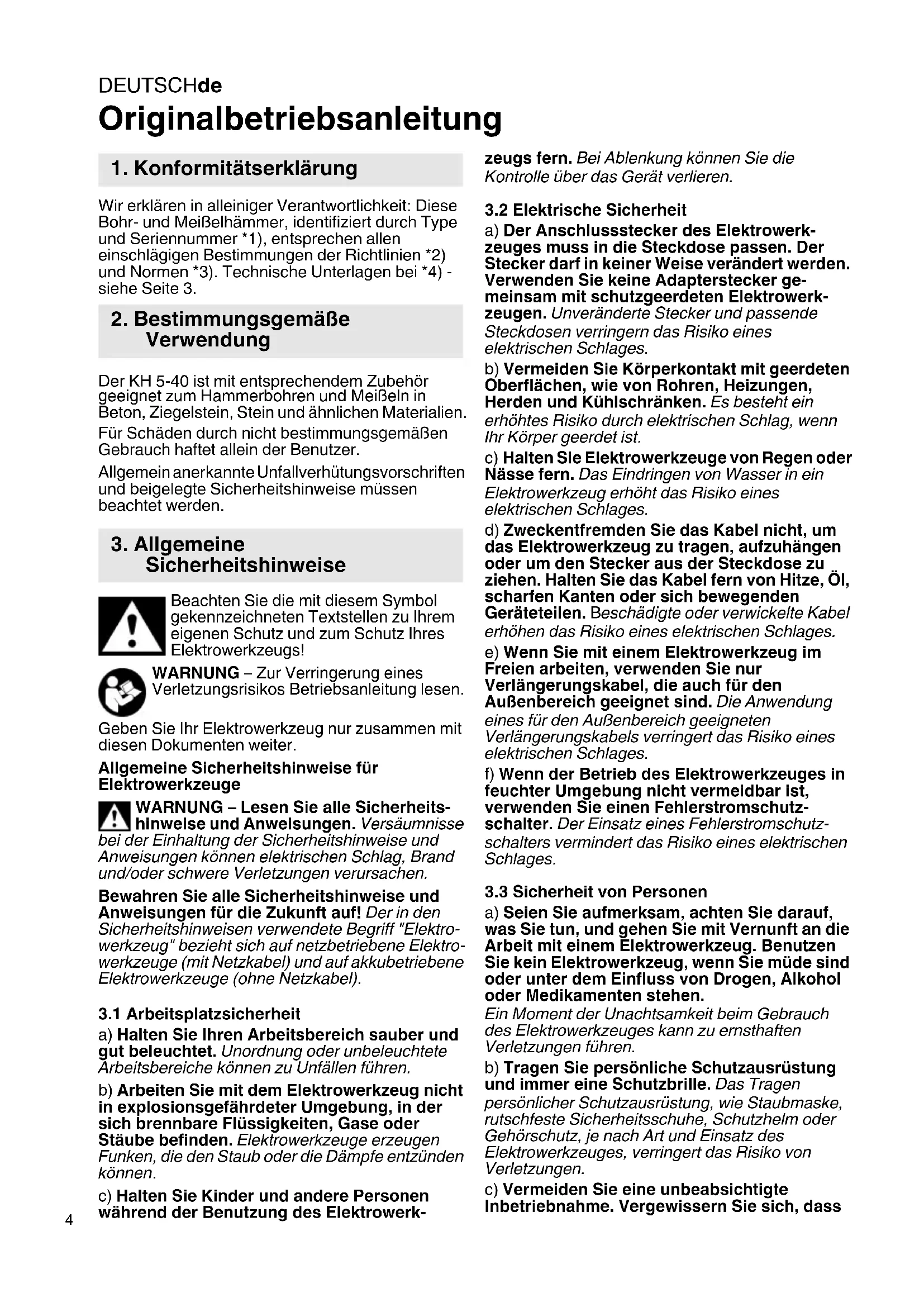 Originalbetriebsanleitung Wir erklären in alleiniger Verantwortlichkeit: Diese Bohr- und Meißelhämmer, identifiziert durch Type und Seriennummer *1), entsprechen allen einschlägigen Bestimmungen der Richtlinien *2) und Normen *3). Technische Unterlagen bei *4) - siehe Seite 3. Der KH 5-40 ist mit entsprechendem Zubehör geeignet zum Hammerbohren und Meißeln in Beton, Ziegelstein, Stein und ähnlichen Materialien. Für Schäden durch nicht bestimmungsgemäßen Gebrauch haftet allein der Benutzer. Allgemein anerkannte Unfallverhütungsvorschriften und beigelegte Sicherheitshinweise müssen beachtet werden. Beachten Sie die mit diesem Symbol gekennzeichneten Textstellen zu Ihrem eigenen Schutz und zum Schutz Ihres Elektrowerkzeugs! WARNUNG – Zur Verringerung eines Verletzungsrisikos Betriebsanleitung lesen. Geben Sie Ihr Elektrowerkzeug nur zusammen mit diesen Dokumenten weiter. Allgemeine Sicherheitshinweise für Elektrowerkzeuge WARNUNG – Lesen Sie alle Sicherheits- hinweise und Anweisungen. Versäumnisse bei der Einhaltung der Sicherheitshinweise und Anweisungen können elektrischen Schlag, Brand und/oder schwere Verletzungen verursachen. Bewahren Sie alle Sicherheitshinweise und Anweisungen für die Zukunft auf! Der in den Sicherheitshinweisen verwendete Begriff "Elektro- werkzeug" bezieht sich auf netzbetriebene Elektro- werkzeuge (mit Netzkabel) und auf akkubetriebene Elektrowerkzeuge (ohne Netzkabel).