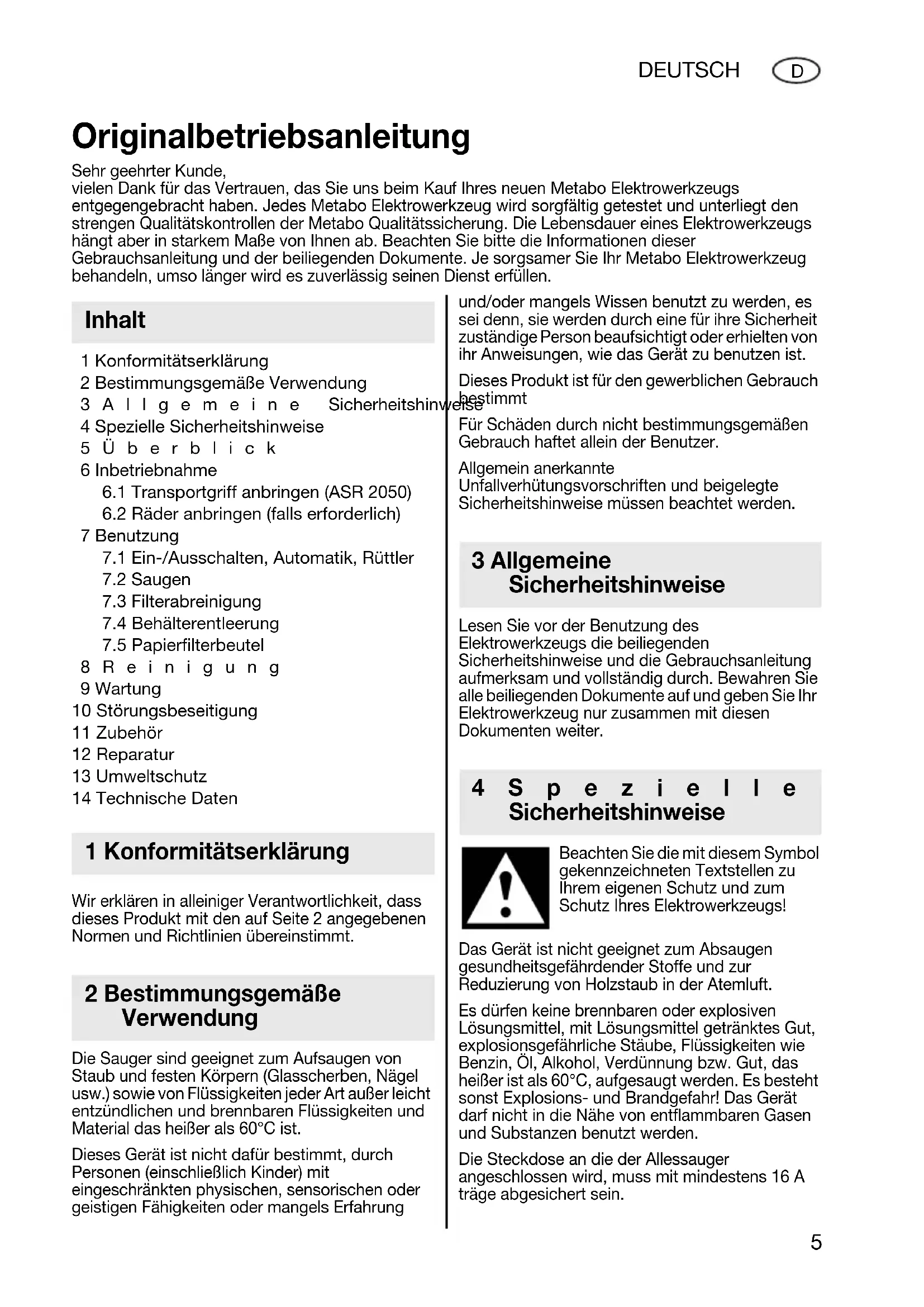 eachten Sie die mit diesem Symbol gekennzeichneten Textstellen zu Ihrem eigenen Schutz und zum Schutz Ihres Elektrowerkzeugs! Das Gerät ist nicht geeignet zum Absaugen gesundheitsgefährdender Stoffe und zur Reduzierung von Holzstaub in der Atemluft. Es dürfen keine brennbaren oder explosiven Lösungsmittel, mit Lösungsmittel getränktes Gut, explosionsgefährliche Stäube, Flüssigkeiten wie Benzin, Öl, Alkohol, Verdünnung bzw. Gut, das heißer ist als 60°C, aufgesaugt werden. Es besteht sonst Explosions- und Brandgefahr! Das Gerät darf nicht in die Nähe von entflammbaren Gasen und Substanzen benutzt werden. Die Steckdose an die der Allessauger angeschlossen wird, muss mit mindestens 16 A träge abgesichert sein. Originalbetriebsanleitung Sehr geehrter Kunde, vielen Dank für das Vertrauen, das Sie uns beim Kauf Ihres neuen Metabo Elektrowerkzeugs entgegengebracht haben. Jedes Metabo Elektrowerkzeug wird sorgfältig getestet und unterliegt den strengen Qualitätskontrollen der Metabo Qualitätssicherung. Die Lebensdauer eines Elektrowerkzeugs hängt aber in starkem Maße von Ihnen ab. Beachten Sie bitte die Informationen dieser Gebrauchsanleitung und der beiliegenden Dokumente. Je sorgsamer Sie Ihr Metabo Elektrowerkzeug behandeln, umso länger wird es zuverlässig seinen Dienst erfüllen. Inhalt 1 Konformitätserklärung 2 Bestimmungsgemäße Verwendung 3 Allgemeine Sicherheitshinweise 4Spezielle Sicherheitshinweise 17026696_0810 ASR 2025 und ASR 2050.book Seite 5 Mittwoch, 18. August 2010 5:10 176 DEUTSCH