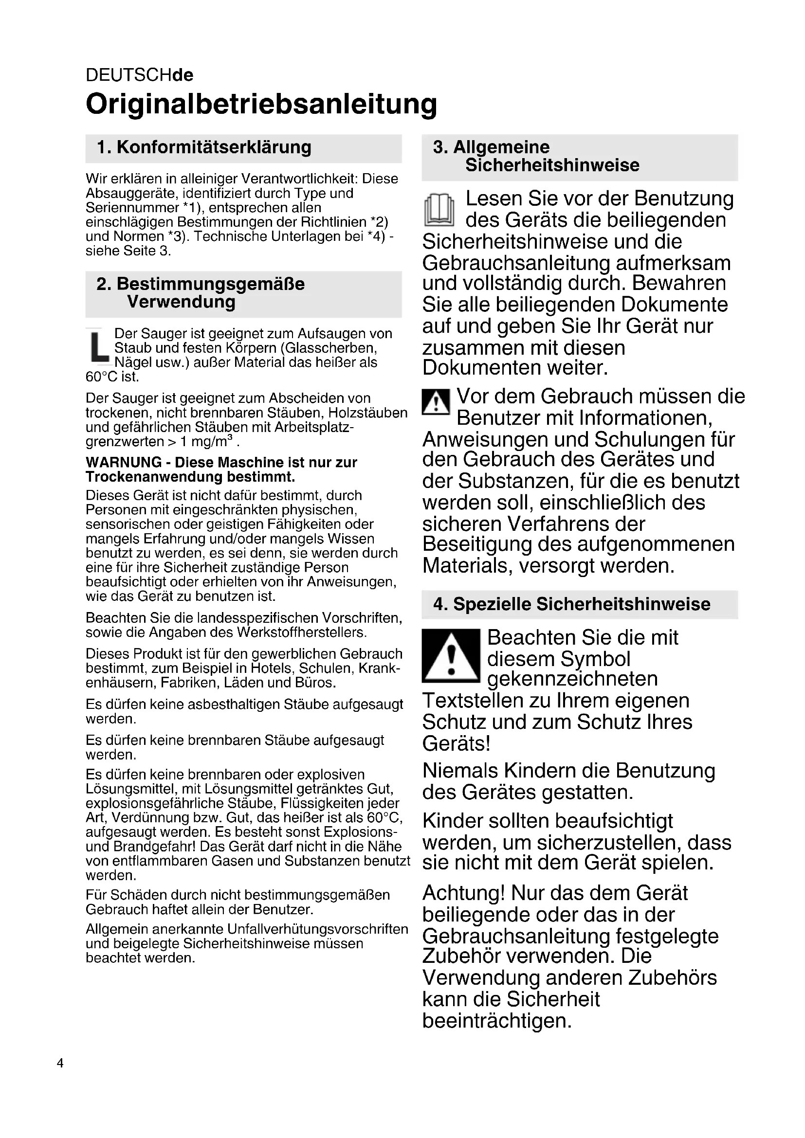 Originalbetriebsanleitung Wir erklären in alleiniger Verantwortlichkeit: Diese Absauggeräte, identifiziert durch Type und Seriennummer *1), entsprechen allen einschlägigen Bestimmungen der Richtlinien *2) und Normen *3). Technische Unterlagen bei *4) - siehe Seite 3. Der Sauger ist geeignet zum Aufsaugen von Staub und festen Körpern (Glasscherben, Nägel usw.) außer Material das heißer als 60°C ist. Der Sauger ist geeignet zum Abscheiden von trockenen, nicht brennbaren Stäuben, Holzstäuben und gefährlichen Stäuben mit Arbeitsplatz- grenzwerten > 1 mg/m³ . WARNUNG - Diese Maschine ist nur zur Trockenanwendung bestimmt. Dieses Gerät ist nicht dafür bestimmt, durch Personen mit eingeschränkten physischen, sensorischen oder geistigen Fähigkeiten oder mangels Erfahrung und/oder mangels Wissen benutzt zu werden, es sei denn, sie werden durch eine für ihre Sicherheit zuständige Person beaufsichtigt oder erhielten von ihr Anweisungen, wie das Gerät zu benutzen ist. Beachten Sie die landesspezifischen Vorschriften, sowie die Angaben des Werkstoffherstellers. Dieses Produkt ist für den gewerblichen Gebrauch bestimmt, zum Beispiel in Hotels, Schulen, Krank- enhäusern, Fabriken, Läden und Büros. Es dürfen keine asbesthaltigen Stäube aufgesaugt werden. Es dürfen keine brennbaren Stäube aufgesaugt werden. Es dürfen keine brennbaren oder explosiven Lösungsmittel, mit Lösungsmittel getränktes Gut, explosionsgefährliche Stäube, Flüssigkeiten jeder Art, Verdünnung bzw. Gut, das heißer ist als 60°C, aufgesaugt werden. Es besteht sonst Explosions- und Brandgefahr! Das Gerät darf nicht in die Nähe von entflammbaren Gasen und Substanzen benutzt werden. Für Schäden durch nicht bestimmungsgemäßen Gebrauch haftet allein der Benutzer. Allgemein anerkannte Unfallverhütungsvorschriften und beigelegte Sicherheitshinweise müssen beachtet werden. Lesen Sie vor der Benutzung des Geräts die beiliegenden Sicherheitshinweise und die Gebrauchsanleitung aufmerksam und vollständig durch. Bewahren Sie alle beiliegenden Dokumente auf und geben Sie Ihr Gerät nur zusammen mit diesen Dokumenten weiter. Vor dem Gebrauch müssen die Benutzer mit Informationen, Anweisungen und Schulungen für den Gebrauch des Gerätes und der Substanzen, für die es benutzt werden soll, einschließlich des sicheren Verfahrens der Beseitigung des aufgenommenen Materials, versorgt werden. Beachten Sie die mit diesem Symbol gekennzeichneten Textstellen zu Ihrem eigenen Schutz und zum Schutz Ihres Geräts! Niemals Kindern die Benutzung des Gerätes gestatten. Kinder sollten beaufsichtigt werden, um sicherzustellen, dass sie nicht mit dem Gerät spielen. Achtung! Nur das dem Gerät beiliegende oder das in der Gebrauchsanleitung festgelegte Zubehör verwenden. Die Verwendung anderen Zubehörs kann die Sicherheit beeinträchtigen.