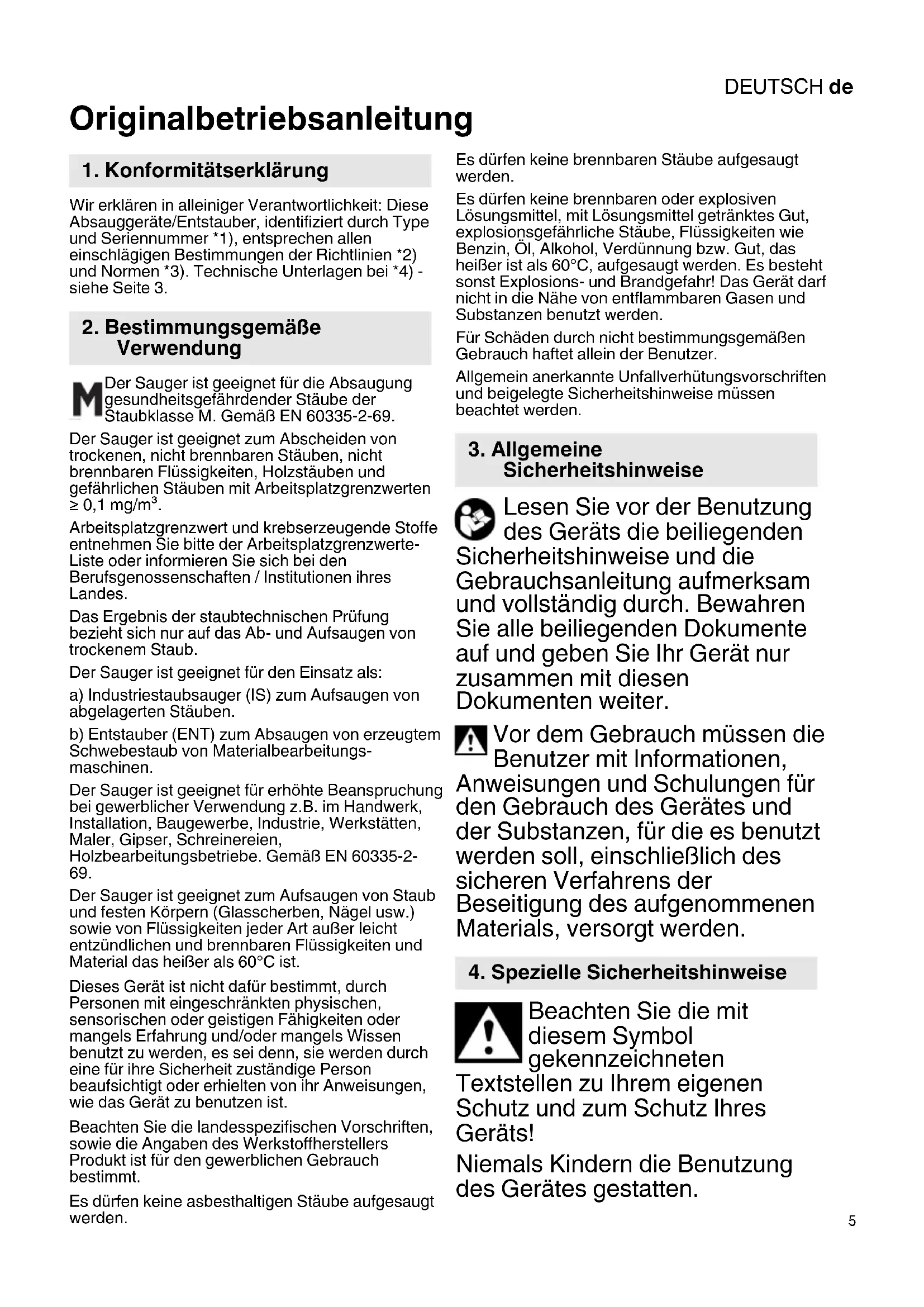 Originalbetriebsanleitung Wir erklären in alleiniger Verantwortlichkeit: Diese Absauggeräte/Entstauber, identifiziert durch Type und Seriennummer *1), entsprechen allen einschlägigen Bestimmungen der Richtlinien *2) und Normen *3). Technische Unterlagen bei *4) - siehe Seite 3. Der Sauger ist geeignet für die Absaugung gesundheitsgefährdender Stäube der Staubklasse M. Gemäß EN 60335-2-69. Der Sauger ist geeignet zum Abscheiden von trockenen, nicht brennbaren Stäuben, nicht brennbaren Flüssigkeiten, Holzstäuben und gefährlichen Stäuben mit Arbeitsplatzgrenzwerten ≥ 0,1 mg/m³. Arbeitsplatzgrenzwert und krebserzeugende Stoffe entnehmen Sie bitte der Arbeitsplatzgrenzwerte- Liste oder informieren Sie sich bei den Berufsgenossenschaften / Institutionen ihres Landes. Das Ergebnis der staubtechnischen Prüfung bezieht sich nur auf das Ab- und Aufsaugen von trockenem Staub. Der Sauger ist geeignet für den Einsatz als: a) Industriestaubsauger (IS) zum Aufsaugen von abgelagerten Stäuben. b) Entstauber (ENT) zum Absaugen von erzeugtem Schwebestaub von Materialbearbeitungs- maschinen. Der Sauger ist geeignet für erhöhte Beanspruchung bei gewerblicher Verwendung z.B. im Handwerk, Installation, Baugewerbe, Industrie, Werkstätten, Maler, Gipser, Schreinereien, Holzbearbeitungsbetriebe. Gemäß EN 60335-2-