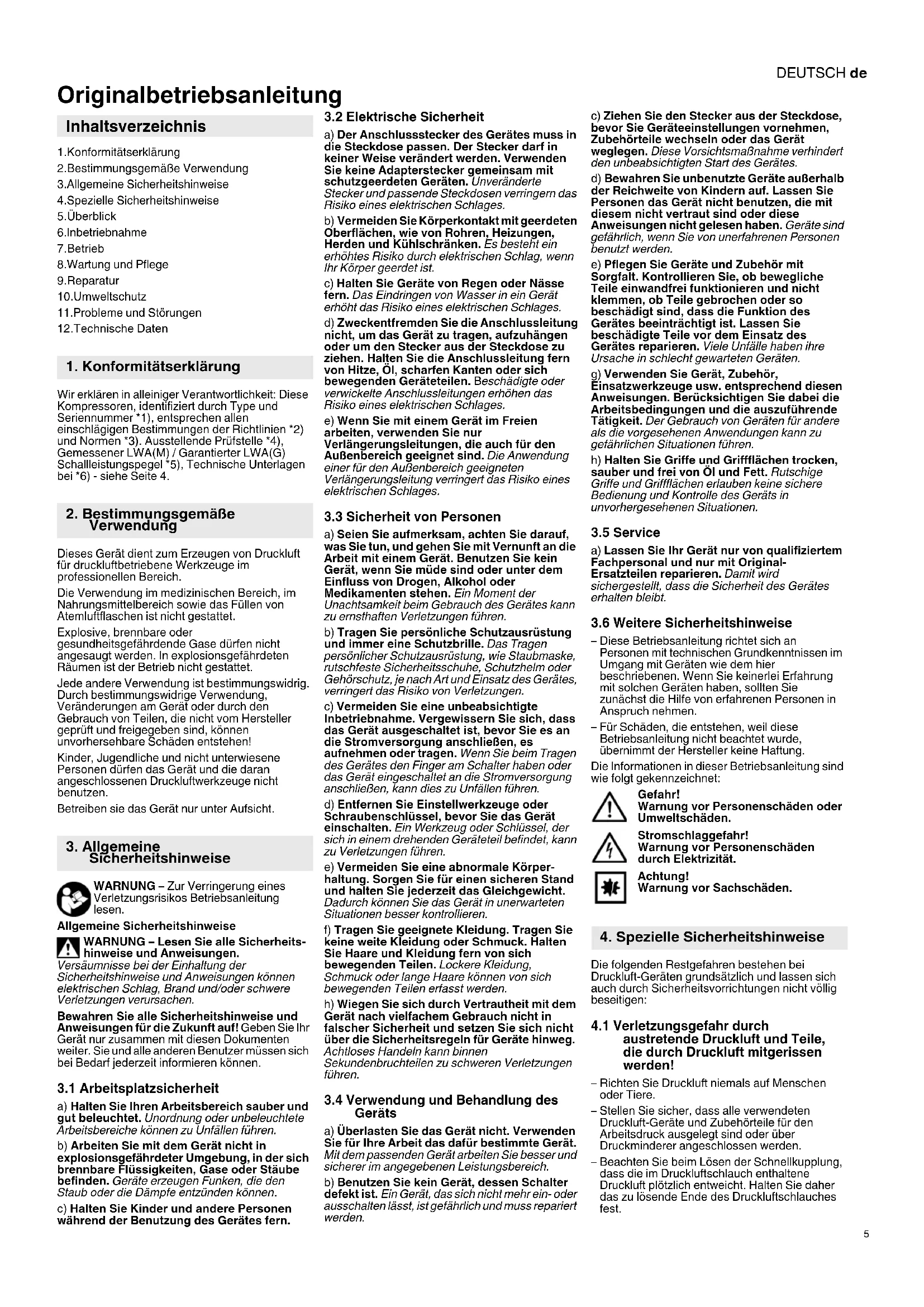 Originalbetriebsanleitung 1.Konformitätserklärung 2.Bestimmungsgemäße Verwendung 3.Allgemeine Sicherheitshinweise 4.Spezielle Sicherheitshinweise 5.Überblick 6.Inbetriebnahme 7.Betrieb 8.Wartung und Pflege 9.Reparatur 10.Umweltschutz 11.Probleme und Störungen 12.Technische Daten Wir erklären in alleiniger Verantwortlichkeit: Diese Kompressoren, identifiziert durch Type und Seriennummer *1), entsprechen allen einschlägigen Bestimmungen der Richtlinien *2) und Normen *3). Ausstellende Prüfstelle *4), Gemessener LWA(M) / Garantierter LWA(G) Schallleistungspegel *5), Technische Unterlagen bei *6) - siehe Seite 4. Dieses Gerät dient zum Erzeugen von Druckluft für druckluftbetriebene Werkzeuge im professionellen Bereich. Die Verwendung im medizinischen Bereich, im Nahrungsmittelbereich sowie das Füllen von Atemluftflaschen ist nicht gestattet. Explosive, brennbare oder gesundheitsgefährdende Gase dürfen nicht angesaugt werden. In explosionsgefährdeten Räumen ist der Betrieb nicht gestattet. Jede andere Verwendung ist bestimmungswidrig. Durch bestimmungswidrige Verwendung, Veränderungen am Gerät oder durch den Gebrauch von Teilen, die nicht vom Hersteller geprüft und freigegeben sind, können unvorhersehbare Schäden entstehen! Kinder, Jugendliche und nicht unterwiesene Personen dürfen das Gerät und die daran angeschlossenen Druckluftwerkzeuge nicht benutzen. Betreiben sie das Gerät nur unter Aufsicht. WARNUNG – Zur Verringerung eines Verletzungsrisikos Betriebsanleitung lesen. Allgemeine Sicherheitshinweise WARNUNG – Lesen Sie alle Sicherheits- hinweise und Anweisungen. Versäumnisse bei der Einhaltung der Sicherheitshinweise und Anweisungen können elektrischen Schlag, Brand und/oder schwere Verletzungen verursachen. Bewahren Sie alle Sicherheitshinweise und Anweisungen für die Zukunft auf! Geben Sie Ihr Gerät nur zusammen mit diesen Dokumenten weiter. Sie und alle anderen Benutzer müssen sich bei Bedarf jederzeit informieren können.