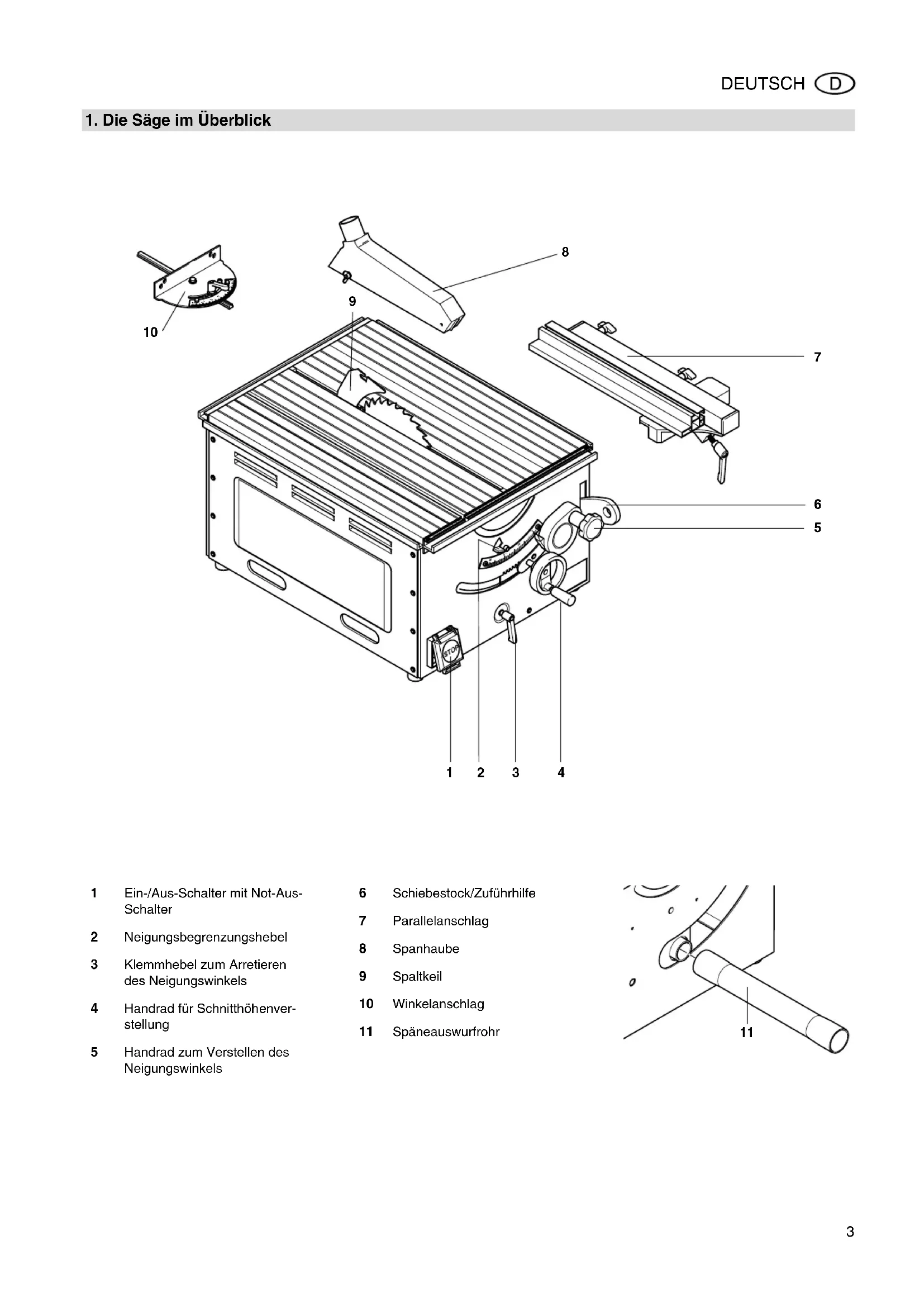1 Ein-/Aus-Schalter mit Not-Aus- Schalter 2 Neigungsbegrenzungshebel 3 Klemmhebel zum Arretieren des Neigungswinkels 4 Handrad für Schnitthöhenver- stellung 5 Handrad zum Verstellen des Neigungswinkels 6 Schiebestock/Zuführhilfe 7 Parallelanschlag 8 Spanhaube 9 Spaltkeil 10 Winkelanschlag 11 Späneauswurfrohr