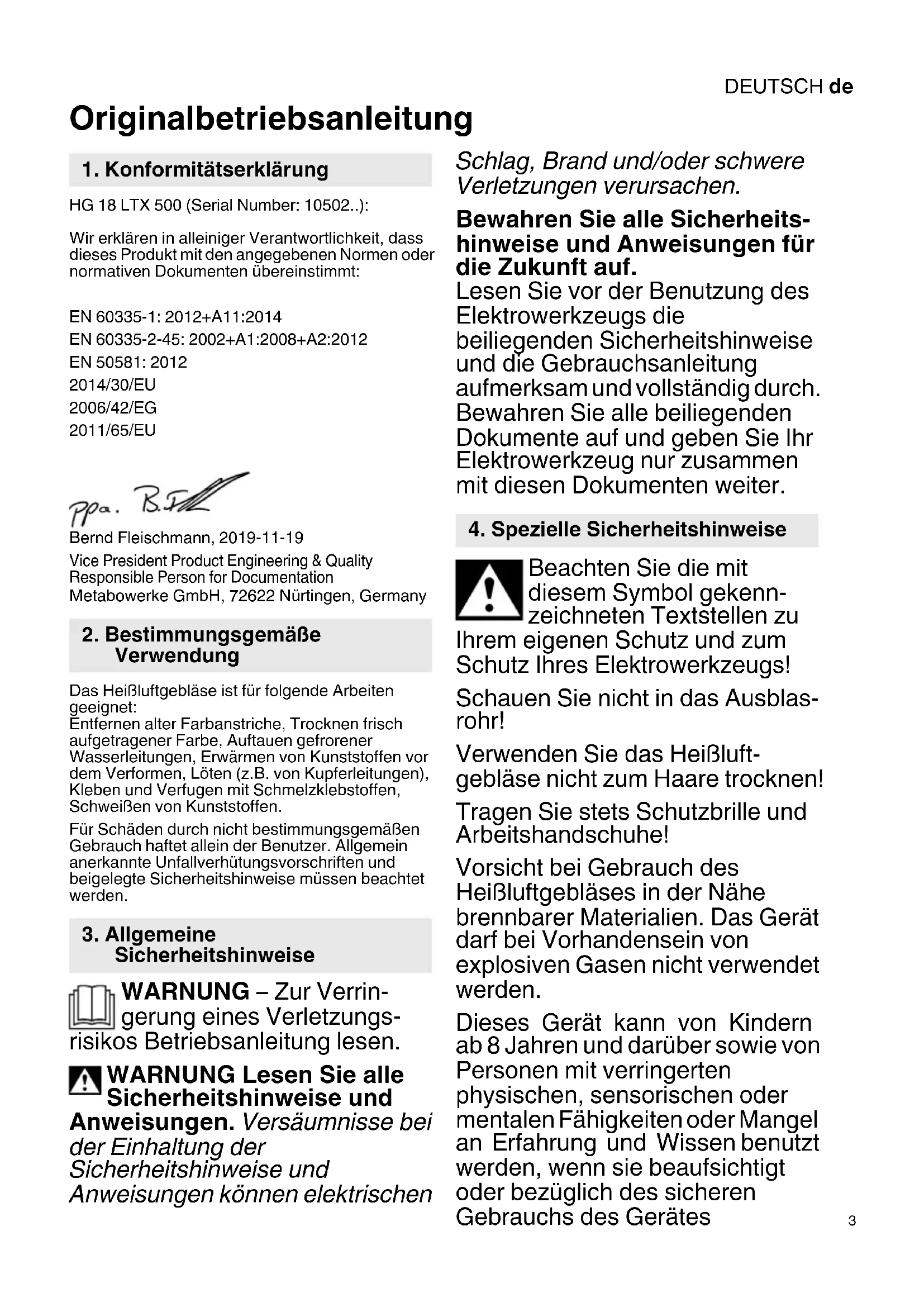 Originalbetriebsanleitung HG 18 LTX 500 (Serial Number: 10502..): Wir erklären in alleiniger Verantwortlichkeit, dass dieses Produkt mit den angegebenen Normen oder normativen Dokumenten übereinstimmt: EN 60335-1: 2012+A11:2014 EN 60335-2-45: 2002+A1:2008+A2:2012 EN 50581: 2012 2014/30/EU 2006/42/EG 2011/65/EU Bernd Fleischmann, 2019-11-19 Vice President Product Engineering & Quality Responsible Person for Documentation Metabowerke GmbH, 72622 Nürtingen, Germany Das Heißluftgebläse ist für folgende Arbeiten geeignet: Entfernen alter Farbanstriche, Trocknen frisch aufgetragener Farbe, Auftauen gefrorener Wasserleitungen, Erwärmen von Kunststoffen vor dem Verformen, Löten (z.B. von Kupferleitungen), Kleben und Verfugen mit Schmelzklebstoffen, Schweißen von Kunststoffen. Für Schäden durch nicht bestimmungsgemäßen Gebrauch haftet allein der Benutzer. Allgemein anerkannte Unfallverhütungsvorschriften und beigelegte Sicherheitshinweise müssen beachtet werden. WARNUNG – Zur Verrin- gerung eines Verletzungs- risikos Betriebsanleitung lesen. WARNUNG Lesen Sie alle Sicherheitshinweise und Anweisungen. Versäumnisse bei der Einhaltung der Sicherheitshinweise und Anweisungen können elektrischen Schlag, Brand und/oder schwere Verletzungen verursachen. Bewahren Sie alle Sicherheits- hinweise und Anweisungen für die Zukunft auf. Lesen Sie vor der Benutzung des Elektrowerkzeugs die beiliegenden Sicherheitshinweise und die Gebrauchsanleitung aufmerksam und vollständig durch. Bewahren Sie alle beiliegenden Dokumente auf und geben Sie Ihr Elektrowerkzeug nur zusammen mit diesen Dokumenten weiter. Beachten Sie die mit diesem Symbol gekenn- zeichneten Textstellen zu Ihrem eigenen Schutz und zum Schutz Ihres Elektrowerkzeugs! Schauen Sie nicht in das Ausblas- rohr! Verwenden Sie das Heißluft- gebläse nicht zum Haare trocknen! Tragen Sie stets Schutzbrille und Arbeitshandschuhe! Vorsicht bei Gebrauch des Heißluftgebläses in der Nähe brennbarer Materialien. Das Gerät darf bei Vorhandensein von explosiven Gasen nicht verwendet werden. Dieses Gerät kann von Kindern ab 8 Jahren und darüber sowie von Personen mit verringerten physischen, sensorischen oder mentalen Fähigkeiten oder Mangel an Erfahrung und Wissen benutzt werden, wenn sie beaufsichtigt oder bezüglich des sicheren Gebrauchs des Gerätes