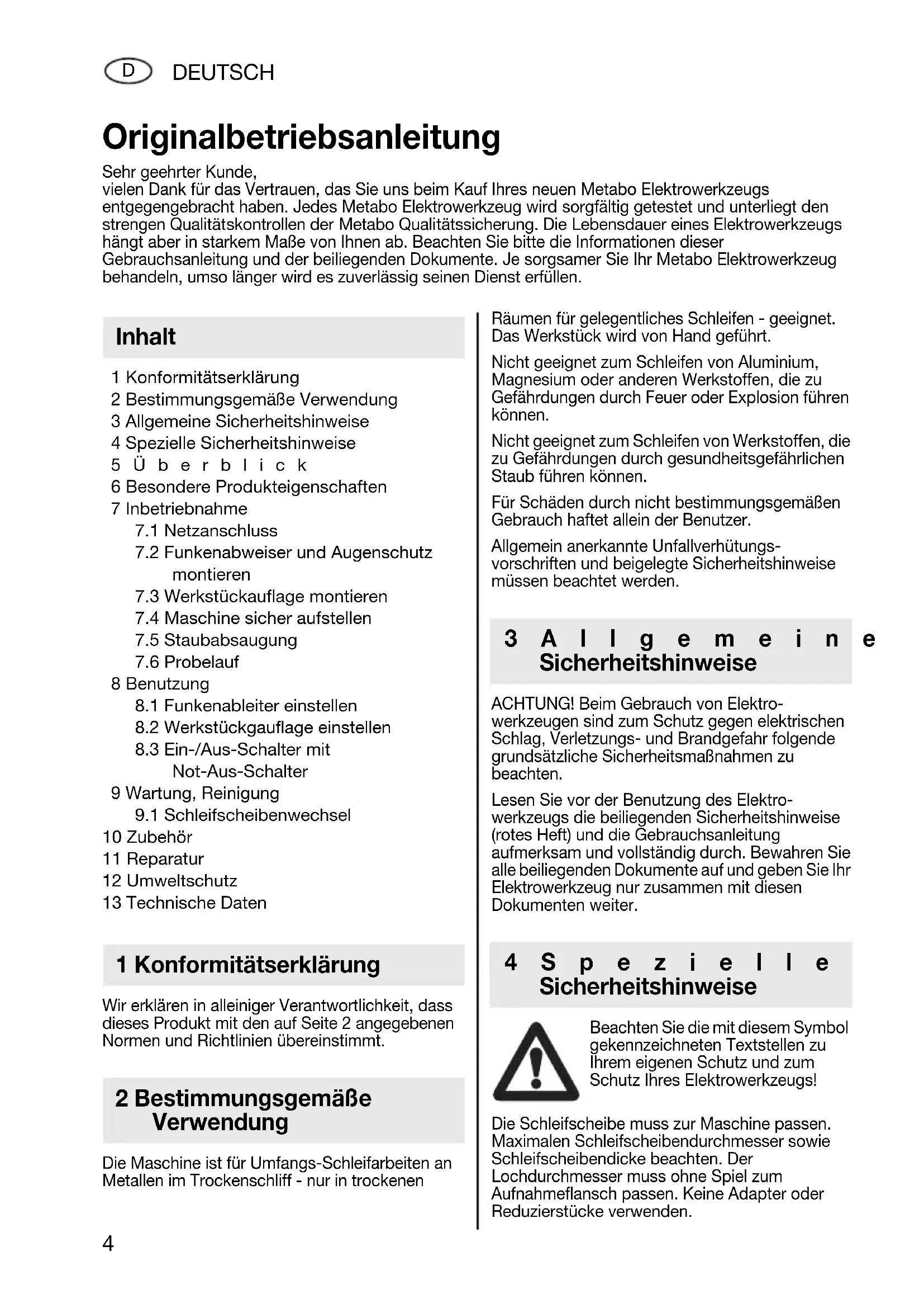 10 Zubehör 11 Reparatur 12 Umweltschutz 13 Technische Daten Wir erklären in alleiniger Verantwortlichkeit, dass dieses Produkt mit den auf Seite 2 angegebenen Normen und Richtlinien übereinstimmt. Die Maschine ist für Umfangs-Schleifarbeiten an Metallen im Trockenschliff - nur in trockenen Räumen für gelegentliches Schleifen - geeignet. Das Werkstück wird von Hand geführt. Nicht geeignet zum Schleifen von Aluminium, Magnesium oder anderen Werkstoffen, die zu Gefährdungen durch Feuer oder Explosion führen können. Nicht geeignet zum Schleifen von Werkstoffen, die zu Gefährdungen durch gesundheitsgefährlichen Staub führen können. Für Schäden durch nicht bestimmungsgemäßen Gebrauch haftet allein der Benutzer. Allgemein anerkannte Unfallverhütungs- vorschriften und beigelegte Sicherheitshinweise müssen beachtet werden. ACHTUNG! Beim Gebrauch von Elektro- werkzeugen sind zum Schutz gegen elektrischen Schlag, Verletzungs- und Brandgefahr folgende grundsätzliche Sicherheitsmaßnahmen zu beachten. Lesen Sie vor der Benutzung des Elektro- werkzeugs die beiliegenden Sicherheitshinweise (rotes Heft) und die Gebrauchsanleitung aufmerksam und vollständig durch. Bewahren Sie alle beiliegenden Dokumente auf und geben Sie Ihr Elektrowerkzeug nur zusammen mit diesen Dokumenten weiter. Beachten Sie die mit diesem Symbol gekennzeichneten Textstellen zu Ihrem eigenen Schutz und zum Schutz Ihres Elektrowerkzeugs! Die Schleifscheibe muss zur Maschine passen. Maximalen Schleifscheibendurchmesser sowie Schleifscheibendicke beachten. Der Lochdurchmesser muss ohne Spiel zum Aufnahmeflansch passen. Keine Adapter oder Reduzierstücke verwenden. Originalbetriebsanleitung Sehr geehrter Kunde, vielen Dank für das Vertrauen, das Sie uns beim Kauf Ihres neuen Metabo Elektrowerkzeugs entgegengebracht haben. Jedes Metabo Elektrowerkzeug wird sorgfältig getestet und unterliegt den strengen Qualitätskontrollen der Metabo Qualitätssicherung. Die Lebensdauer eines Elektrowerkzeugs hängt aber in starkem Maße von Ihnen ab. Beachten Sie bitte die Informationen dieser Gebrauchsanleitung und der beiliegenden Dokumente. Je sorgsamer Sie Ihr Metabo Elektrowerkzeug behandeln, umso länger wird es zuverlässig seinen Dienst erfüllen. Inhalt 1 Konformitätserklärung 2 Bestimmungsgemäße Verwendung 3Allgemeine Sicherheitshinweise 4Spezielle Sicherheitshinweise 17026794_1208 Ds W 5175 9200 D 6175 9201.book Seite 4 Freitag, 14. November 2008 9:55 09DEUTSCH