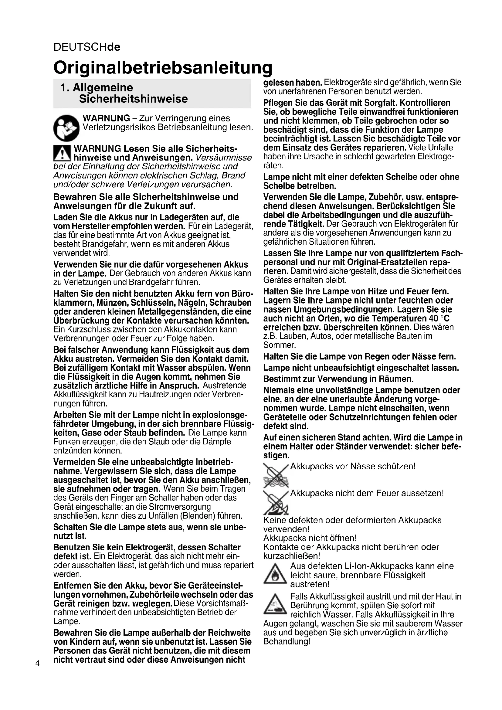 WARNUNG – Zur Verringerung eines Verletzungsrisikos Betriebsanleitung lesen. WARNUNG Lesen Sie alle Sicherheits- hinweise und Anweisungen. Versäumnisse bei der Einhaltung der Sicherheitshinweise und Anweisungen können elektrischen Schlag, Brand und/oder schwere Verletzungen verursachen. Bewahren Sie alle Sicherheitshinweise und Anweisungen für die Zukunft auf. Laden Sie die Akkus nur in Ladegeräten auf, die vom Hersteller empfohlen werden. Für ein Ladegerät, das für eine bestimmte Art von Akkus geeignet ist, besteht Brandgefahr, wenn es mit anderen Akkus verwendet wird. Verwenden Sie nur die dafür vorgesehenen Akkus in der Lampe. Der Gebrauch von anderen Akkus kann zu Verletzungen und Brandgefahr führen. Halten Sie den nicht benutzten Akku fern von Büro- klammern, Münzen, Schlüsseln, Nägeln, Schrauben oder anderen kleinen Metallgegenständen, die eine Überbrückung der Kontakte verursachen könnten. Ein Kurzschluss zwischen den Akkukontakten kann Verbrennungen oder Feuer zur Folge haben. Bei falscher Anwendung kann Flüssigkeit aus dem Akku austreten. Vermeiden Sie den Kontakt damit. Bei zufälligem Kontakt mit Wasser abspülen. Wenn die Flüssigkeit in die Augen kommt, nehmen Sie zusätzlich ärztliche Hilfe in Anspruch. Austretende Akkuflüssigkeit kann zu Hautreizungen oder Verbren- nungen führen. Arbeiten Sie mit der Lampe nicht in explosionsge- fährdeter Umgebung, in der sich brennbare Flüssig- keiten, Gase oder Staub befinden. Die Lampe kann Funken erzeugen, die den Staub oder die Dämpfe entzünden können. Vermeiden Sie eine unbeabsichtigte Inbetrieb- nahme. Vergewissern Sie sich, dass die Lampe ausgeschaltet ist, bevor Sie den Akku anschließen, sie aufnehmen oder tragen. Wenn Sie beim Tragen des Geräts den Finger am Schalter haben oder das Gerät eingeschaltet an die Stromversorgung anschließen, kann dies zu Unfällen (Blenden) führen. Schalten Sie die Lampe stets aus, wenn sie unbe- nutzt ist. Benutzen Sie kein Elektrogerät, dessen Schalter defekt ist. Ein Elektrogerät, das sich nicht mehr ein- oder ausschalten lässt, ist gefährlich und muss repariert werden. Entfernen Sie den Akku, bevor Sie Geräteeinstel- lungen vornehmen, Zubehörteile wechseln oder das Gerät reinigen bzw. weglegen. Diese Vorsichtsmaß- nahme verhindert den unbeabsichtigten Betrieb der Lampe. Bewahren Sie die Lampe außerhalb der Reichweite von Kindern auf, wenn sie unbenutzt ist. Lassen Sie Personen das Gerät nicht benutzen, die mit diesem nicht vertraut sind oder diese Anweisungen nicht gelesen haben. Elektrogeräte sind gefährlich, wenn Sie von unerfahrenen Personen benutzt werden. Pflegen Sie das Gerät mit Sorgfalt. Kontrollieren Sie, ob bewegliche Teile einwandfrei funktionieren und nicht klemmen, ob Teile gebrochen oder so beschädigt sind, dass die Funktion der Lampe beeinträchtigt ist. Lassen Sie beschädigte Teile vor dem Einsatz des Gerätes reparieren. Viele Unfalle haben ihre Ursache in schlecht gewarteten Elektroge- räten. Lampe nicht mit einer defekten Scheibe oder ohne Scheibe betreiben. Verwenden Sie die Lampe, Zubehör, usw. entspre- chend diesen Anweisungen. Berücksichtigen Sie dabei die Arbeitsbedingungen und die auszufüh- rende Tätigkeit. Der Gebrauch von Elektrogeräten für andere als die vorgesehenen Anwendungen kann zu gefährlichen Situationen führen. Lassen Sie Ihre Lampe nur von qualifiziertem Fach- personal und nur mit Original-Ersatzteilen repa- rieren. Damit wird sichergestellt, dass die Sicherheit des Gerätes erhalten bleibt. Halten Sie Ihre Lampe von Hitze und Feuer fern. Lagern Sie Ihre Lampe nicht unter feuchten oder nassen Umgebungsbedingungen. Lagern Sie sie auch nicht an Orten, wo die Temperaturen 40 °C erreichen bzw. überschreiten können. Dies wären z.B. Lauben, Autos, oder metallische Bauten im Sommer. Halten Sie die Lampe von Regen oder Nässe fern. Lampe nicht unbeaufsichtigt eingeschaltet lassen. Bestimmt zur Verwendung in Räumen. Niemals eine unvollständige Lampe benutzen oder eine, an der eine unerlaubte Änderung vorge- nommen wurde. Lampe nicht einschalten, wenn Geräteteile oder Schutzeinrichtungen fehlen oder defekt sind. Auf einen sicheren Stand achten. Wird die Lampe in einem Halter oder Ständer verwendet: sicher befe- stigen. Akkupacks vor Nässe schützen! Akkupacks nicht dem Feuer aussetzen! Keine defekten oder deformierten Akkupacks verwenden! Akkupacks nicht öffnen! Kontakte der Akkupacks nicht berühren oder kurzschließen! Aus defekten Li-Ion-Akkupacks kann eine leicht saure, brennbare Flüssigkeit austreten! Falls Akkuflüssigkeit austritt und mit der Haut in Berührung kommt, spülen Sie sofort mit reichlich Wasser. Falls Akkuflüssigkeit in Ihre Augen gelangt, waschen Sie sie mit sauberem Wasser aus und begeben Sie sich unverzüglich in ärztliche Behandlung! Originalbetriebsanleitung