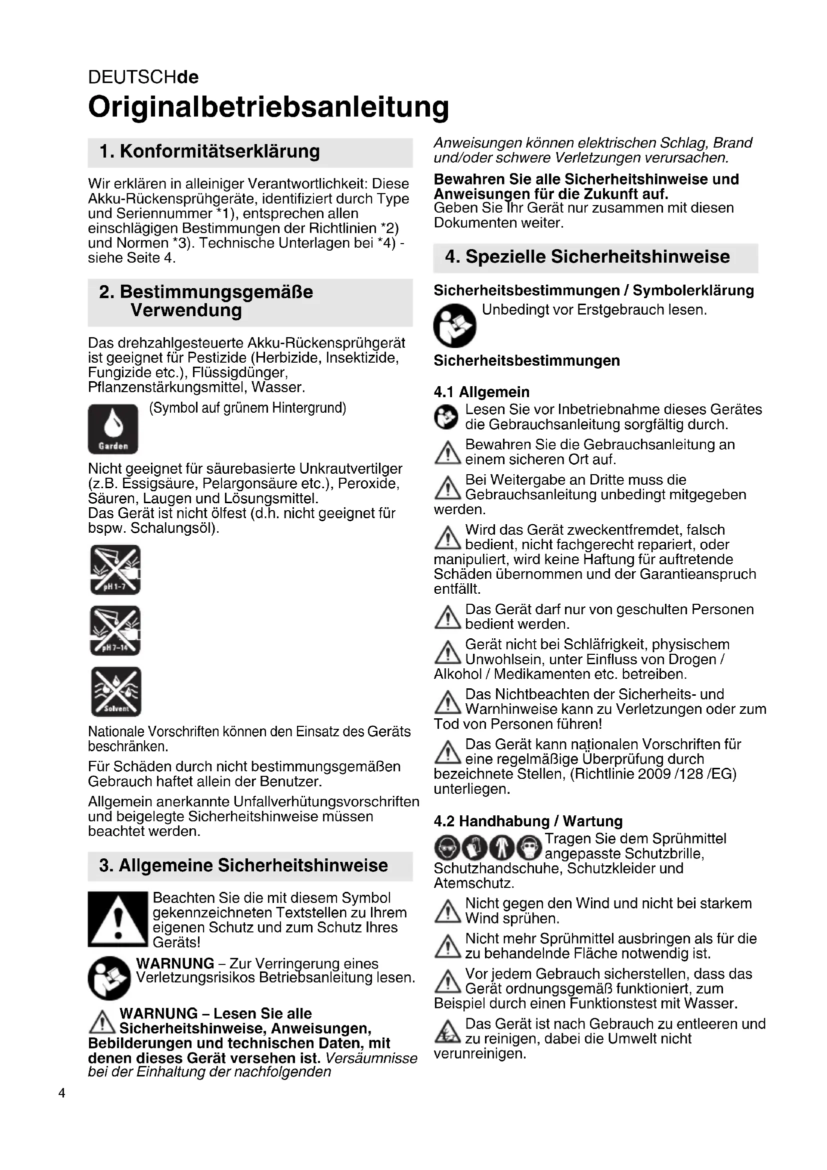 Originalbetriebsanleitung Wir erklären in alleiniger Verantwortlichkeit: Diese Akku-Rückensprühgeräte, identifiziert durch Type und Seriennummer *1), entsprechen allen einschlägigen Bestimmungen der Richtlinien *2) und Normen *3). Technische Unterlagen bei *4) - siehe Seite 4. Das drehzahlgesteuerte Akku-Rückensprühgerät ist geeignet für Pestizide (Herbizide, Insektizide, Fungizide etc.), Flüssigdünger, Pflanzenstärkungsmittel, Wasser. (Symbol auf grünem Hintergrund) Nicht geeignet für säurebasierte Unkrautvertilger (z.B. Essigsäure, Pelargonsäure etc.), Peroxide, Säuren, Laugen und Lösungsmittel. Das Gerät ist nicht ölfest (d.h. nicht geeignet für bspw. Schalungsöl). Nationale Vorschriften können den Einsatz des Geräts beschränken. Für Schäden durch nicht bestimmungsgemäßen Gebrauch haftet allein der Benutzer. Allgemein anerkannte Unfallverhütungsvorschriften und beigelegte Sicherheitshinweise müssen beachtet werden. Beachten Sie die mit diesem Symbol gekennzeichneten Textstellen zu Ihrem eigenen Schutz und zum Schutz Ihres Geräts! WARNUNG – Zur Verringerung eines Verletzungsrisikos Betriebsanleitung lesen. WARNUNG – Lesen Sie alle Sicherheitshinweise, Anweisungen, Bebilderungen und technischen Daten, mit denen dieses Gerät versehen ist. Versäumnisse bei der Einhaltung der nachfolgenden Anweisungen können elektrischen Schlag, Brand und/oder schwere Verletzungen verursachen. Bewahren Sie alle Sicherheitshinweise und Anweisungen für die Zukunft auf. Geben Sie Ihr Gerät nur zusammen mit diesen Dokumenten weiter. Sicherheitsbestimmungen / Symbolerklärung Unbedingt vor Erstgebrauch lesen. Sicherheitsbestimmungen